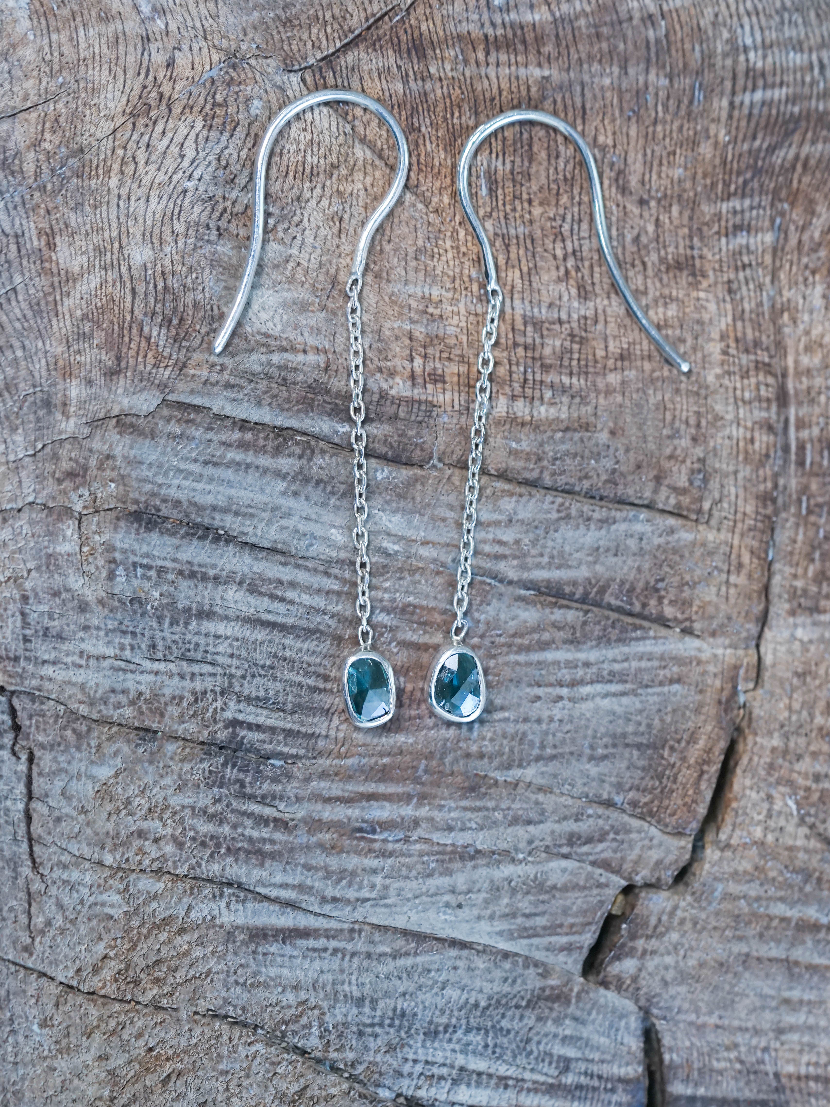 Each earring features a translucent rose cut blue diamond, irradiated for color, sourced from Botswana, and bezel set in recycled sterling silver. The open two sided setting lets the light in from all angles.