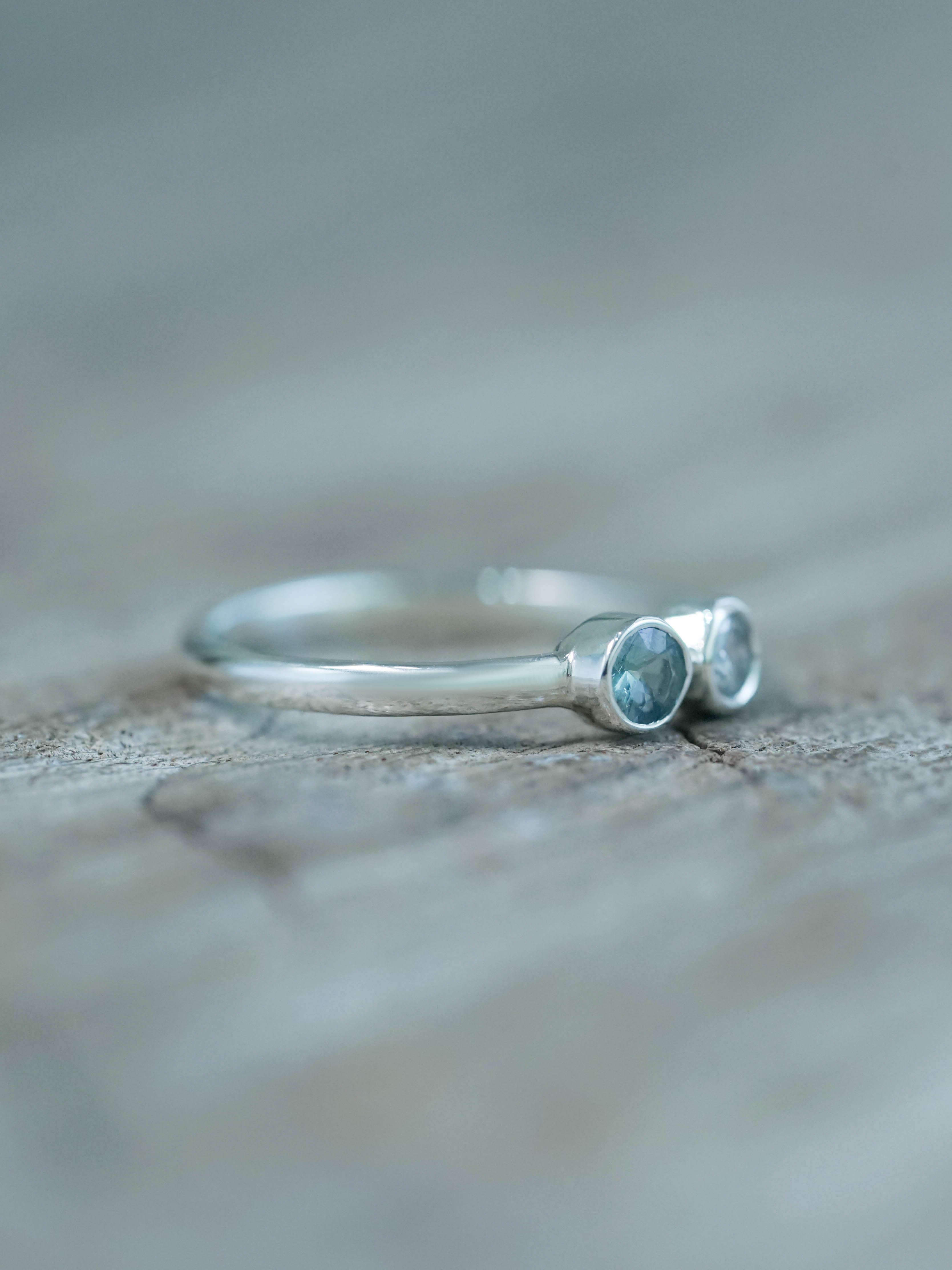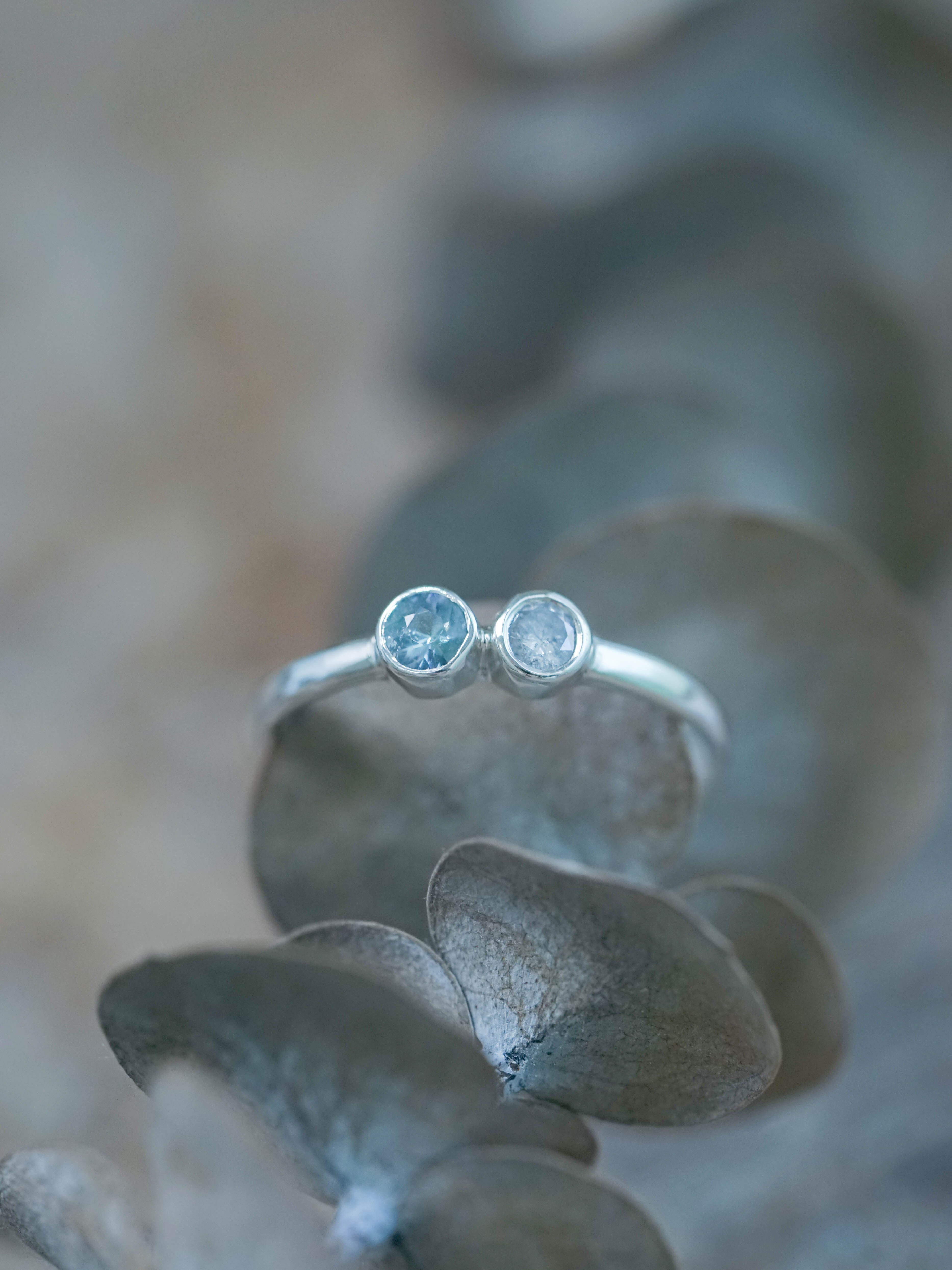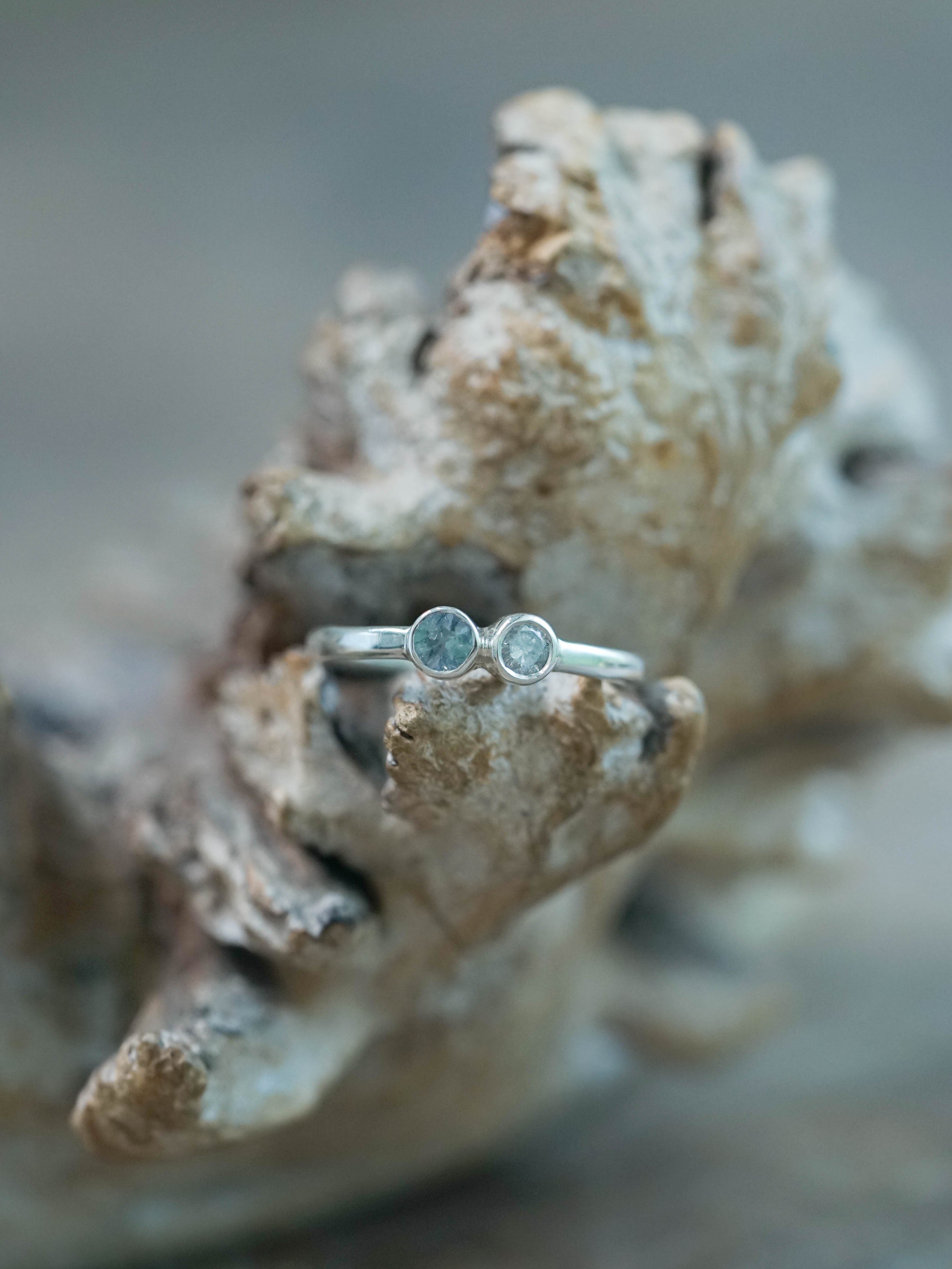 Set in recycled sterling silver, both gems are wrapped in a minimal bezel on a thin band. The look is mellow, but with a magnetic energy.