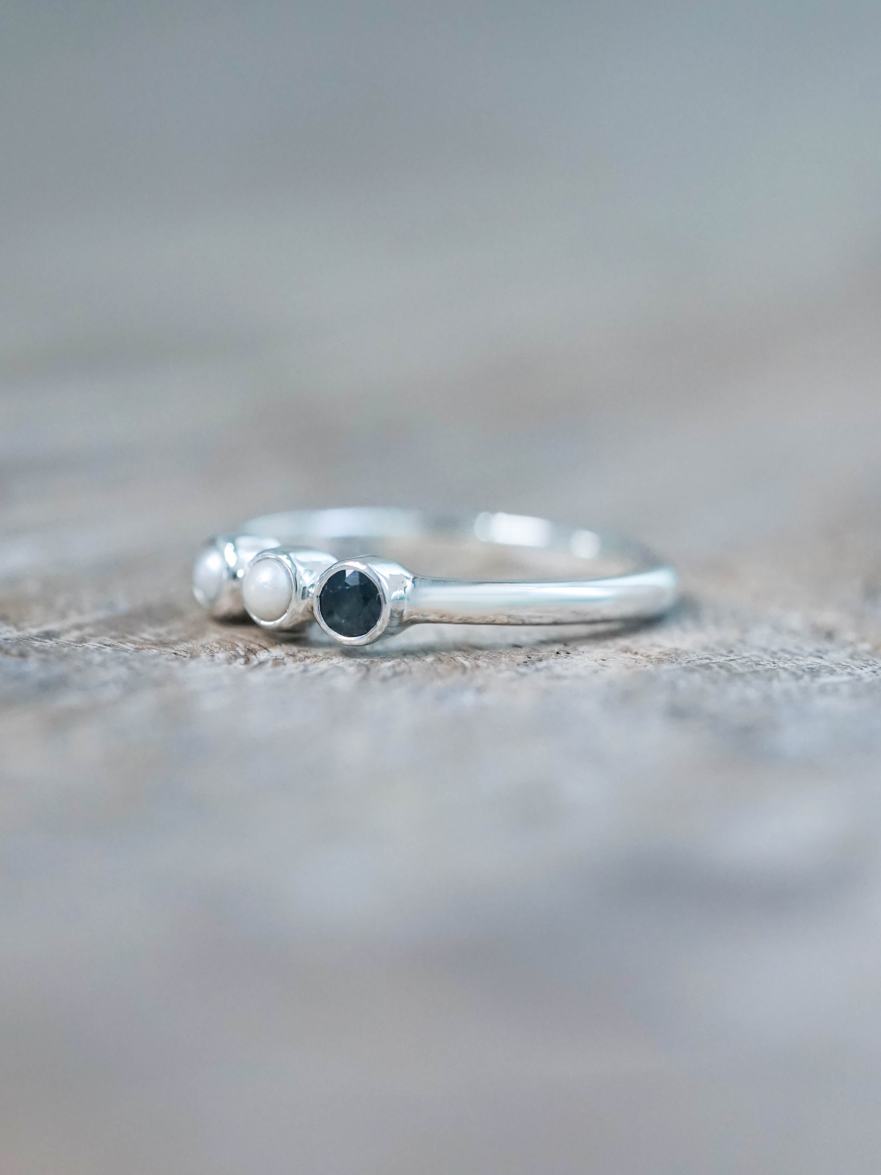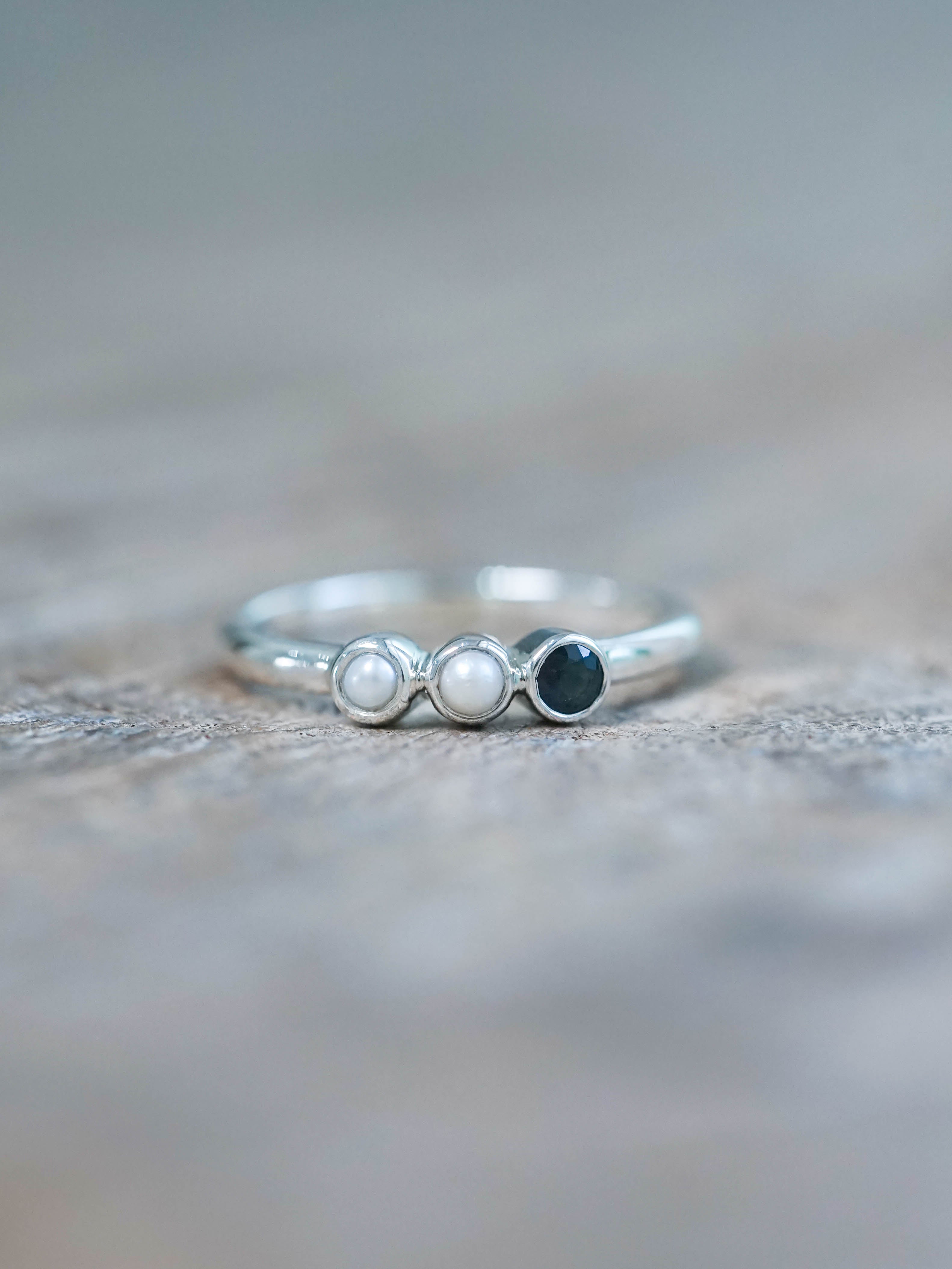Slip this sapphire and pearl ring on and you’ll feel the cool silver, the soft pearls, and that one sapphire that catches the light (and trouble). No big declarations. Just a trio of gems that gets you, every mood and of shade you.