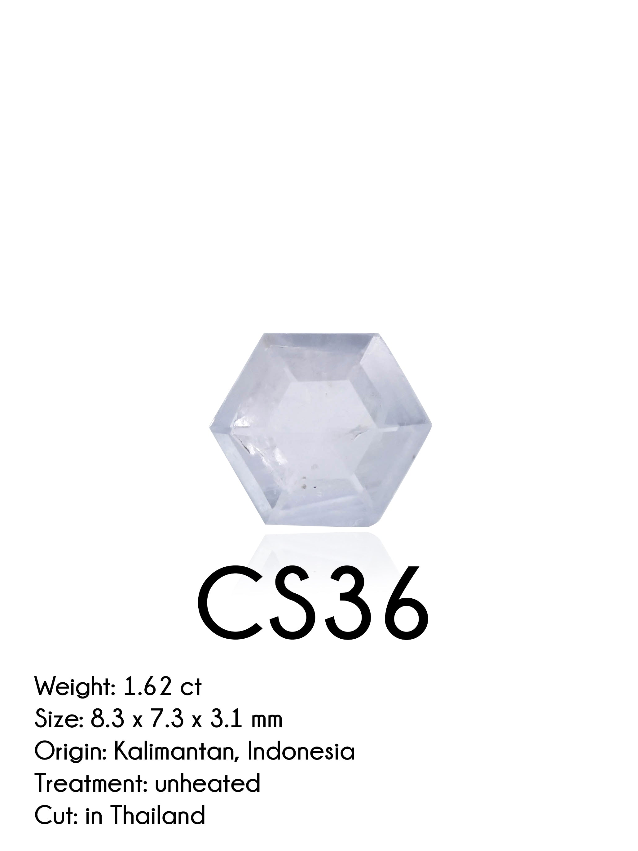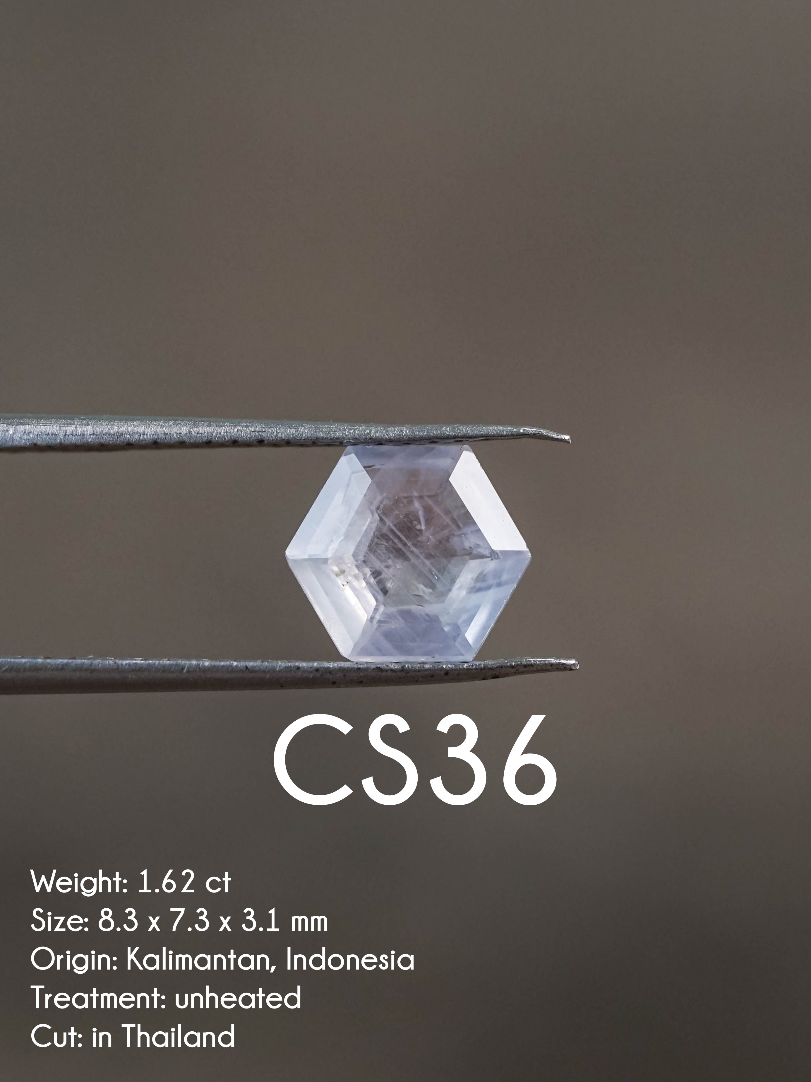 CS36 - 1.62 ct hexagon cut lavender sapphire from Central Kalimantan, Indonesia. Ethically sourced from artisanal miners from an indigenous Dayak tribe who receive fair pay. Some silk inclusions, low profile gemstone. Cut in Thailand from a 3.78 ct raw sapphire. Unheated, untreated. Measures 8.3 x 7.3 x 3.1 mm.