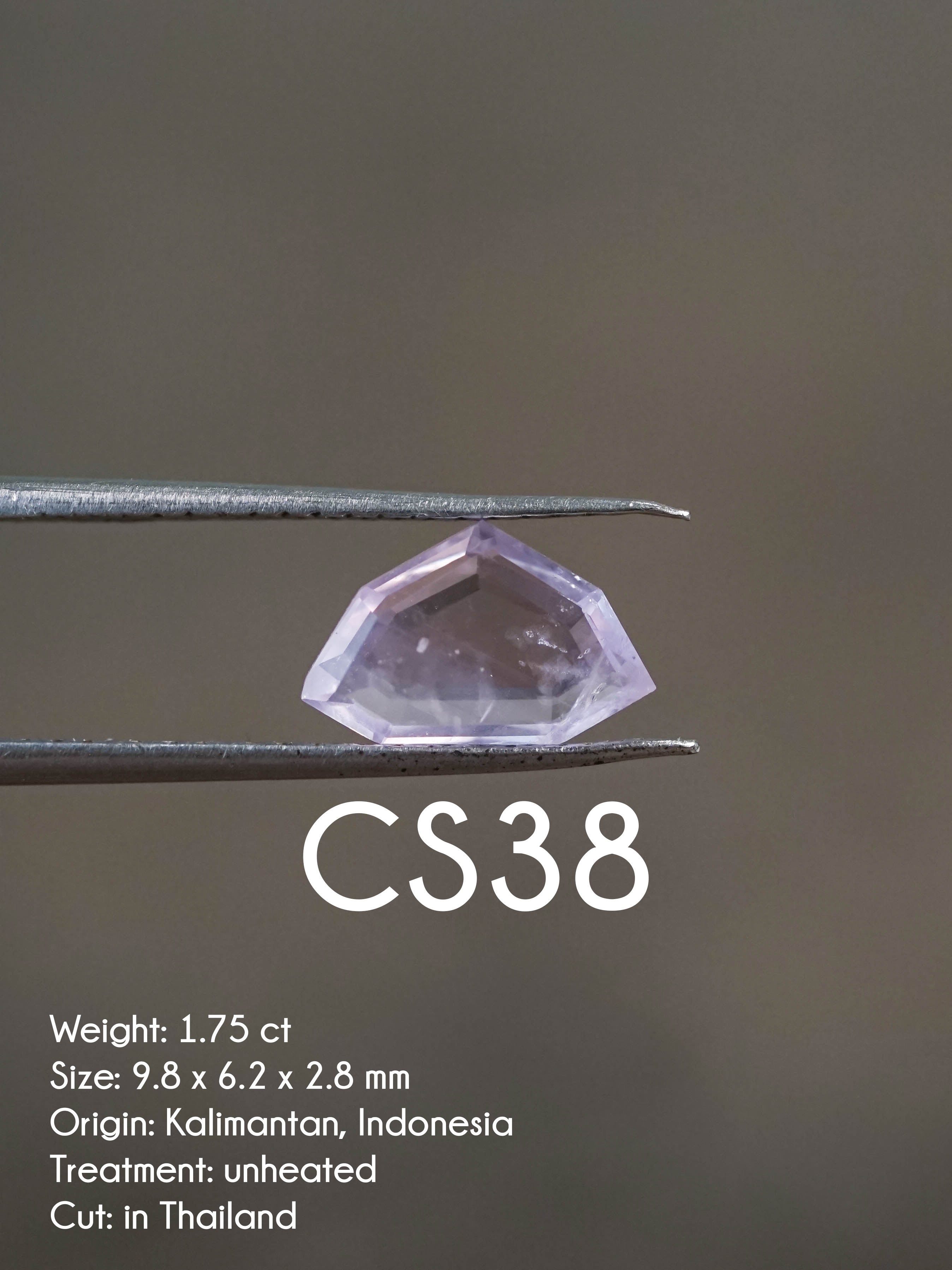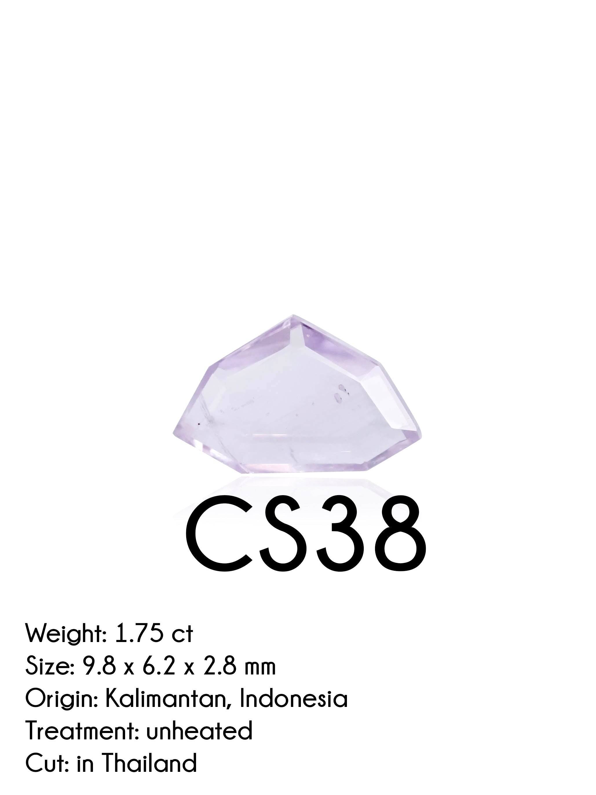 CS38 - 1.75 ct custom cut lavender purple sapphire from Central Kalimantan, Indonesia. Ethically sourced from artisanal miners from an indigenous Dayak tribe who receive fair pay. The raw sapphire was a 3.85 ct chunk. Included, low profile custom cut in Thailand. Unheated, untreated. Measures 9.8 x 6.2 x 2.8 mm.