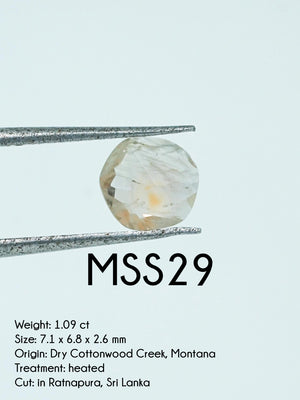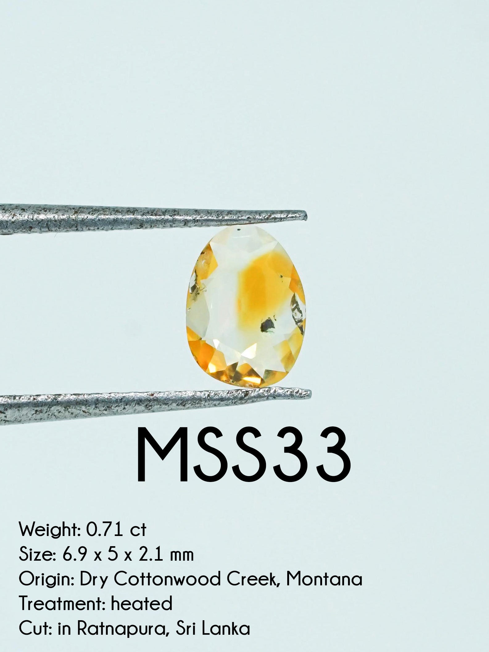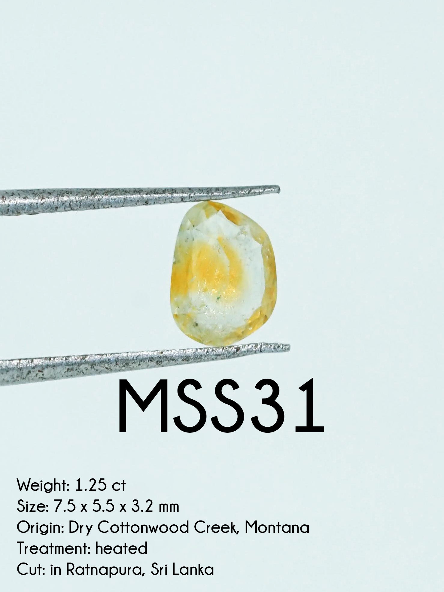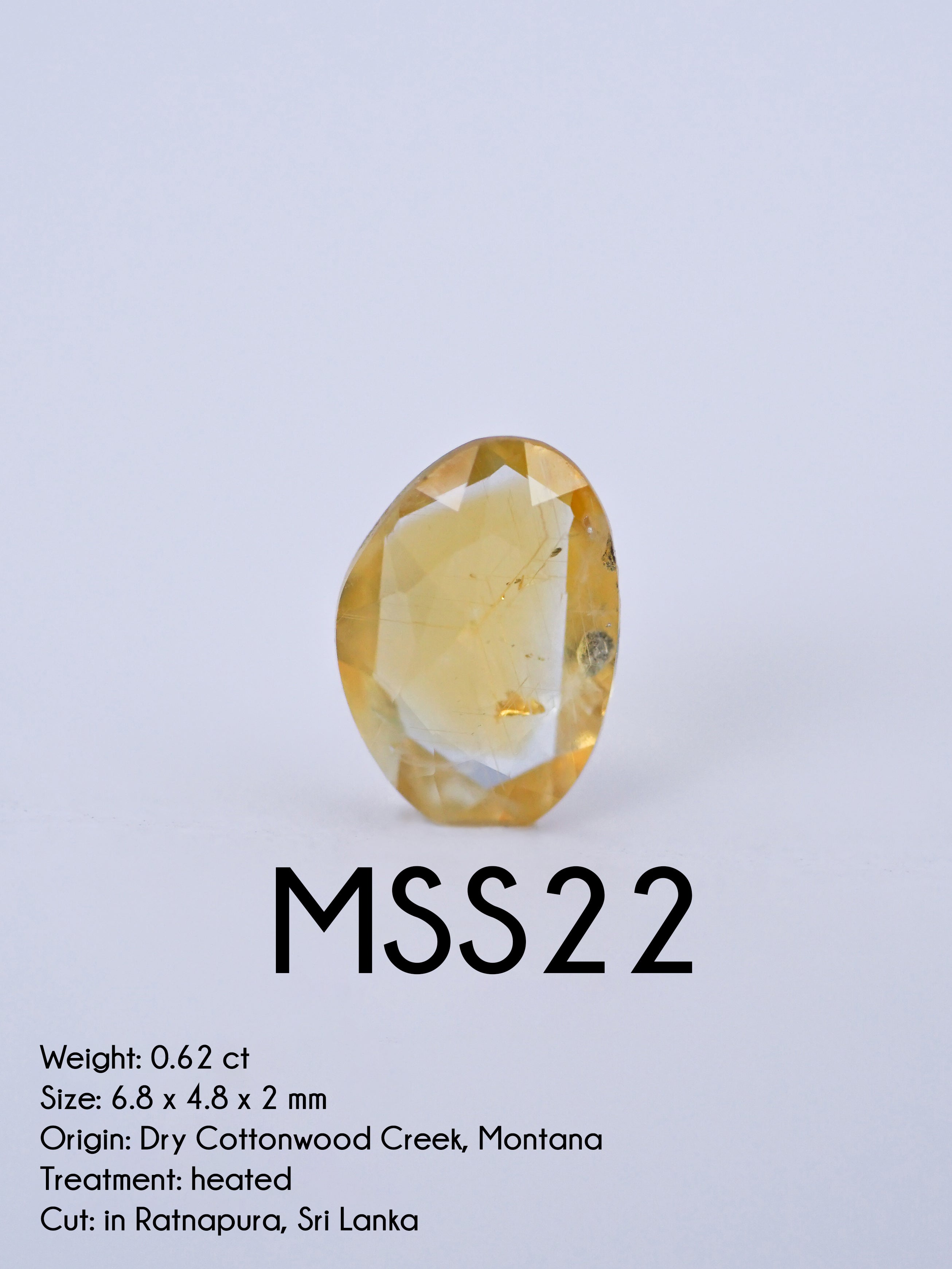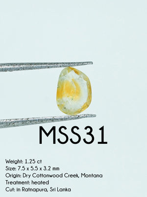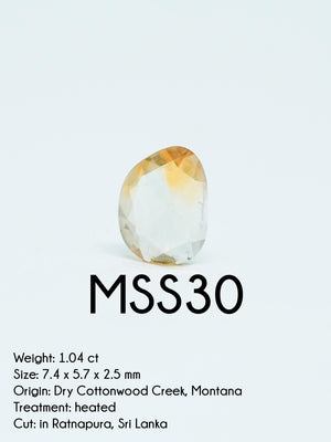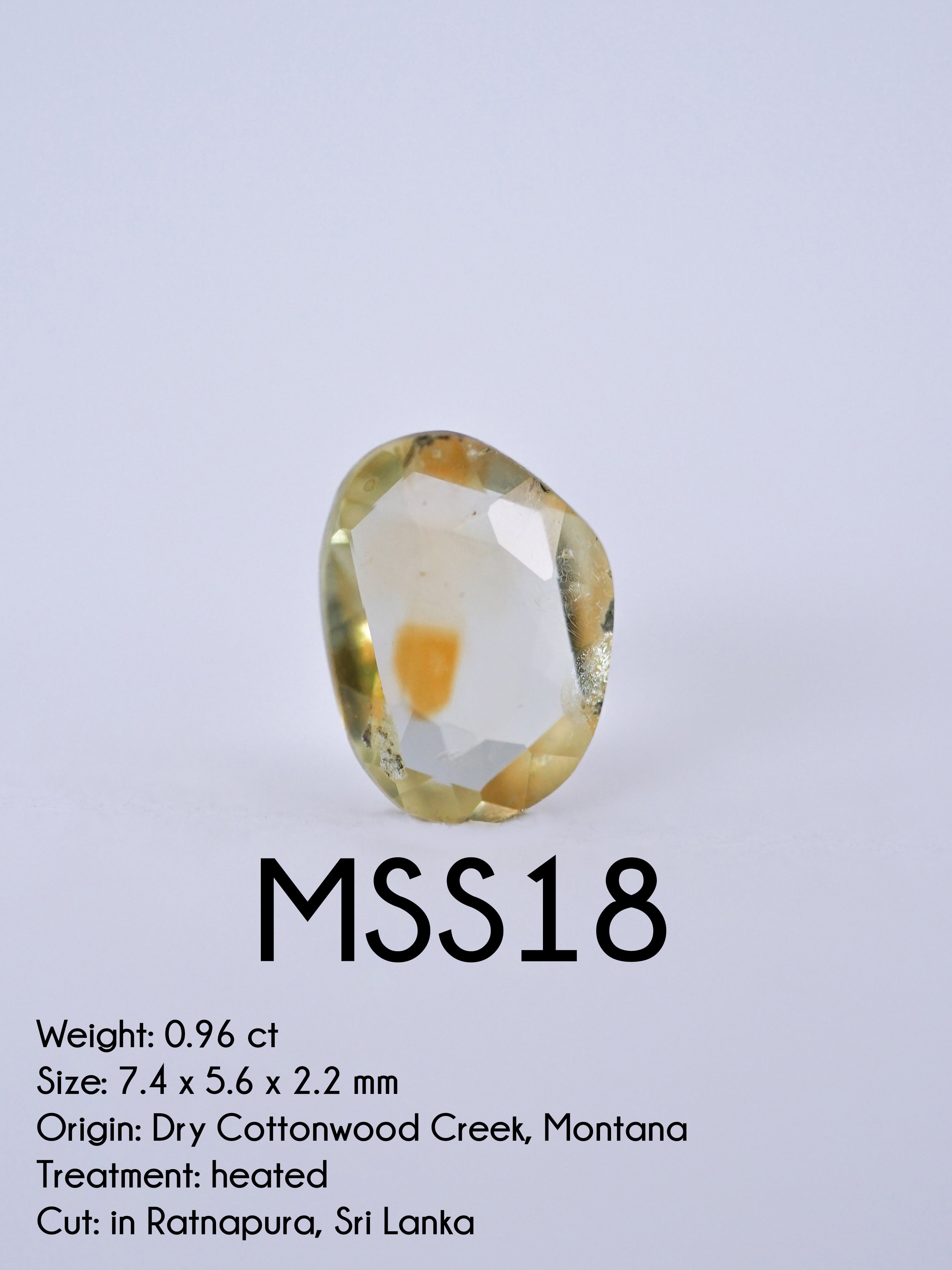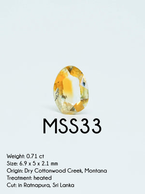 • MSS33 - 0.71 ct freeform egg shaped Montana sapphire. Very pale yellow with warm orange sun spots, included. Mined in Dry Cottonwood Creek, Montana. Heated for color. Cut in Ratnapura, Sri Lanka. Measures 6.9 x 5 x 2.1 mm