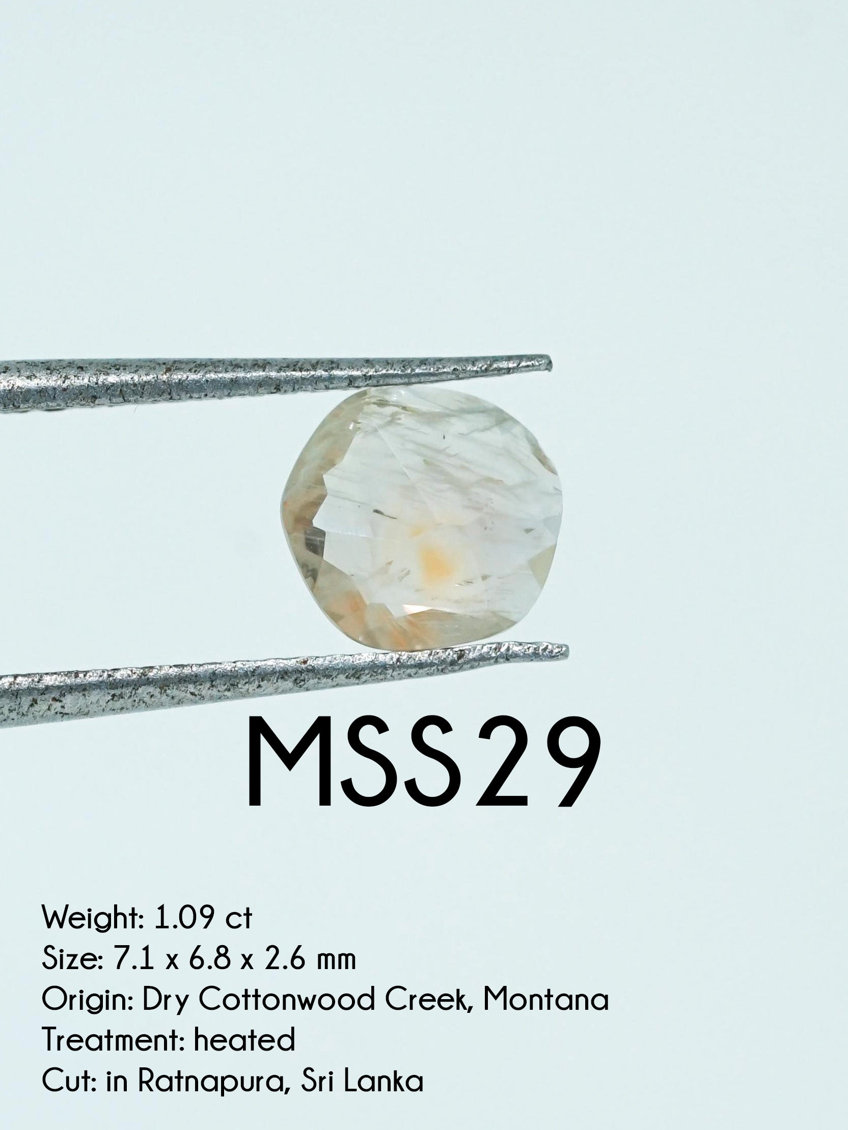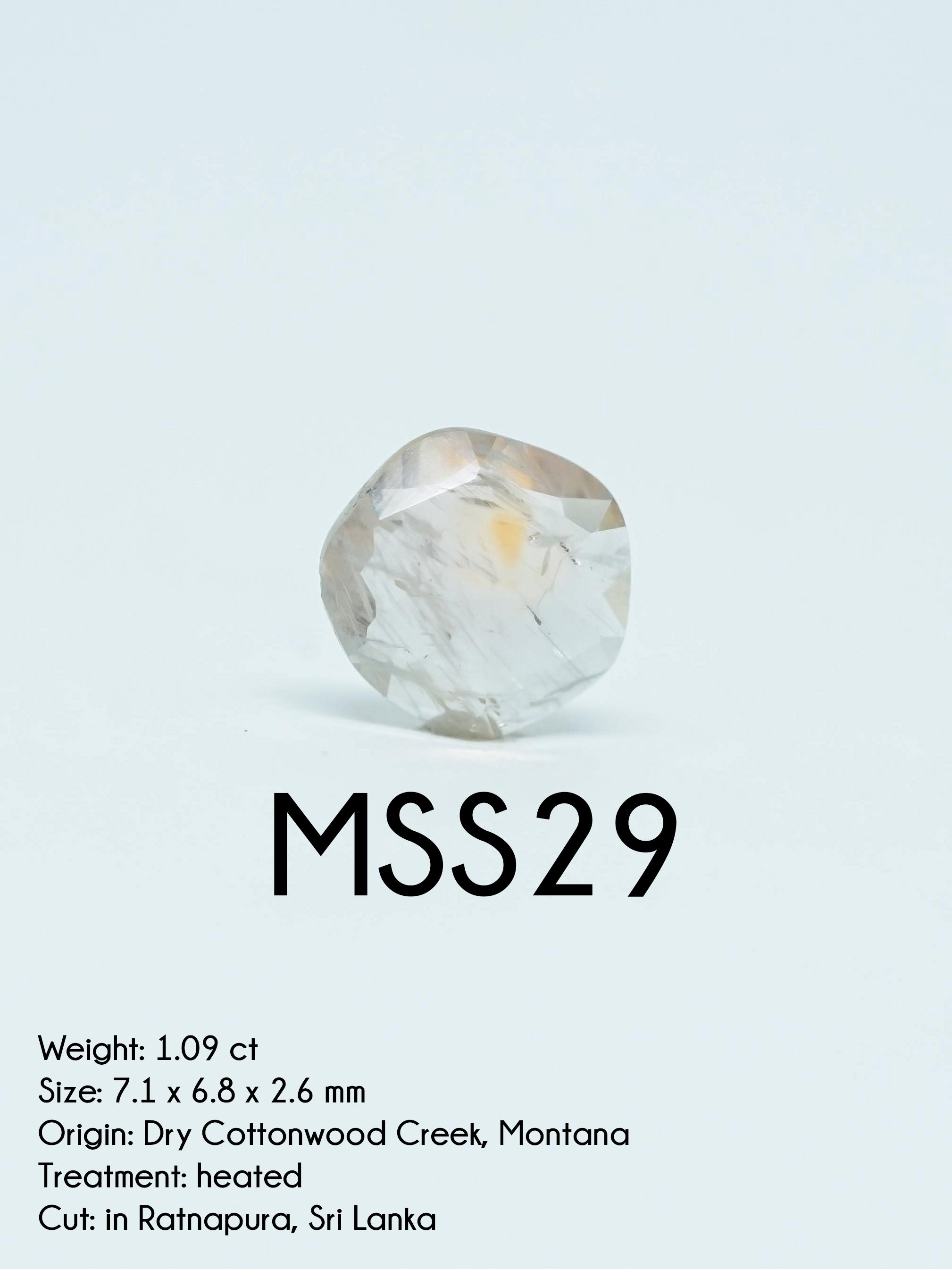 • MSS29 - 1.09 ct freeform rose cut Montana sapphire with a warm yellow sunspot. This stone looks amazing in person, the silk and inclusions give it a rainbow iridescent shimmer. Mined in Dry Cottonwood Creek, Montana. Heated for color. Cut in Ratnapura, Sri Lanka. Measures 7.1 x 6.8 x 2.6 mm