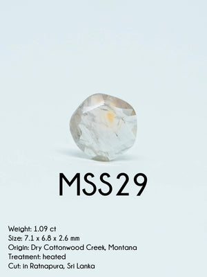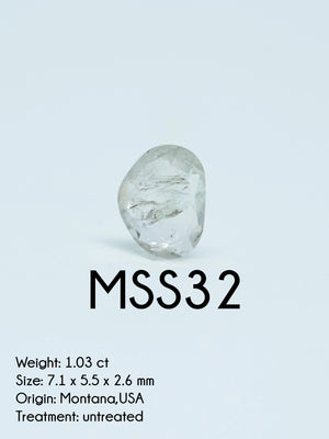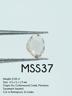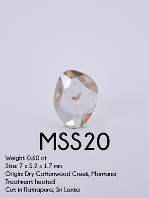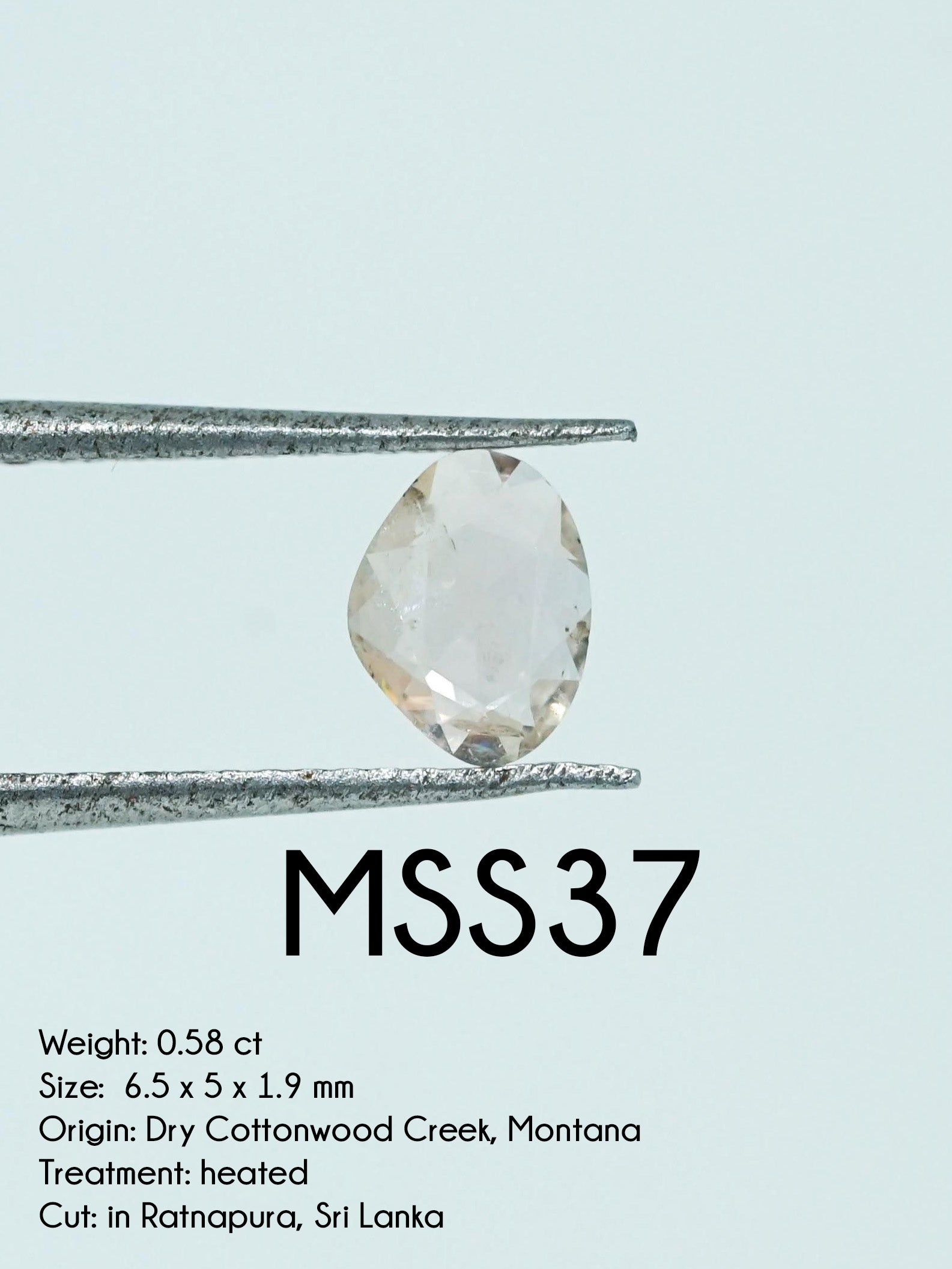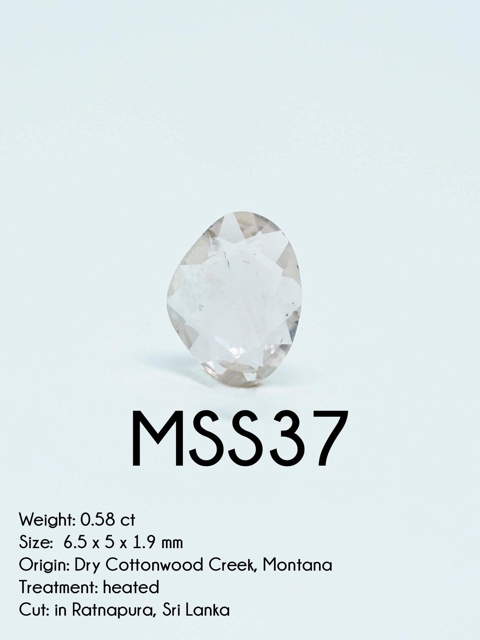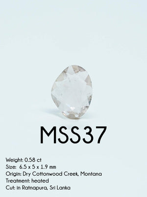 • MSS37 - 0.58 ct freeform Montana sapphire. It’s translucent white color makes this a great diamond alternative. Mined in Dry Cottonwood Creek, Montana. Heated for color. Cut in Ratnapura, Sri Lanka. Measures 6.5 x 5 x 1.9 mm