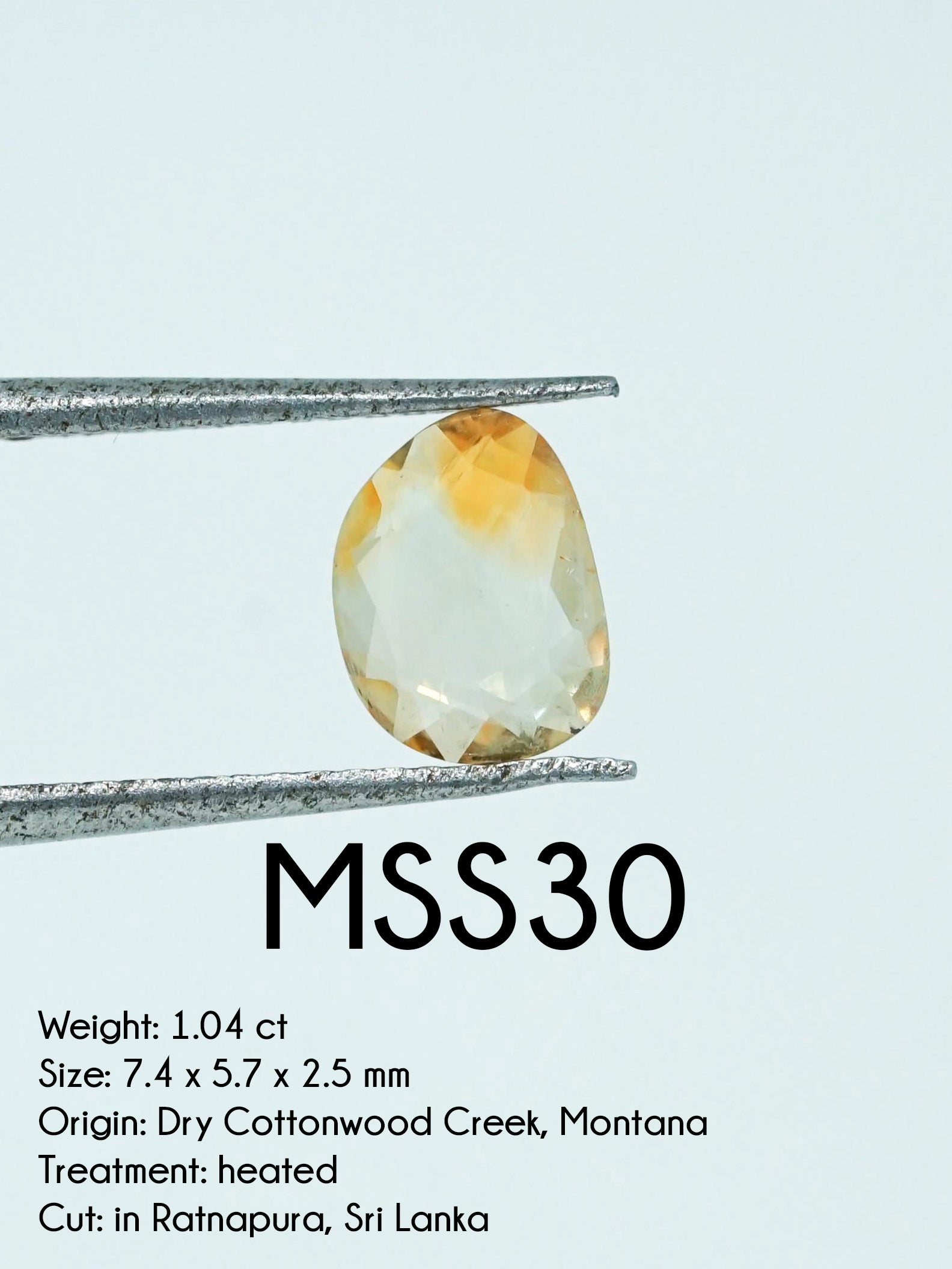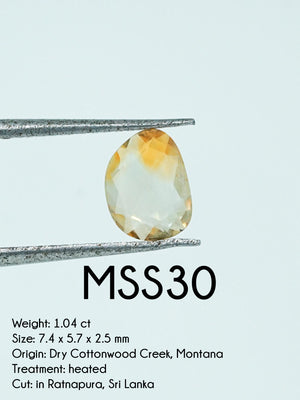 • MSS30 - 1.04 ct quirky freeform Montana sapphire that looks like it was dipped in warm orange honey. Mined in Dry Cottonwood Creek, Montana. Heated for color. Cut in Ratnapura, Sri Lanka. Measures 7.4 x 5.7 x 2.5 mm
