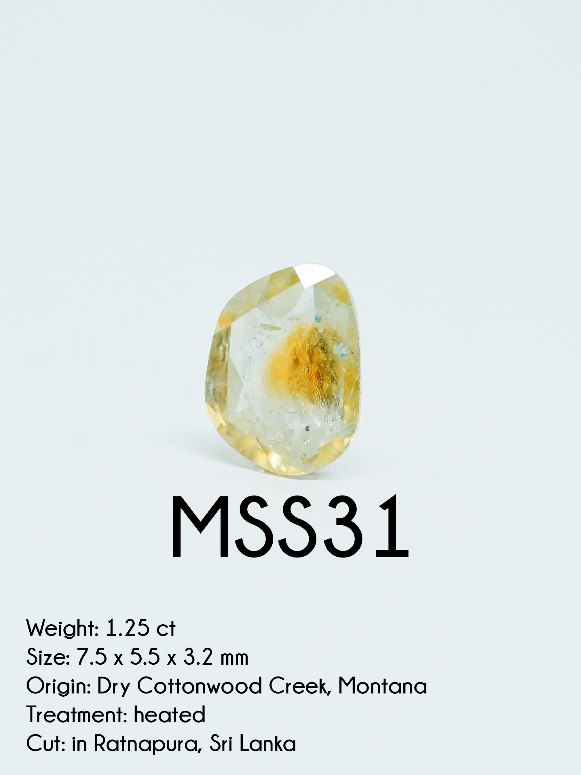 • MSS31 - 1.25 ct heavily included freeform rose cut Montana sapphire in very pale yellow with warm orange sun spots. Mined in Dry Cottonwood Creek, Montana. Heated for color. Cut in Ratnapura, Sri Lanka. Measures 7.5 x 5.5 x 3.2 mm