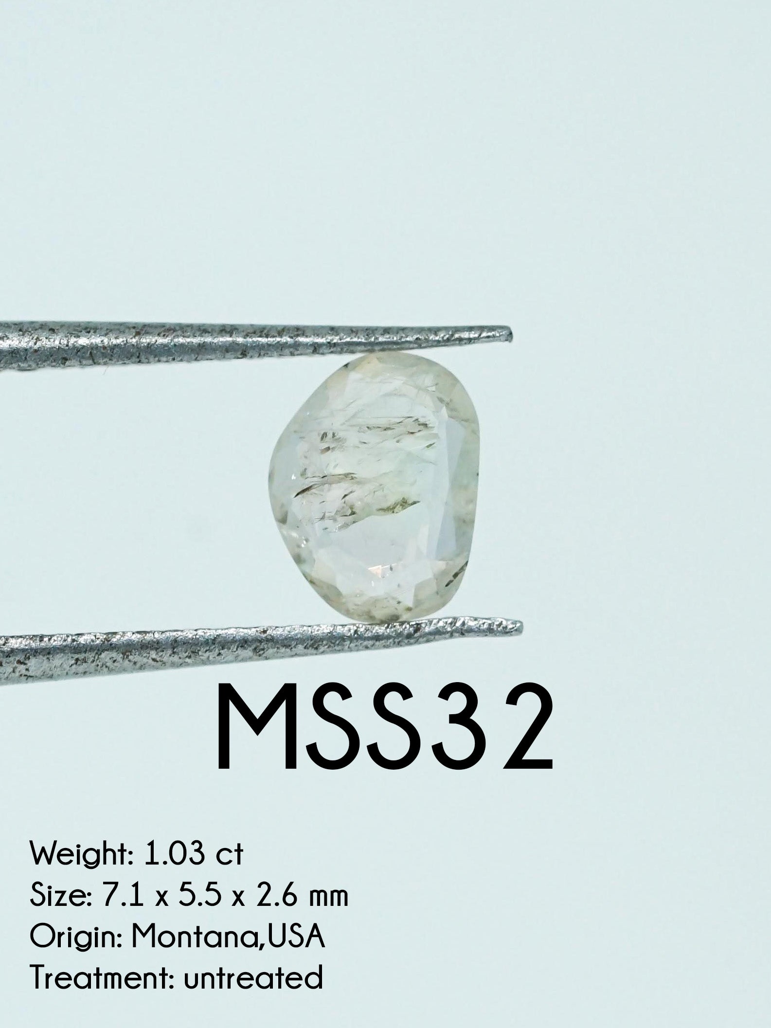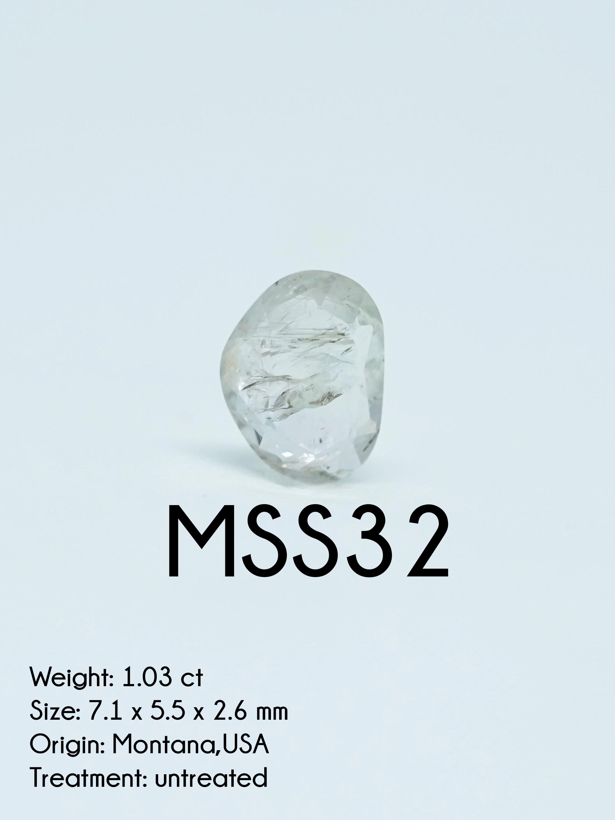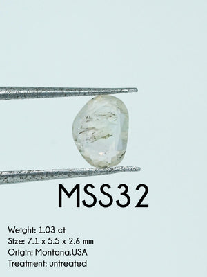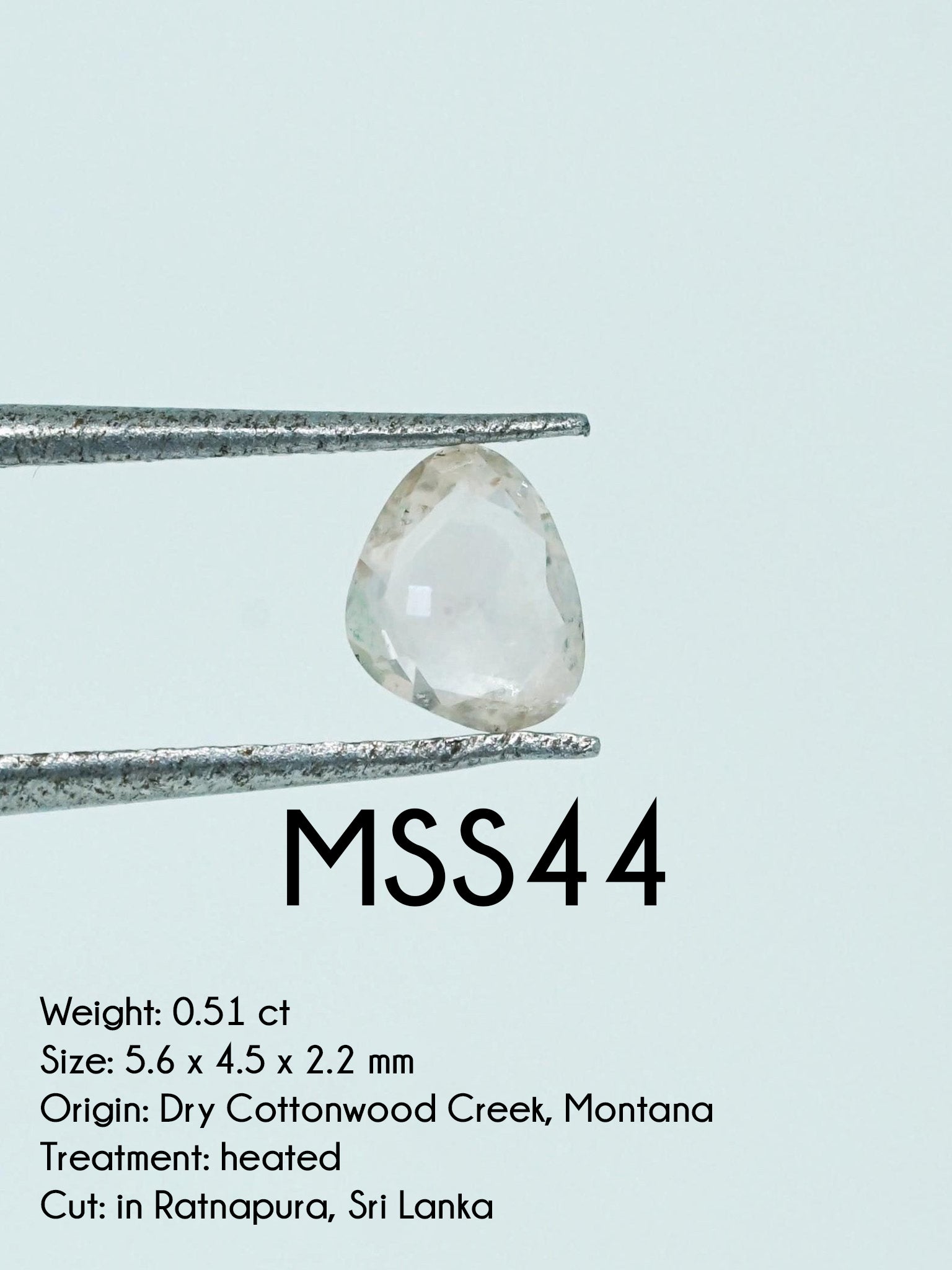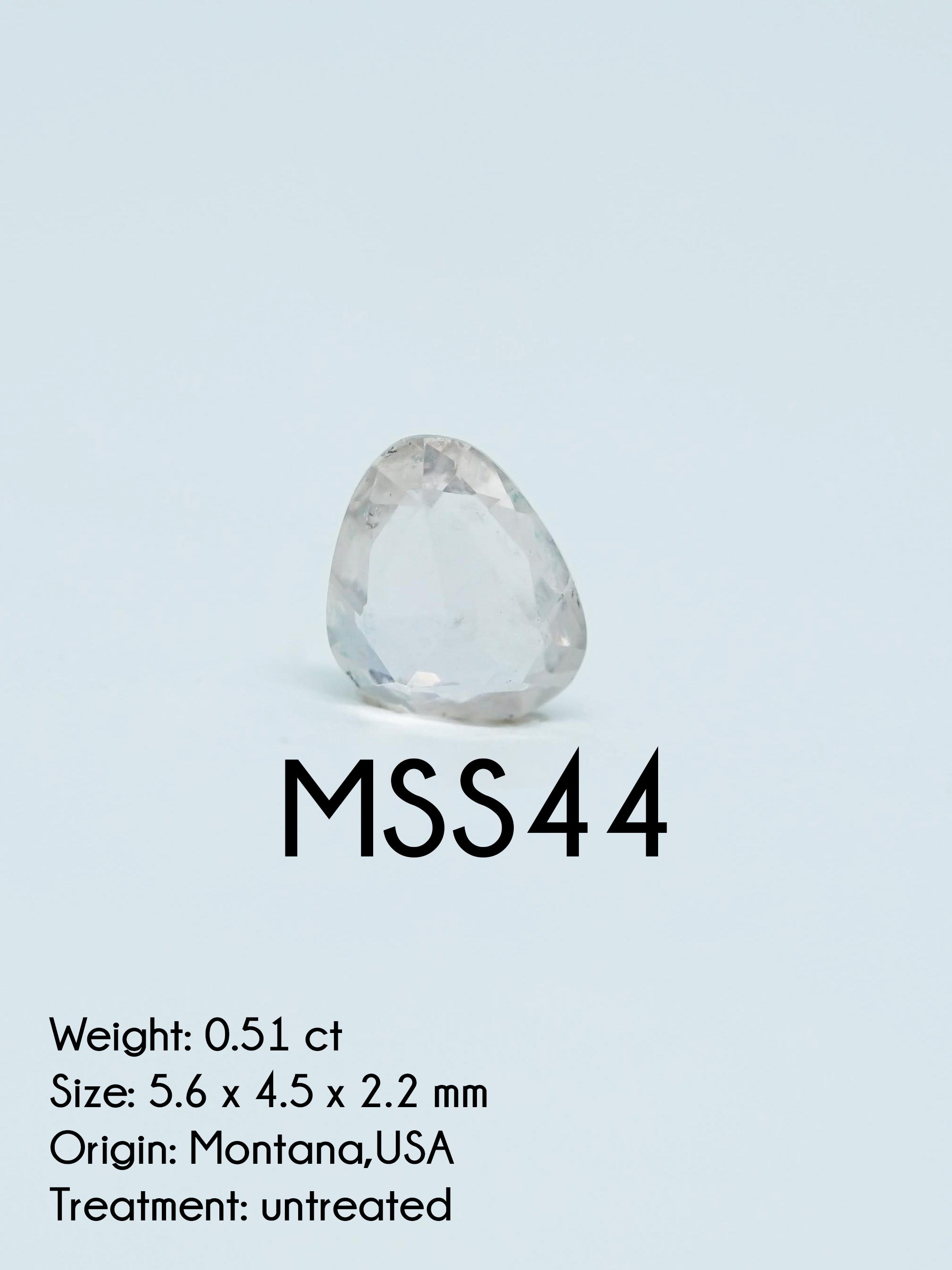 • MSS44 - 0.51 ct little freeform rose cut Montana sapphire. It’s translucent white color makes this sapphire an excellent diamond alternative on a budget. Measures 5.6 x 4.5 x 2.2 mm.