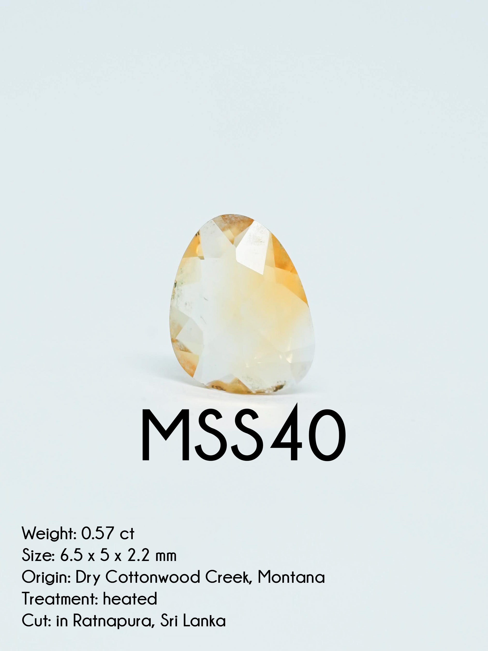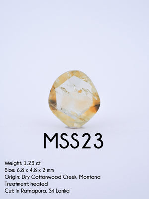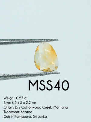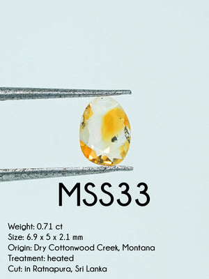 • MSS40 - 0.57 ct sparkly and warm Montana sapphire. Translucent with beautiful warm orange sunspots. Mined in Dry Cottonwood Creek, Montana. Heated for color. Cut in Ratnapura, Sri Lanka. Measures 6.5 x 5 x 2.2 mm