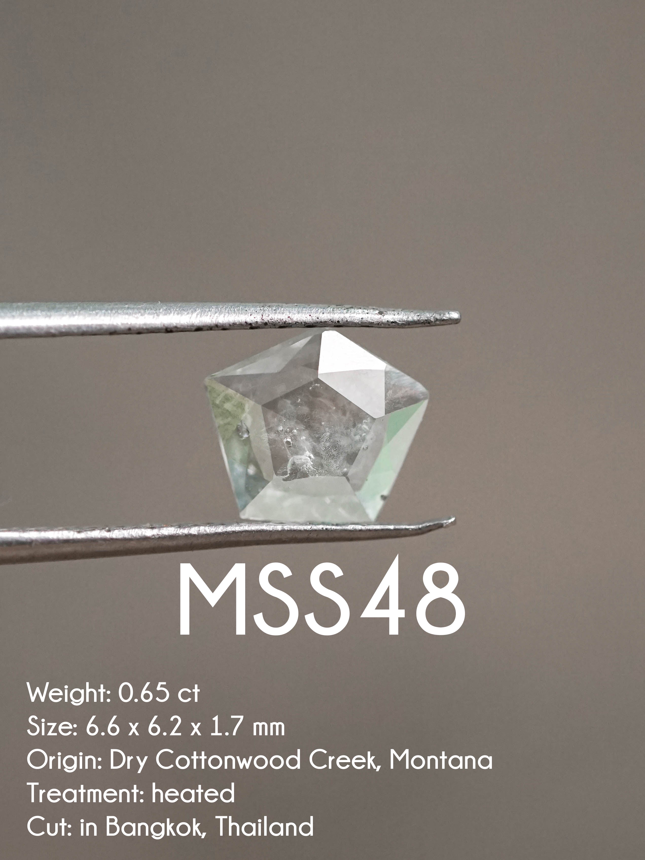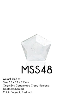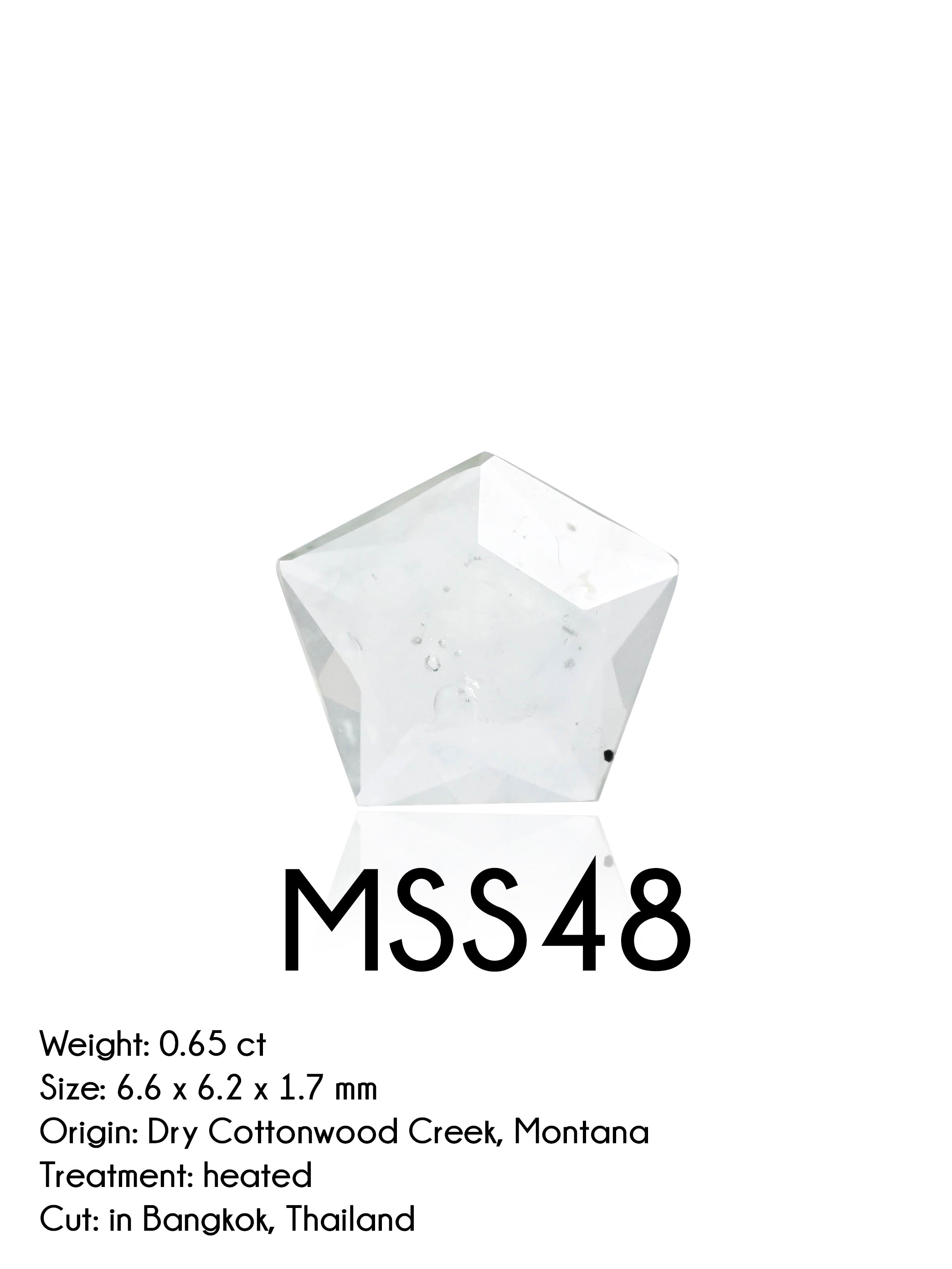 • MSS48 - 0.65 ct little pentagon star shaped white Montana sapphire. Slightly included. Mined in Dry Cottonwood Creek, Montana. Heated for color. Cut in Bangkok, Thailand. Measures 6.6 x 6.2 x 1.7 mm.