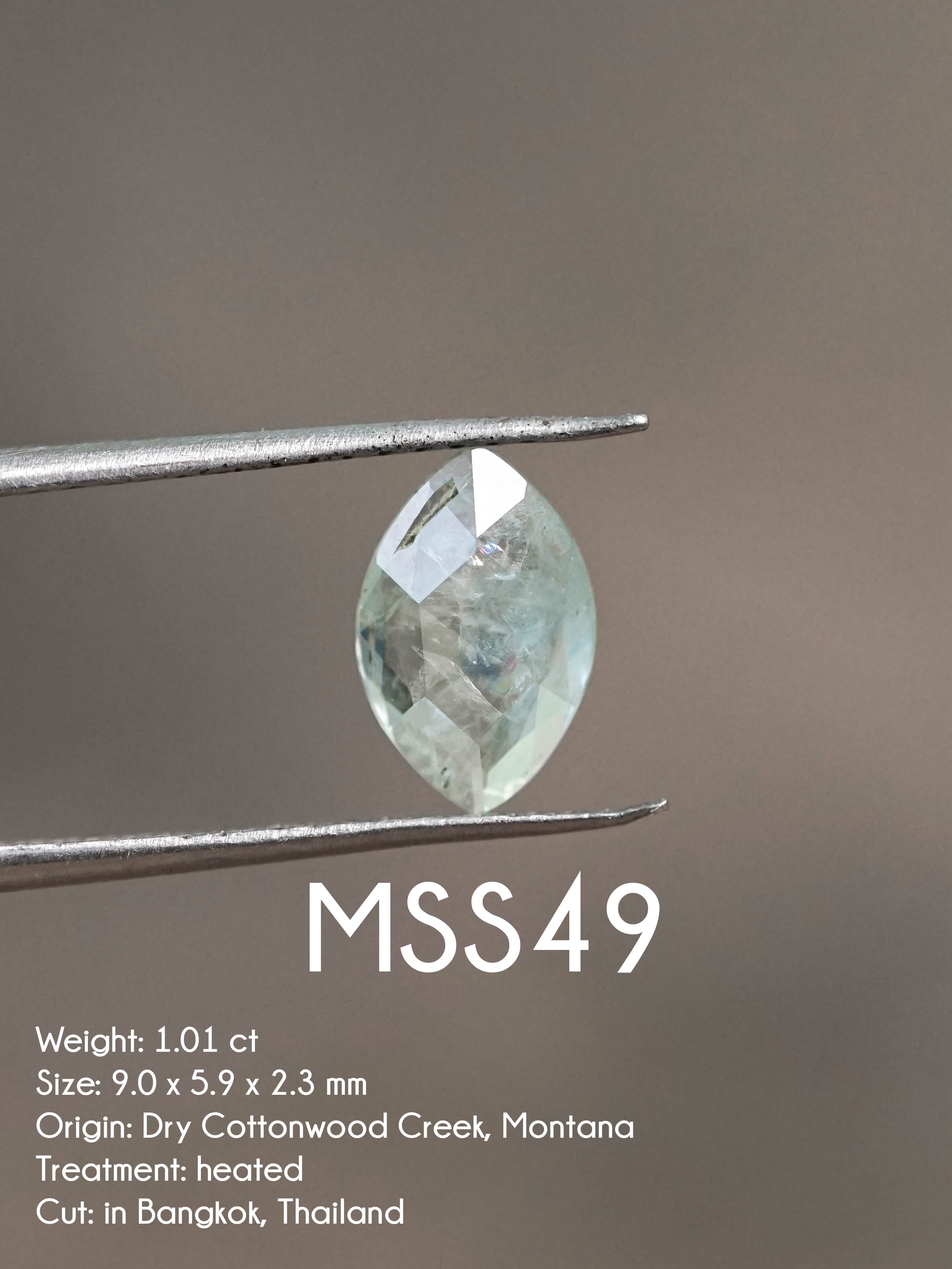• MSS49 - 1.01 ct marquise shaped greenish blue Montana sapphire. Slightly included with a surface pit. Nice size for a ring! Mined in Dry Cottonwood Creek, Montana. Heated for color. Cut in Bangkok, Thailand. Measures 9.0 x 5.9 x 2.3 mm