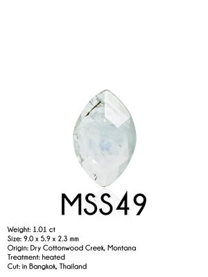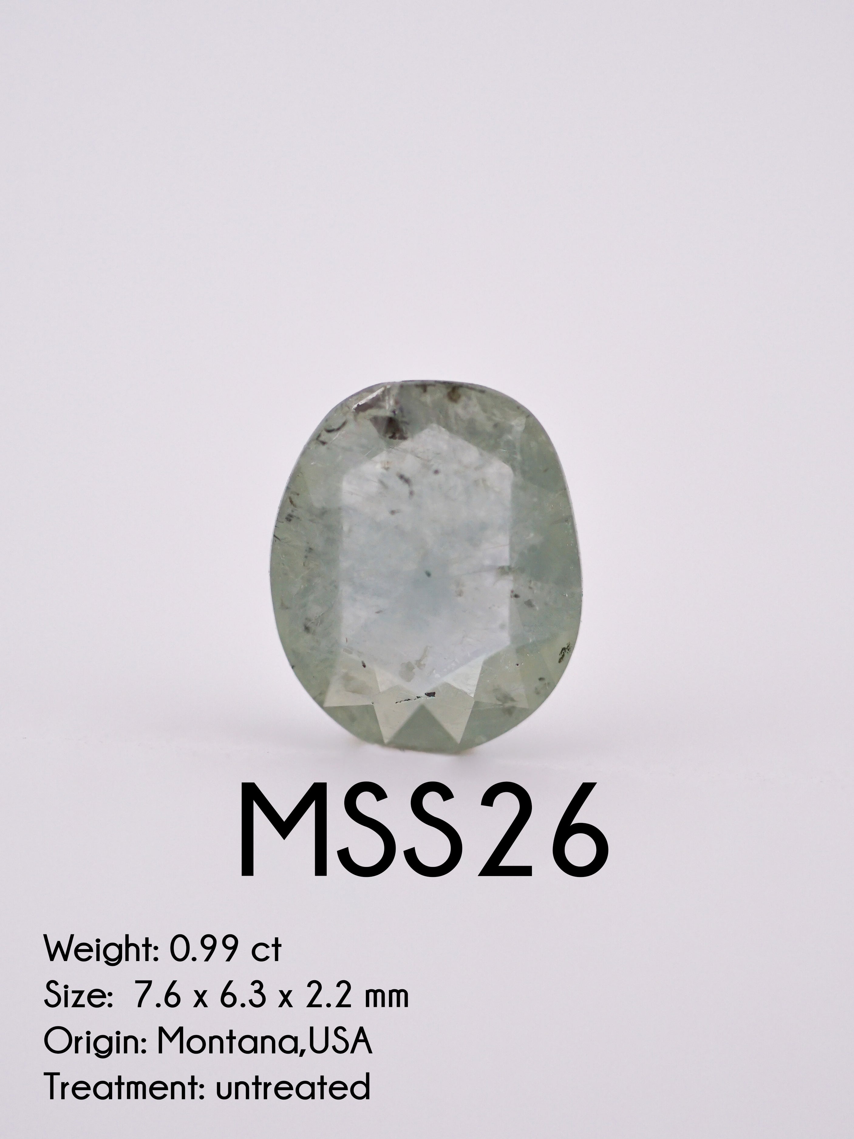 • MSS26 - 0.99 ct, measures 7.6 x 6.3 x 2.2 mm, almost a light, milky aquamarine in color, this sapphires is dreamy and whimsically wistful.