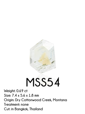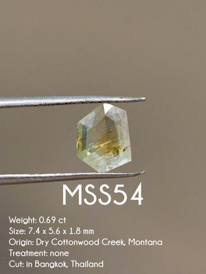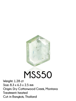 • MSS50 - 1.28 ct asymmetric hexagon cut green Montana sapphire. Mined in Dry Cottonwood Creek, Montana. Heated for color. Cut in Bangkok, Thailand. Measures 8.3 x 6.3 x 2.5 mm.