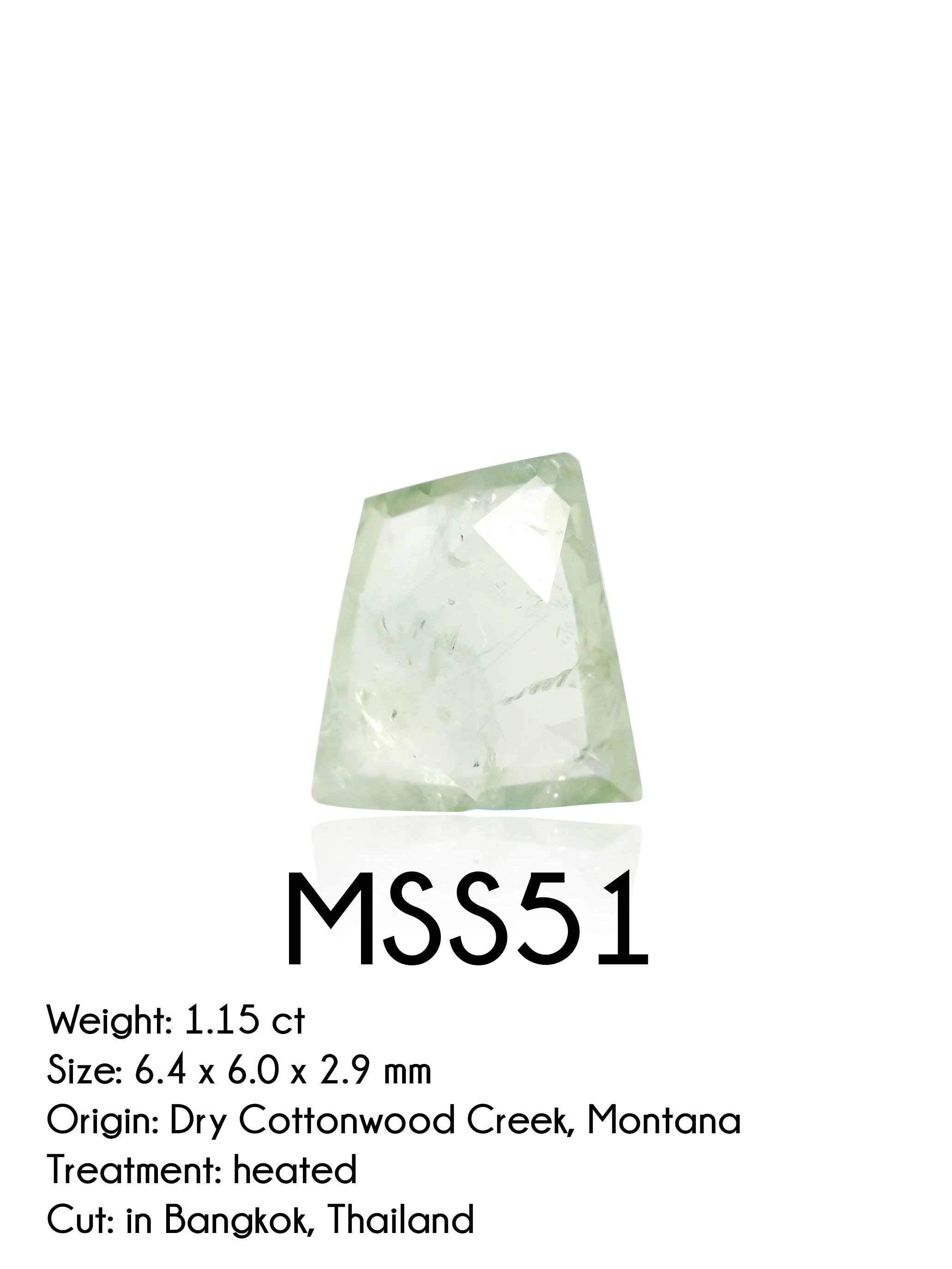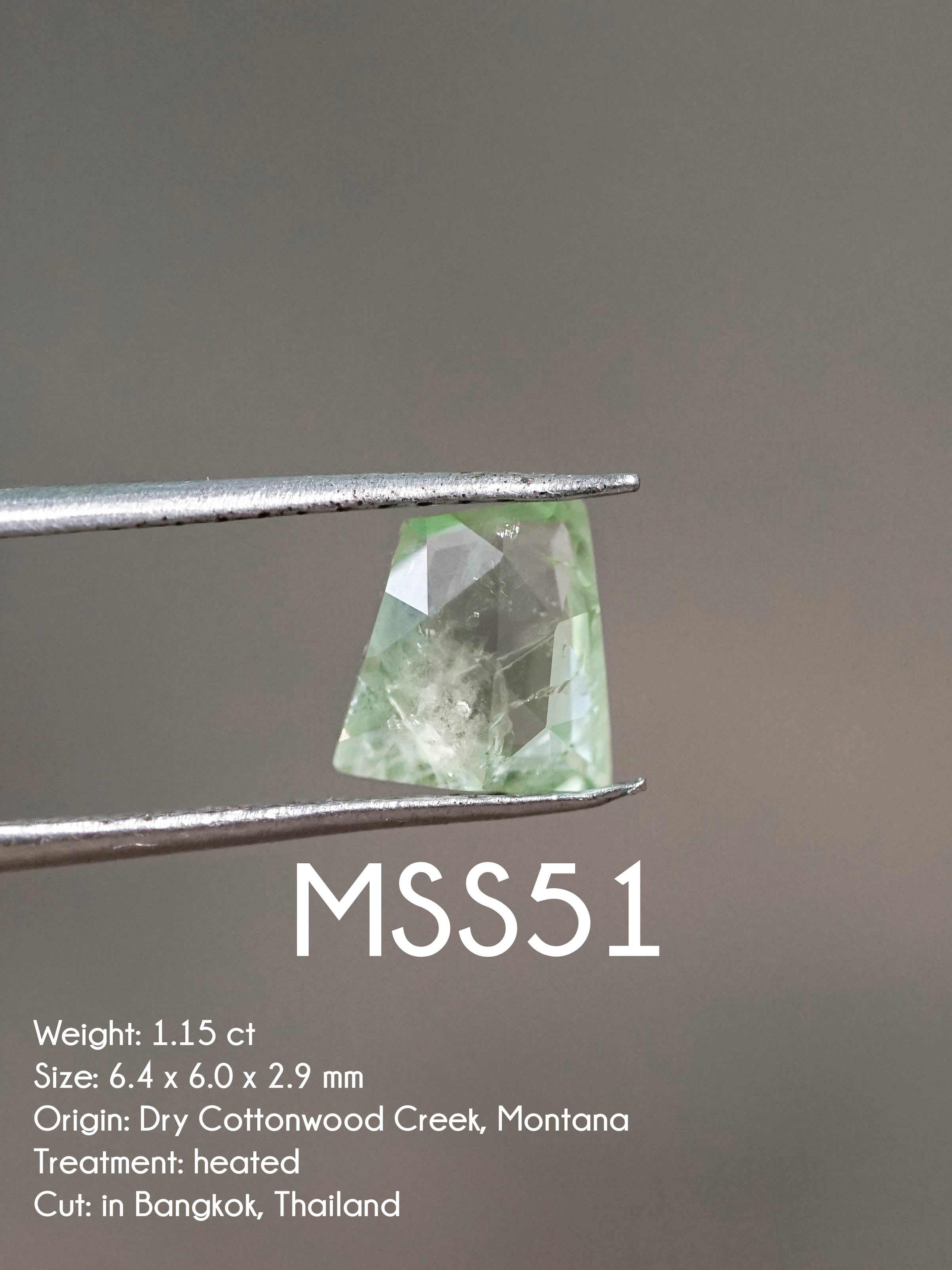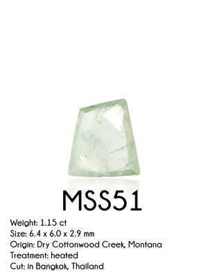 • MSS51 - 1.15 ct geo cut green Montana sapphire. Mined in Dry Cottonwood Creek, Montana. Heated for color. Cut in Bangkok, Thailand. Measures 6.4 x 6.0 x 2.9 mm.
