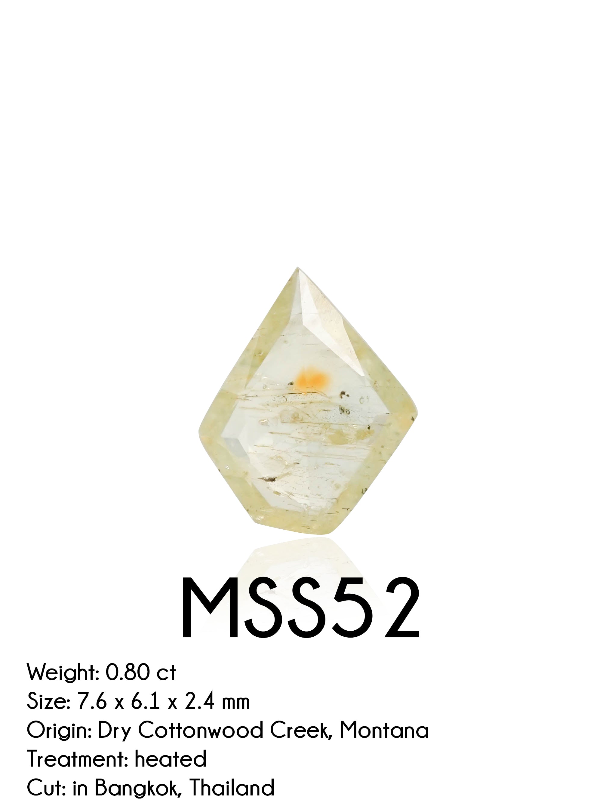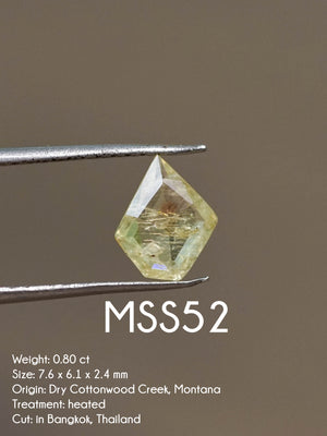 • MSS52 - 0.80 ct yellow rose cut Montana sapphire. Included. This geo cut combined with its pastel yellow make it entirely unique. Mined in Dry Cottonwood Creek, Montana. Heated for color. Cut in Bangkok, Thailand. Measures 7.6 x 6.1 x 2.4 mm.