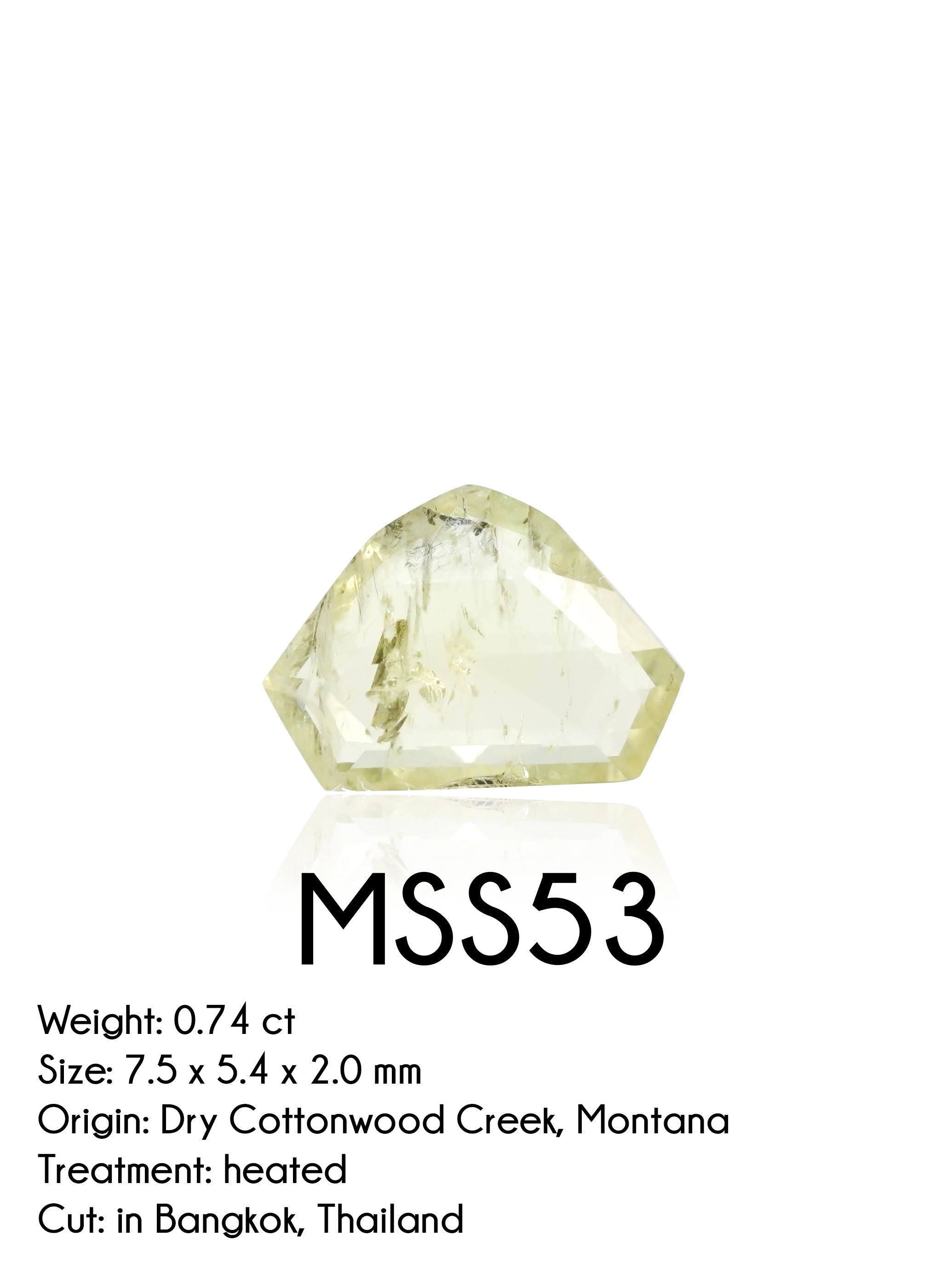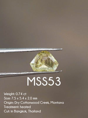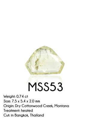 • MSS53 - 0.74 ct shield cut Montana sapphire. Included, yellow color. Mined in Dry Cottonwood Creek, Montana. Heated for color. Cut in Bangkok, Thailand. Measures 7.5 x 5.4 x 2.0 mm.