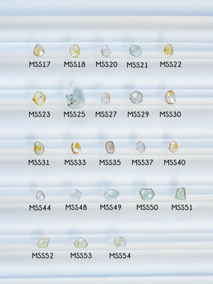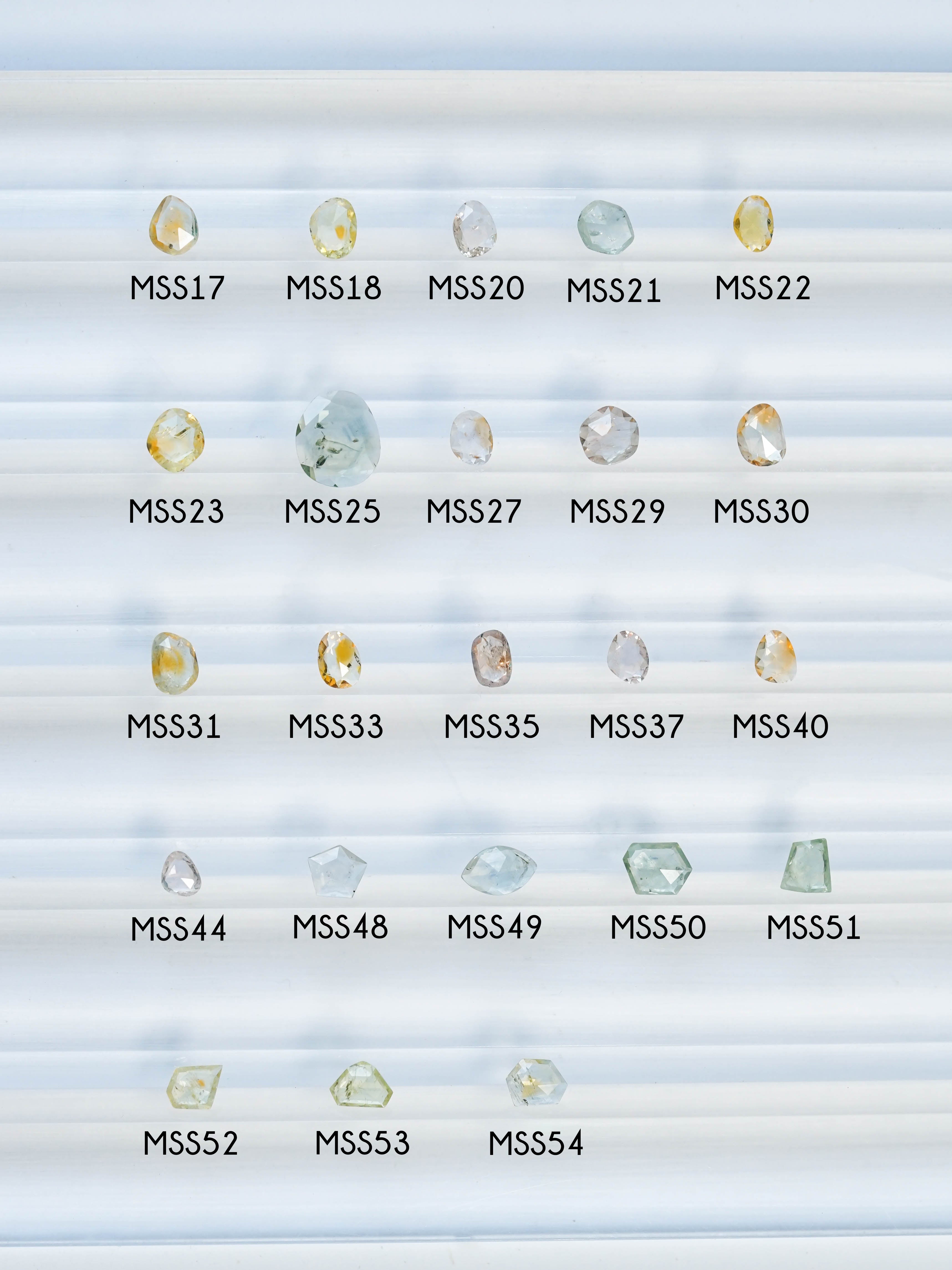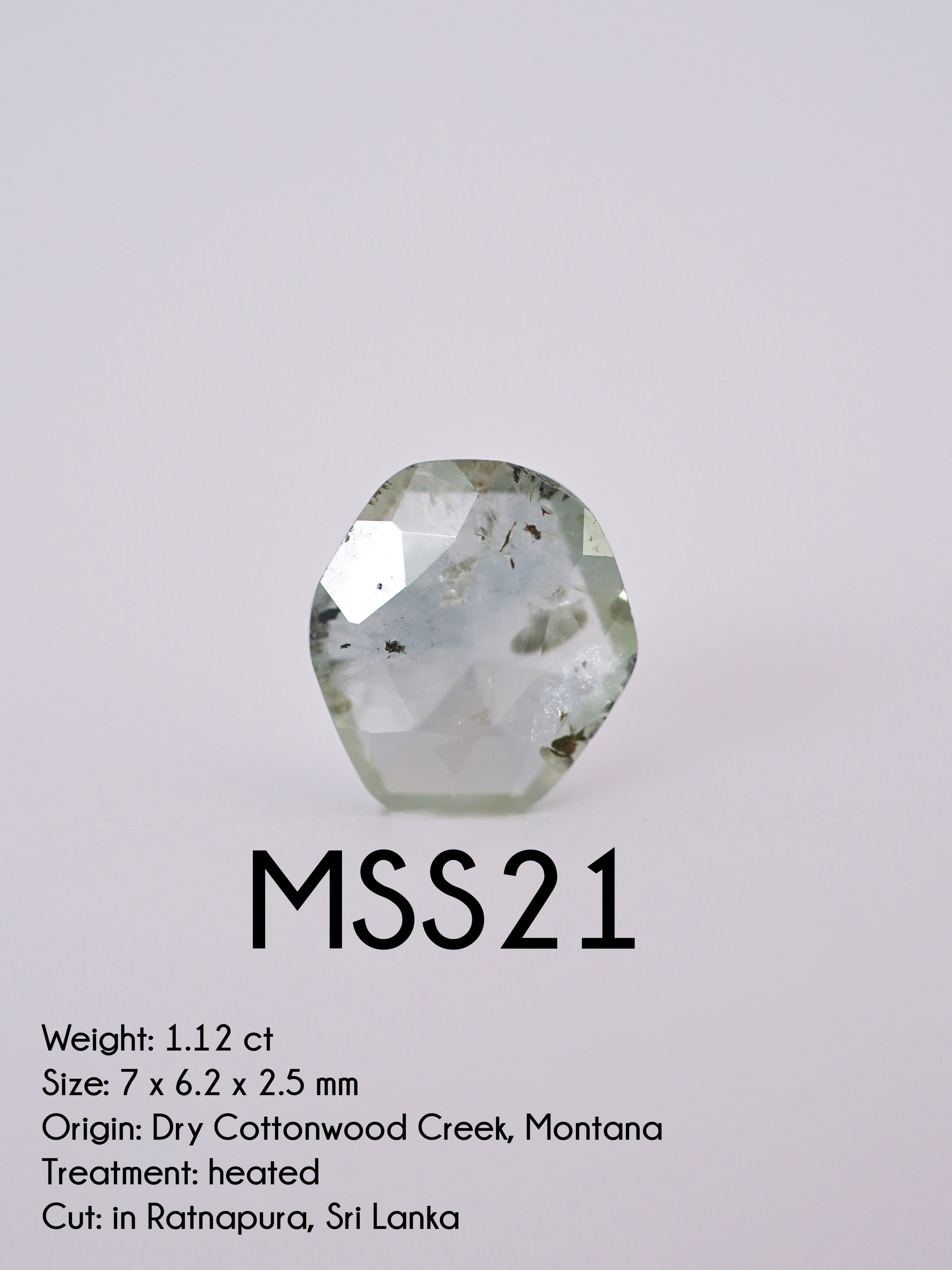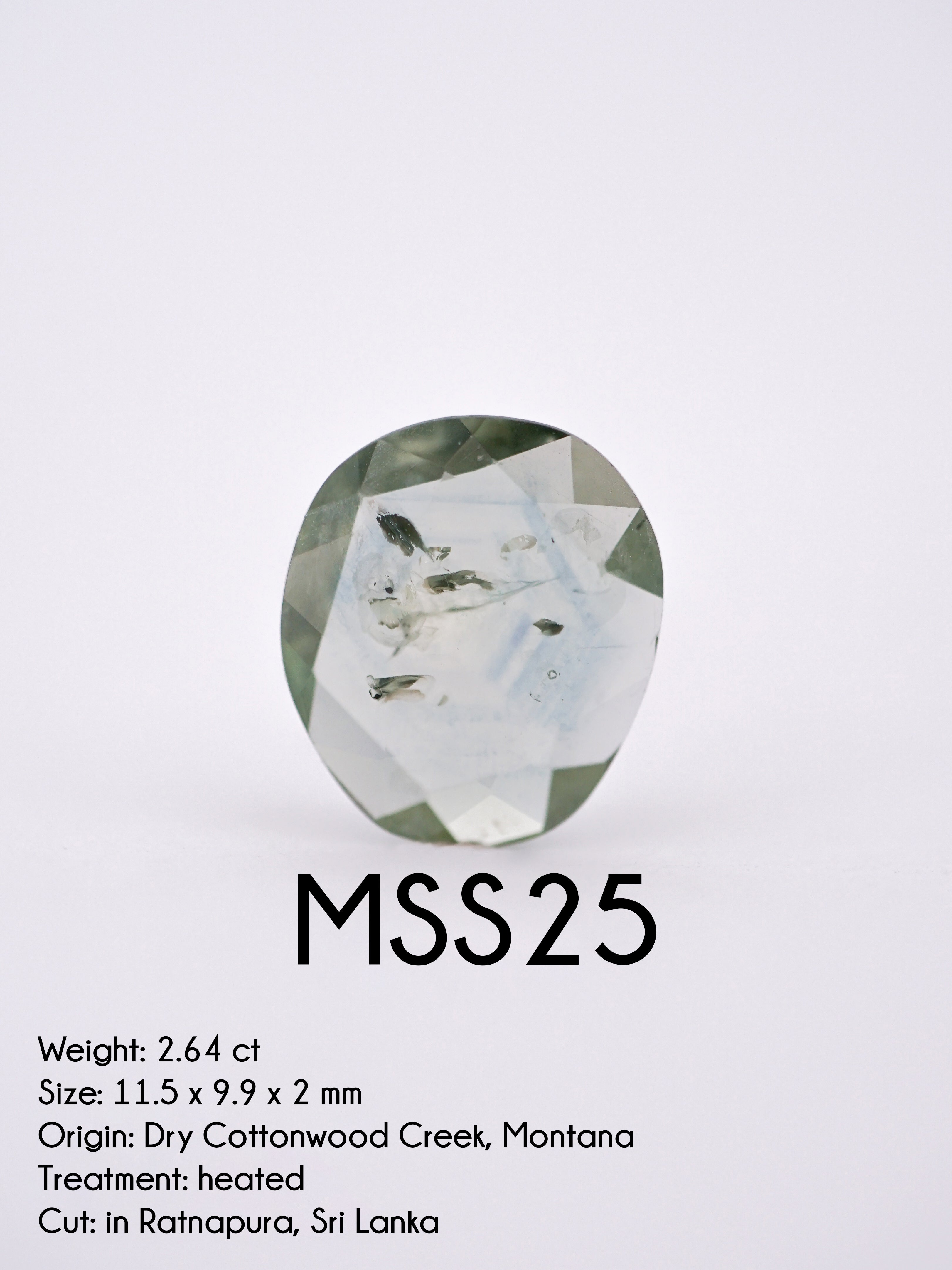 • MSS25 - 2.64 ct, measures 11.5 x 9.9 x 2 mm, the biggest sapphire in this collection, this blueish green colored gem captures clouds, and preserves memories.