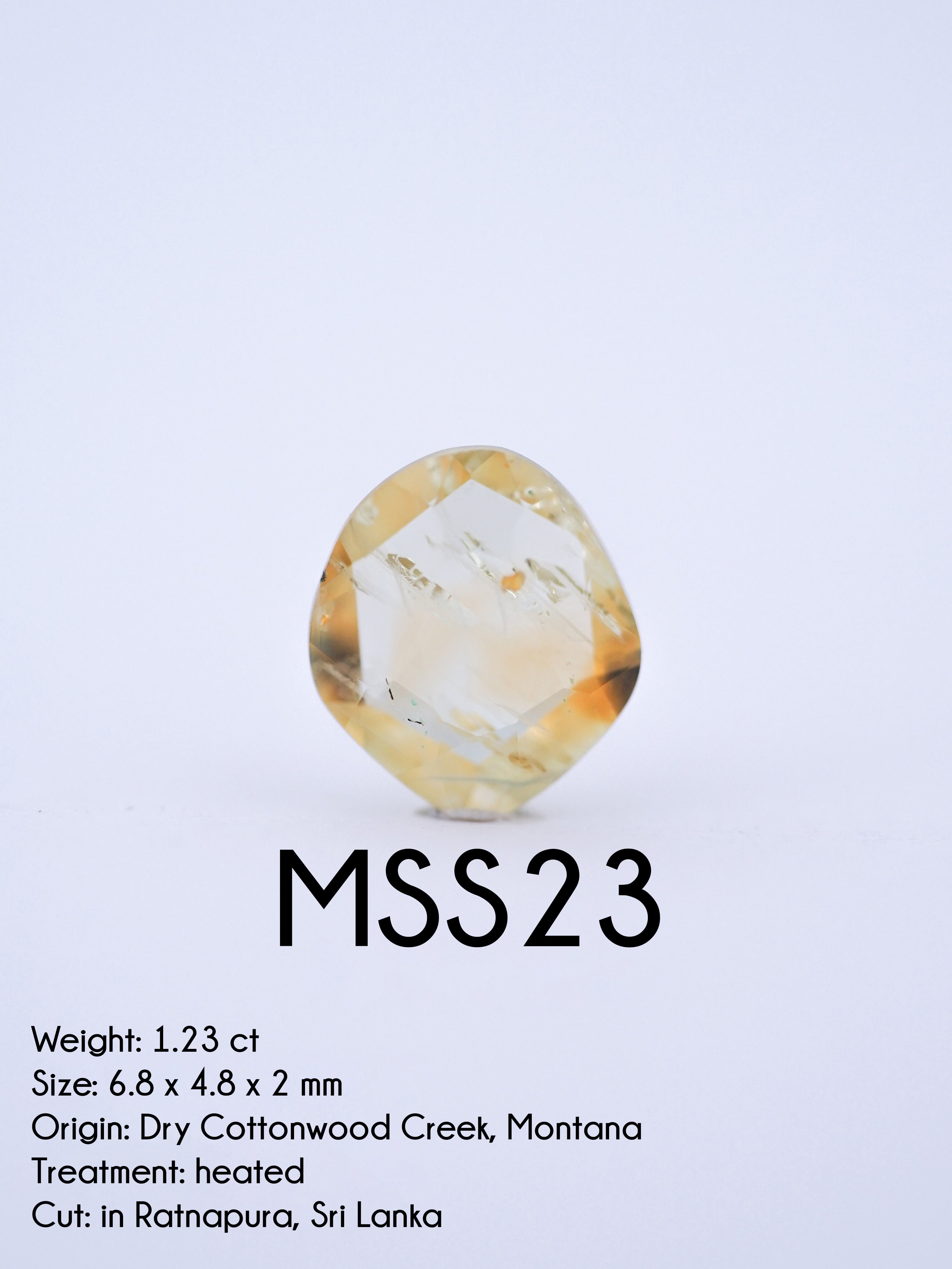 • MSS23 - 1.23 ct, measures 7.7 x 6.8 x 2.5 mm, a light yellow shocker of a sapphire, with visible lines inside, bold and unapologetically beautiful.