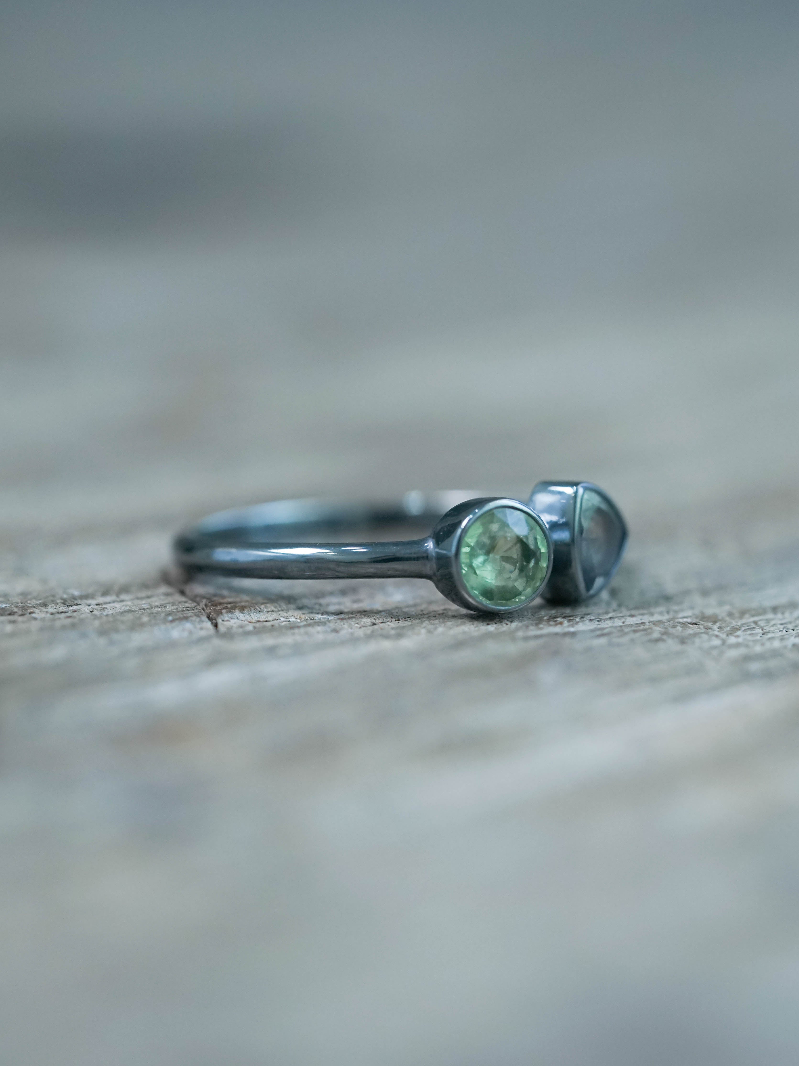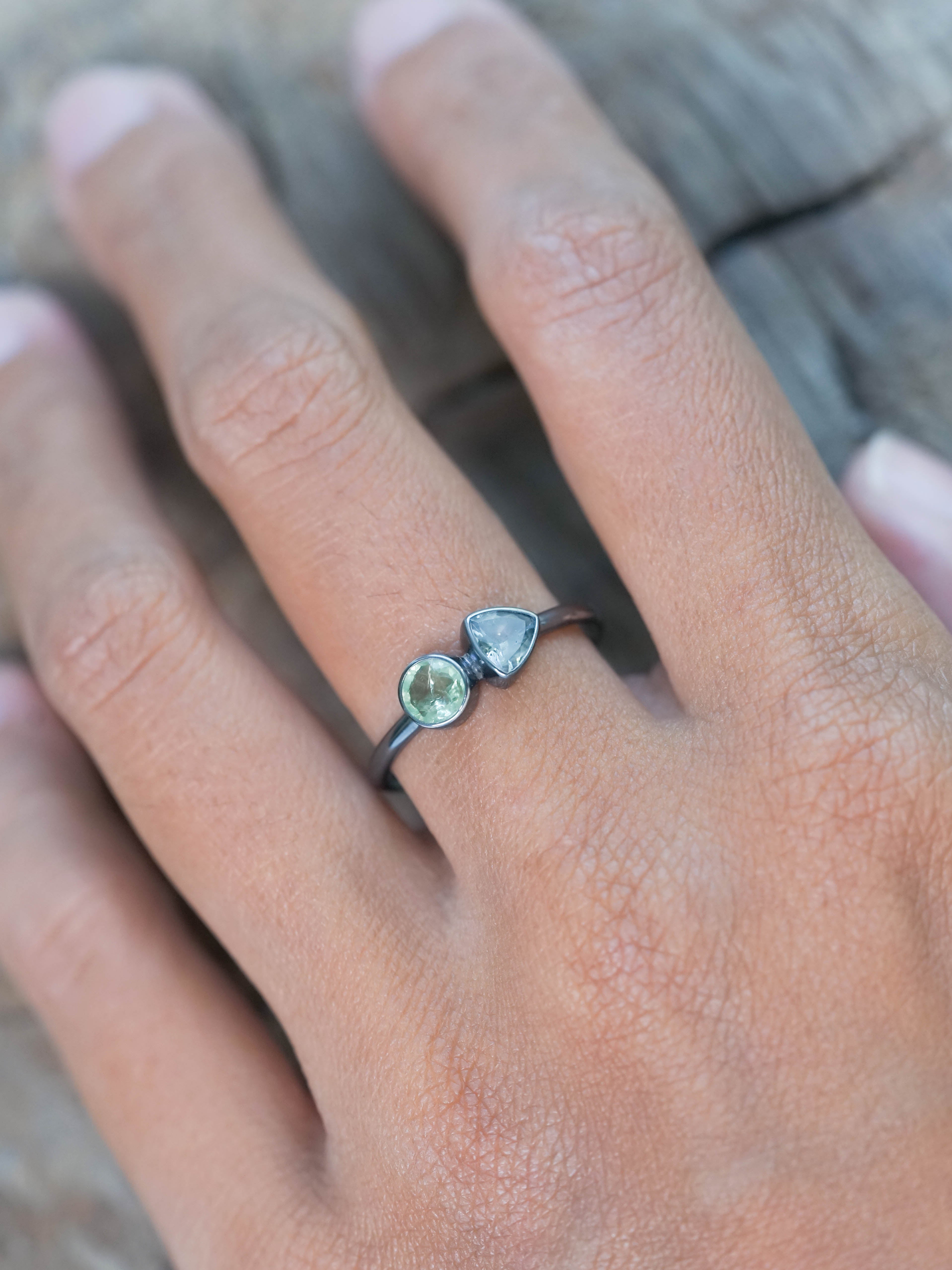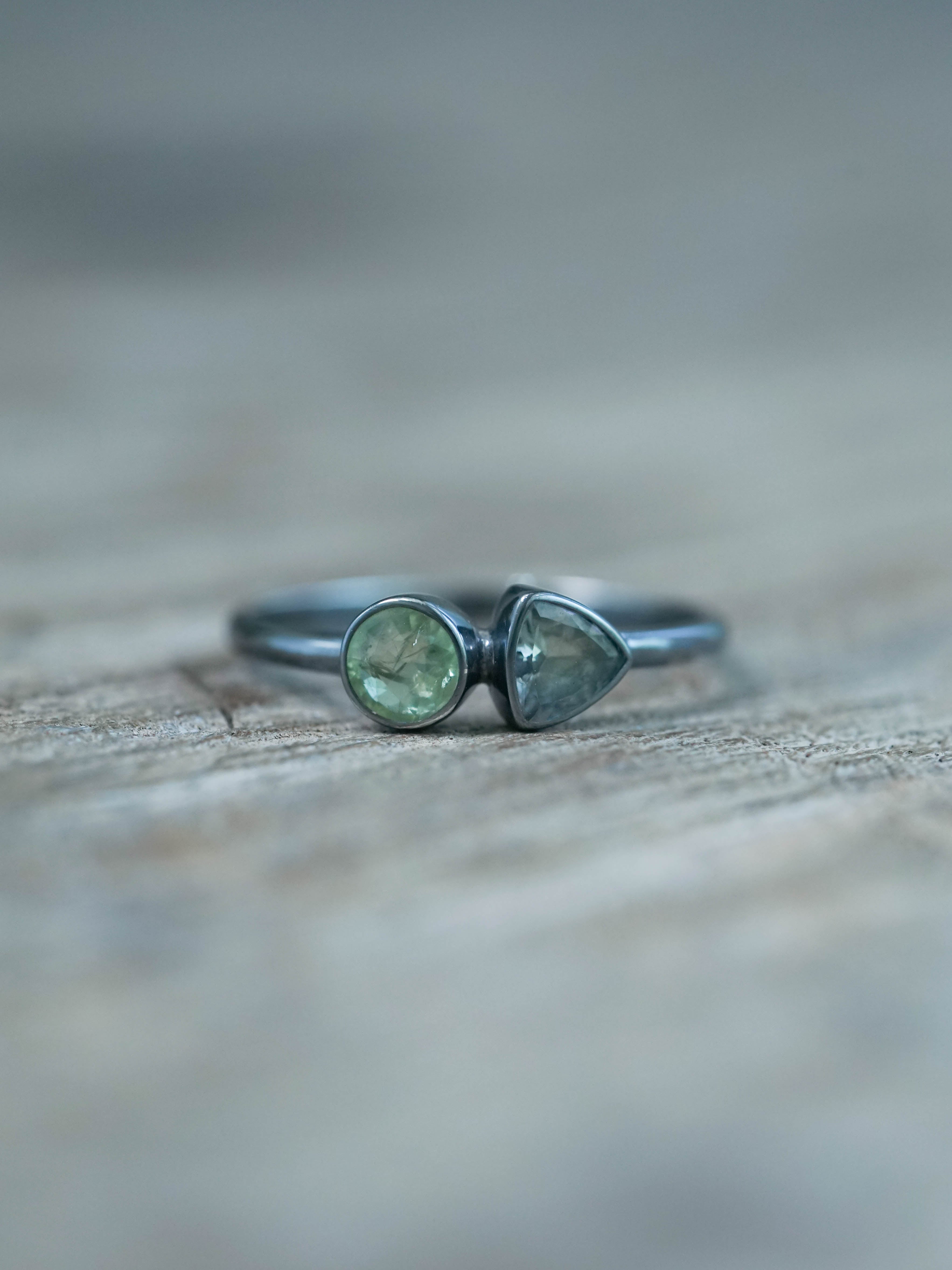 The apatite and tanzanite ring features a round cut green apatite from Brazil paired with a trillion cut heated tanzanite from Tanzania, set in recycled sterling silver with an oxidized finish. The bezel setting gives both stones space to shine.