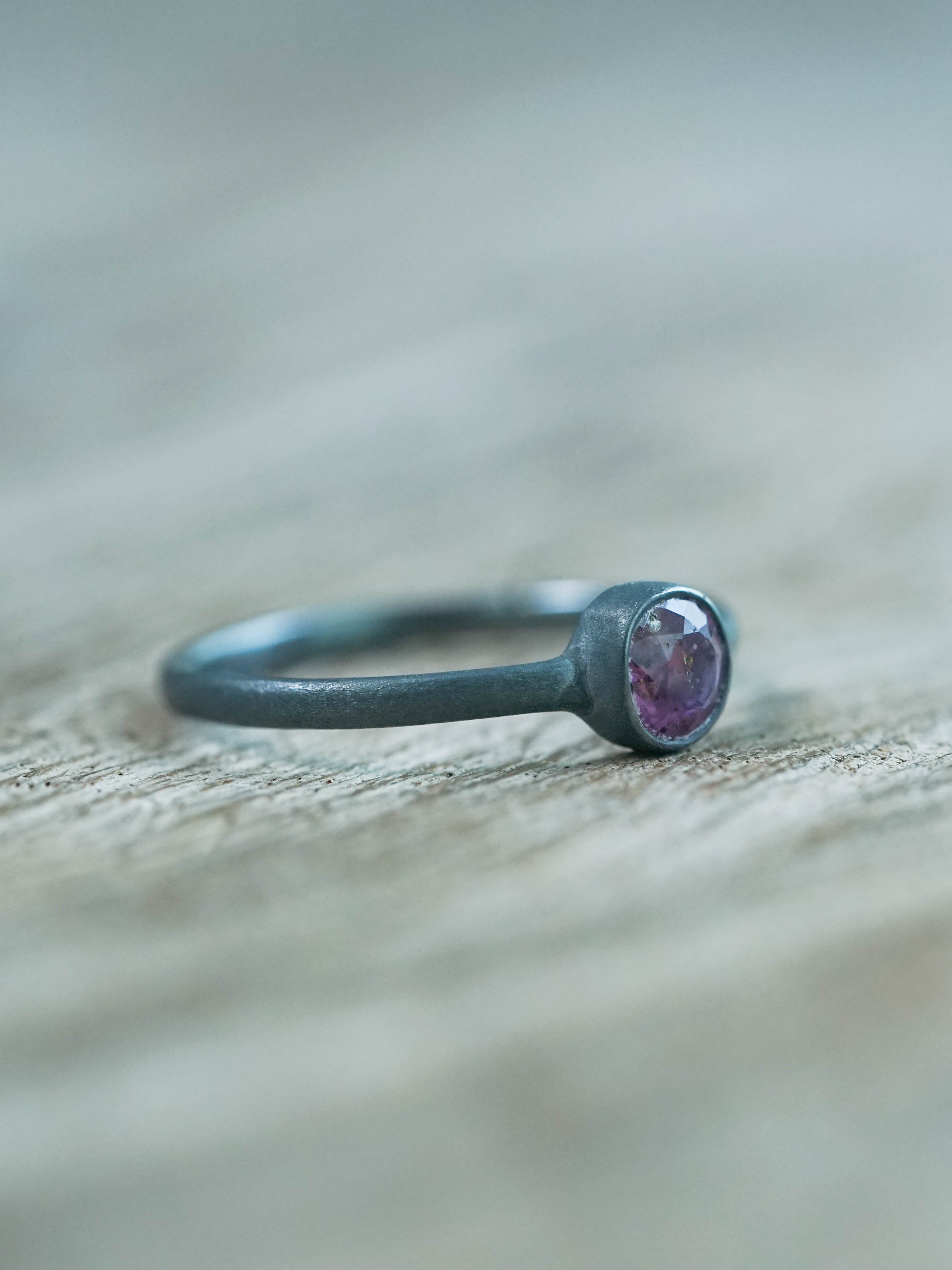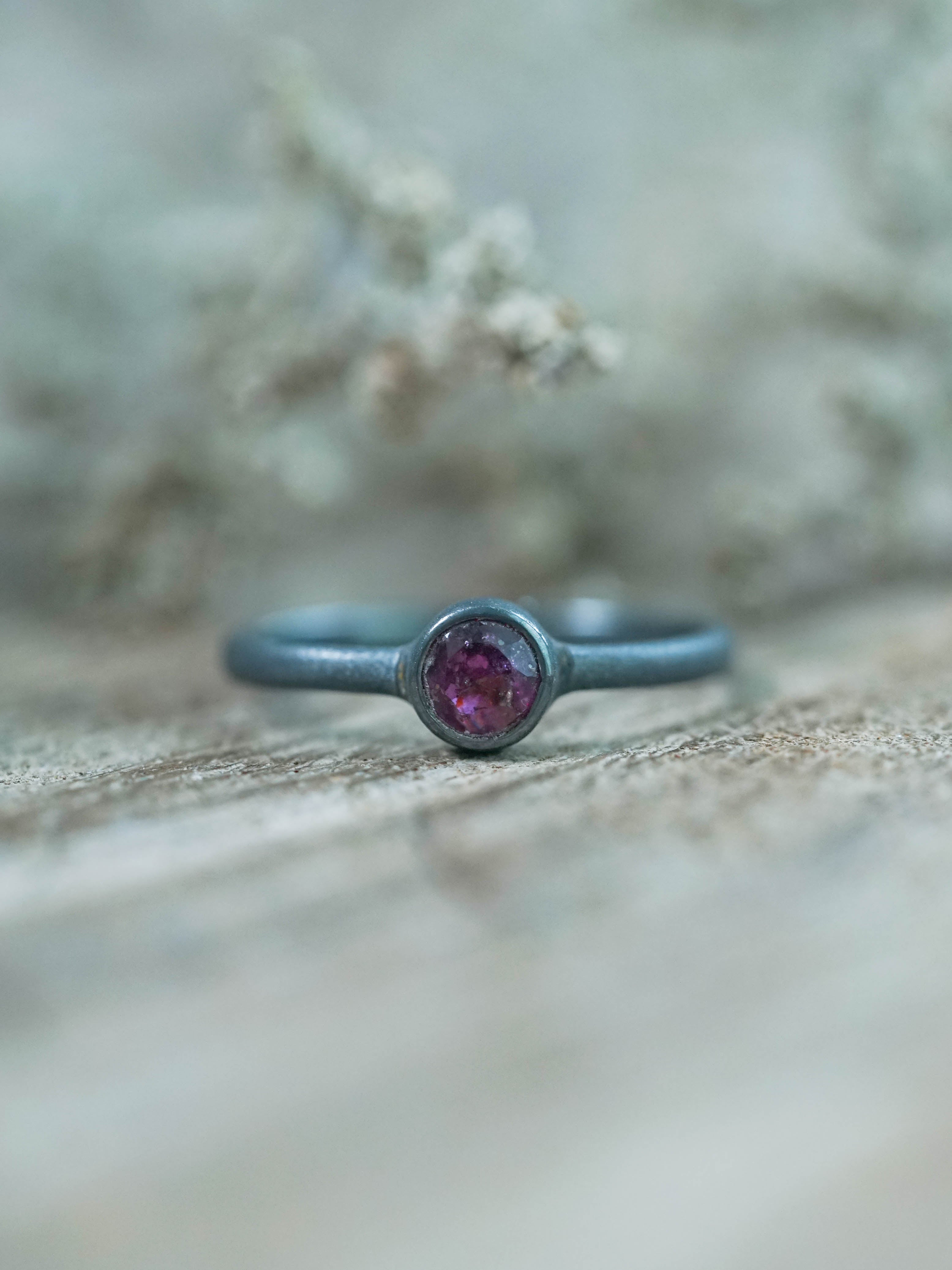 Bezel set in oxidized recycled sterling silver, the 0.41 ct round cut ruby from Tanzania carries that same fierce energy. Unheated and heavily included, this stone is the pulse of something real. Glowing with deep purplish pink tones, a galaxy of black pepper inclusions and visible surface marks. A flash of heat against a matte black stage.