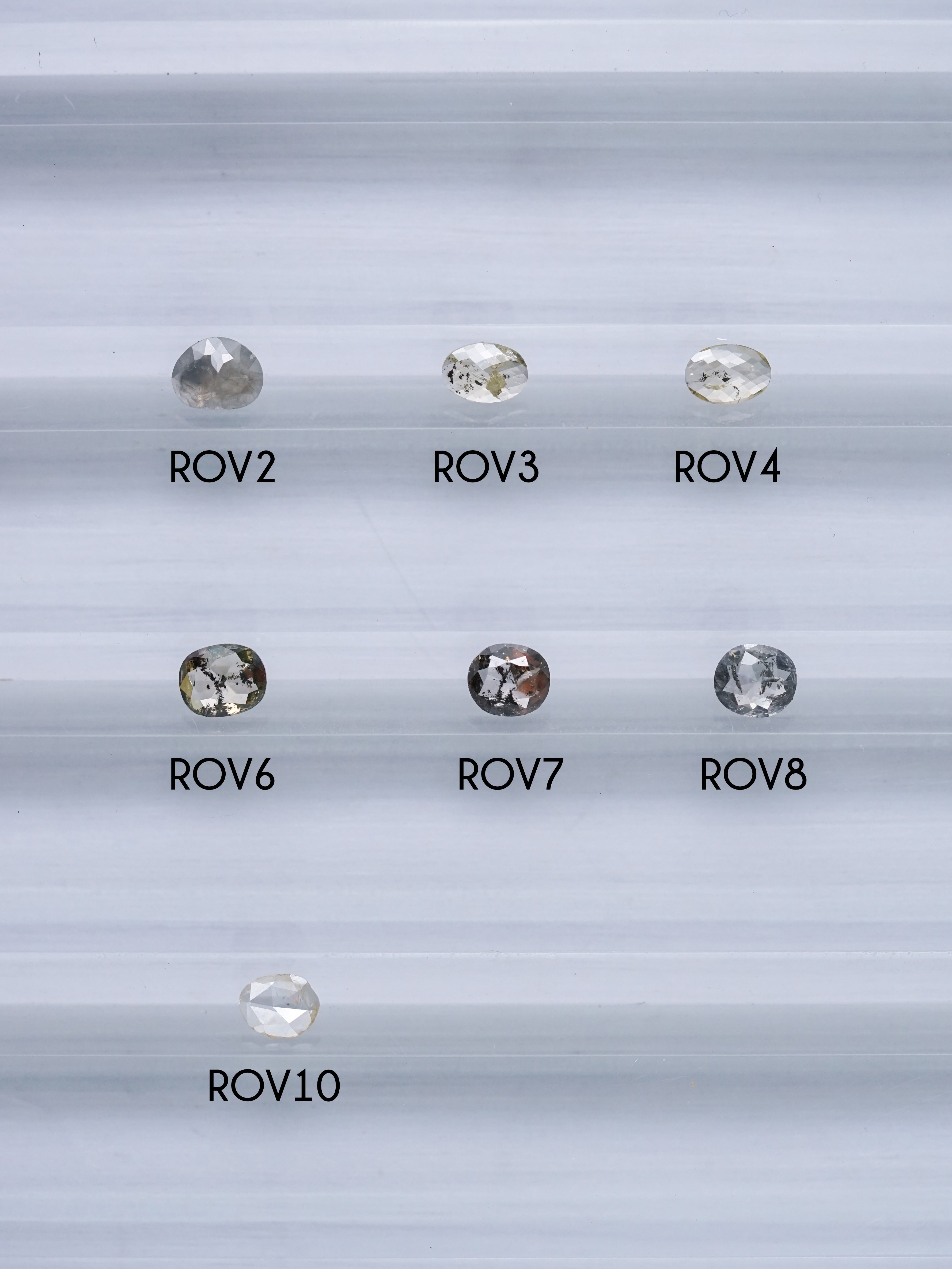 Light gray rose cut oval diamond that is translucent in the center and subtle inclusions towards the edges. Mined in Botswana, cut in India. Measures 6.7 x 6.0 x 2.5 mm.