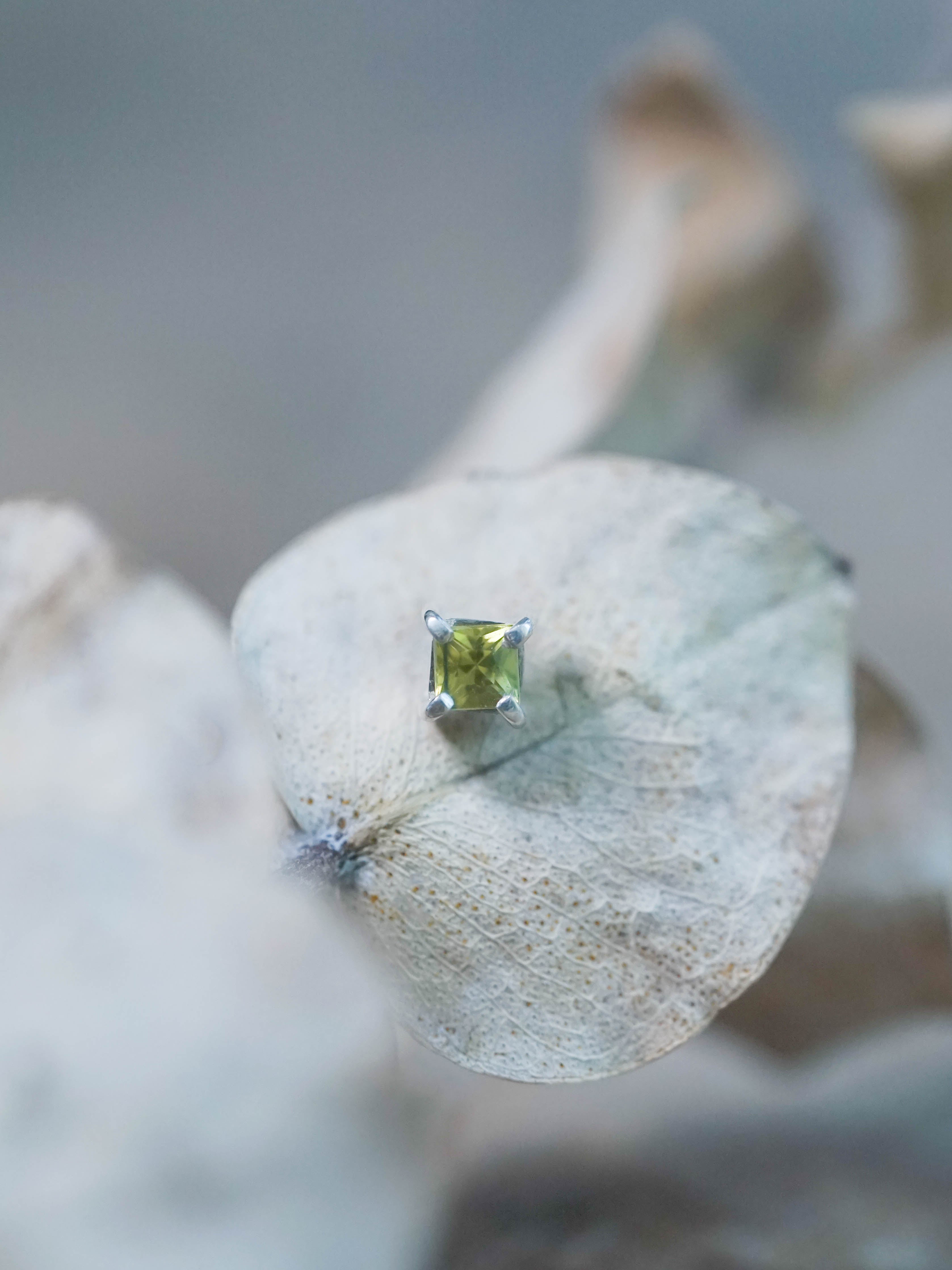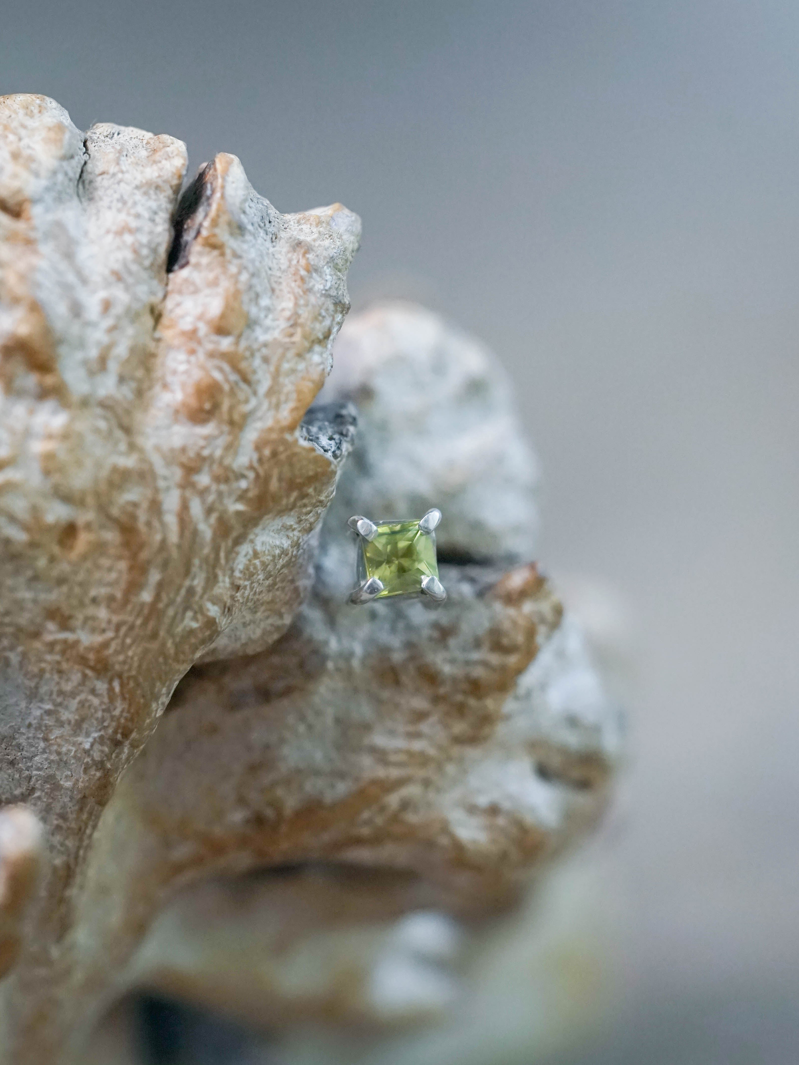 Each sapphire is set in recycled sterling silver, shaped into simple studs that let the stone’s color take center stage. Square, round, or rectangular, the cuts play with form while holding the same serene glow. Sapphires are stones of wisdom and truth, and in green they whisper of balance, growth, and harmony.
