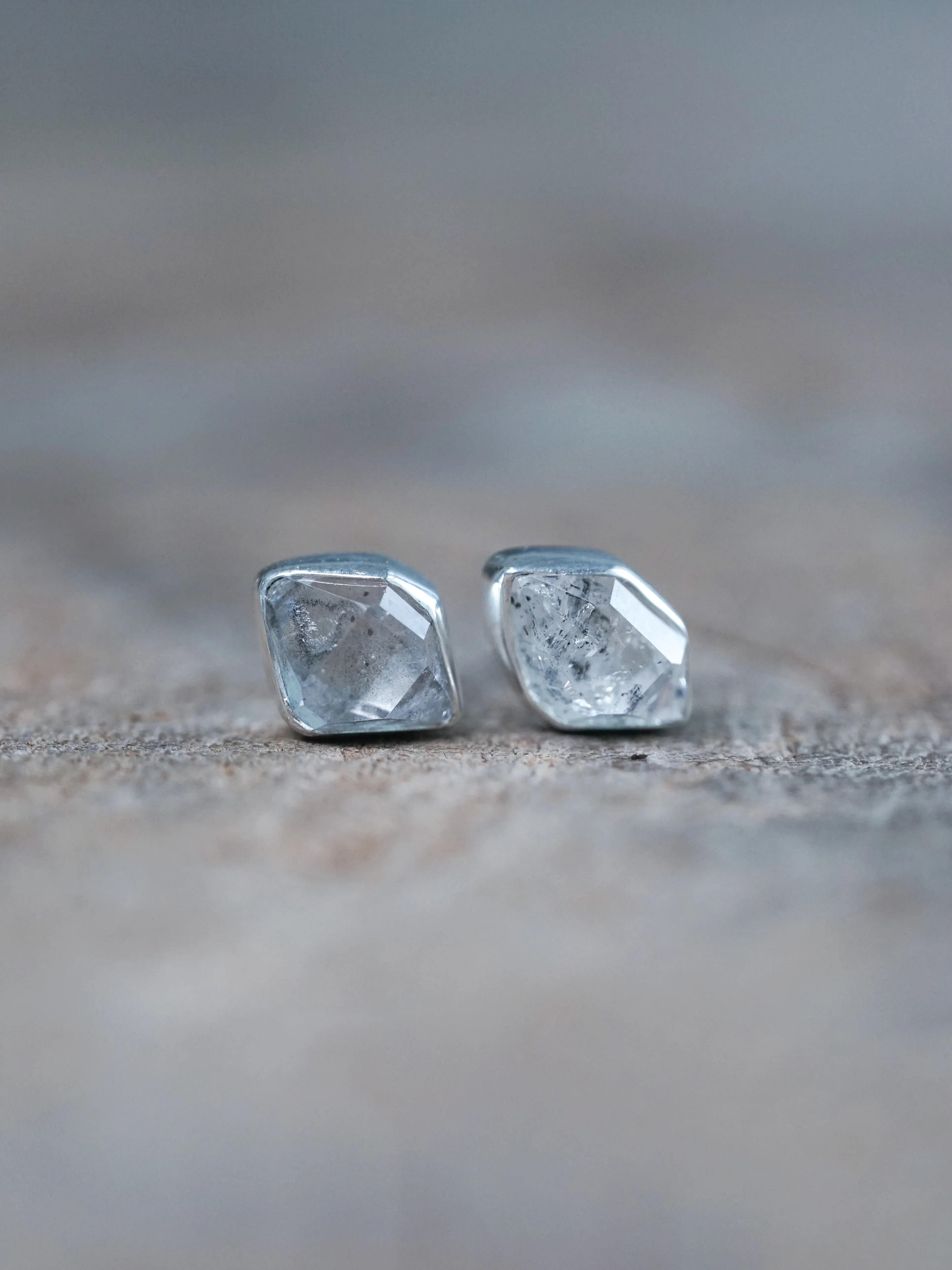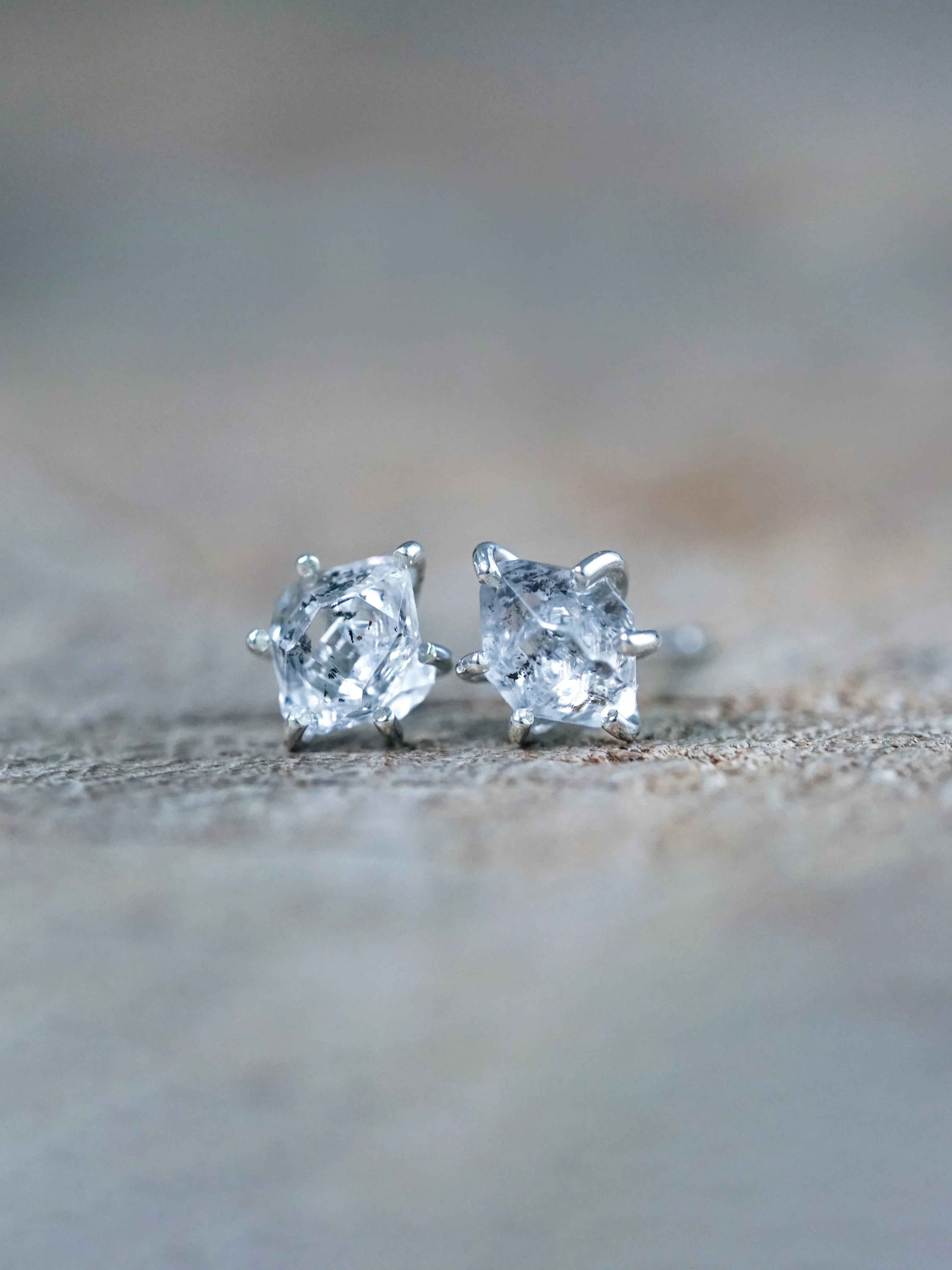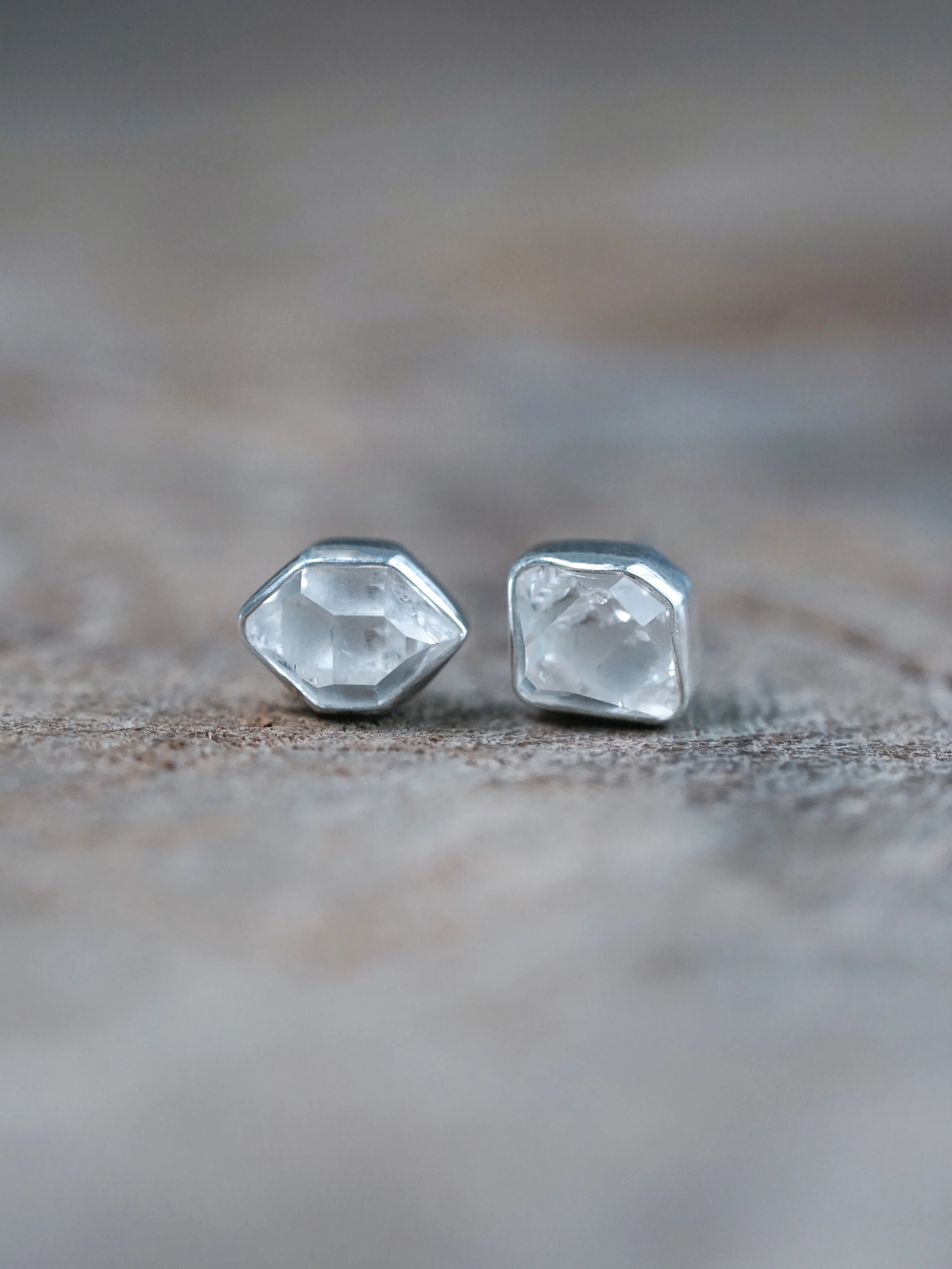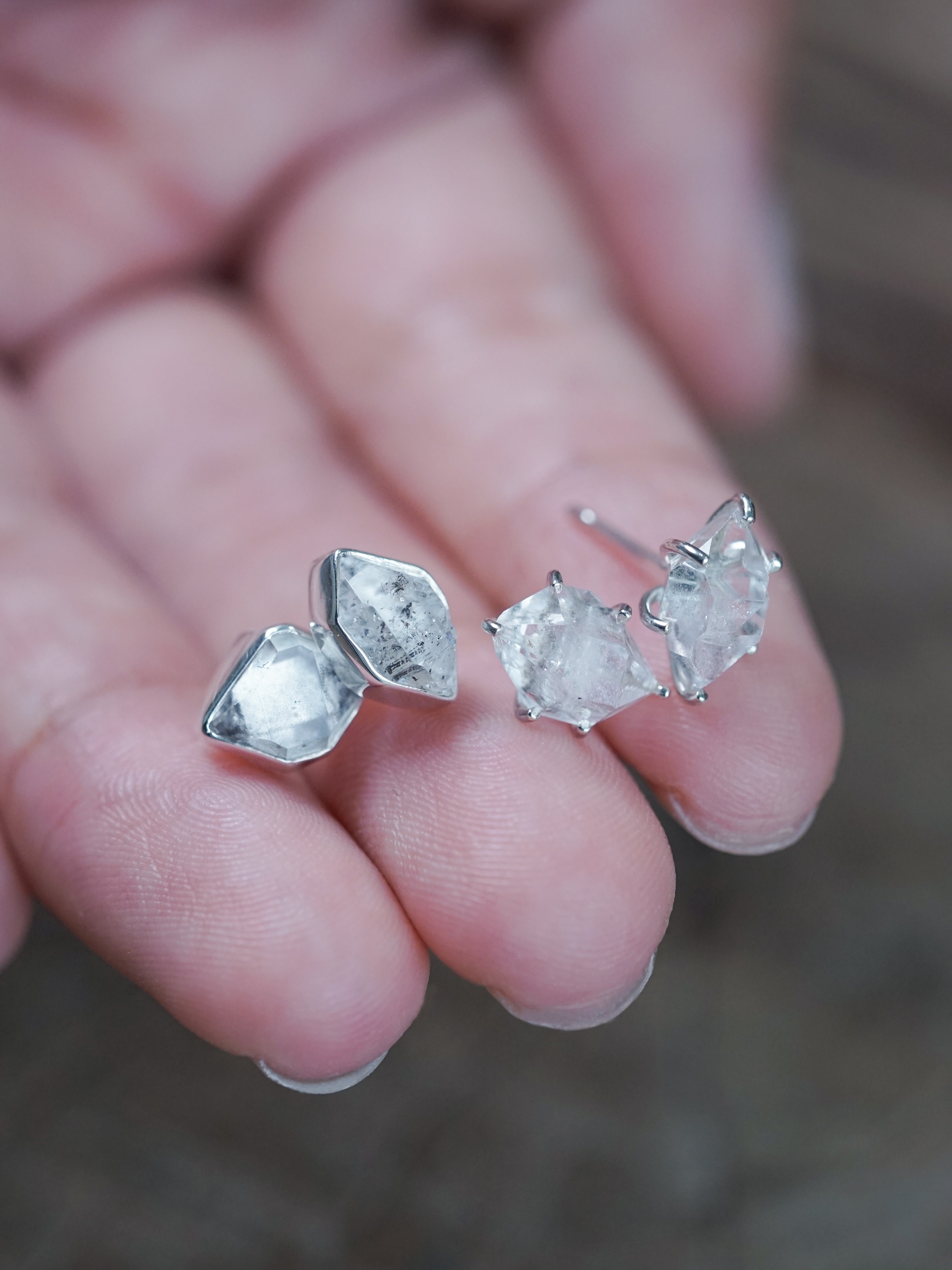 The Herkimer diamond stud earrings in silver are for the kind of days where things line up inside your head and you stop second guessing yourself. Each crystal is a naturally double terminated quartz. Grown that way, raw and uncut. No polishing away the truth. Some are clear, some hold black inclusions, some have tiny crystals growing inside them, like a thought that never quite settled. They feel sharp in the best way, focused and awake.