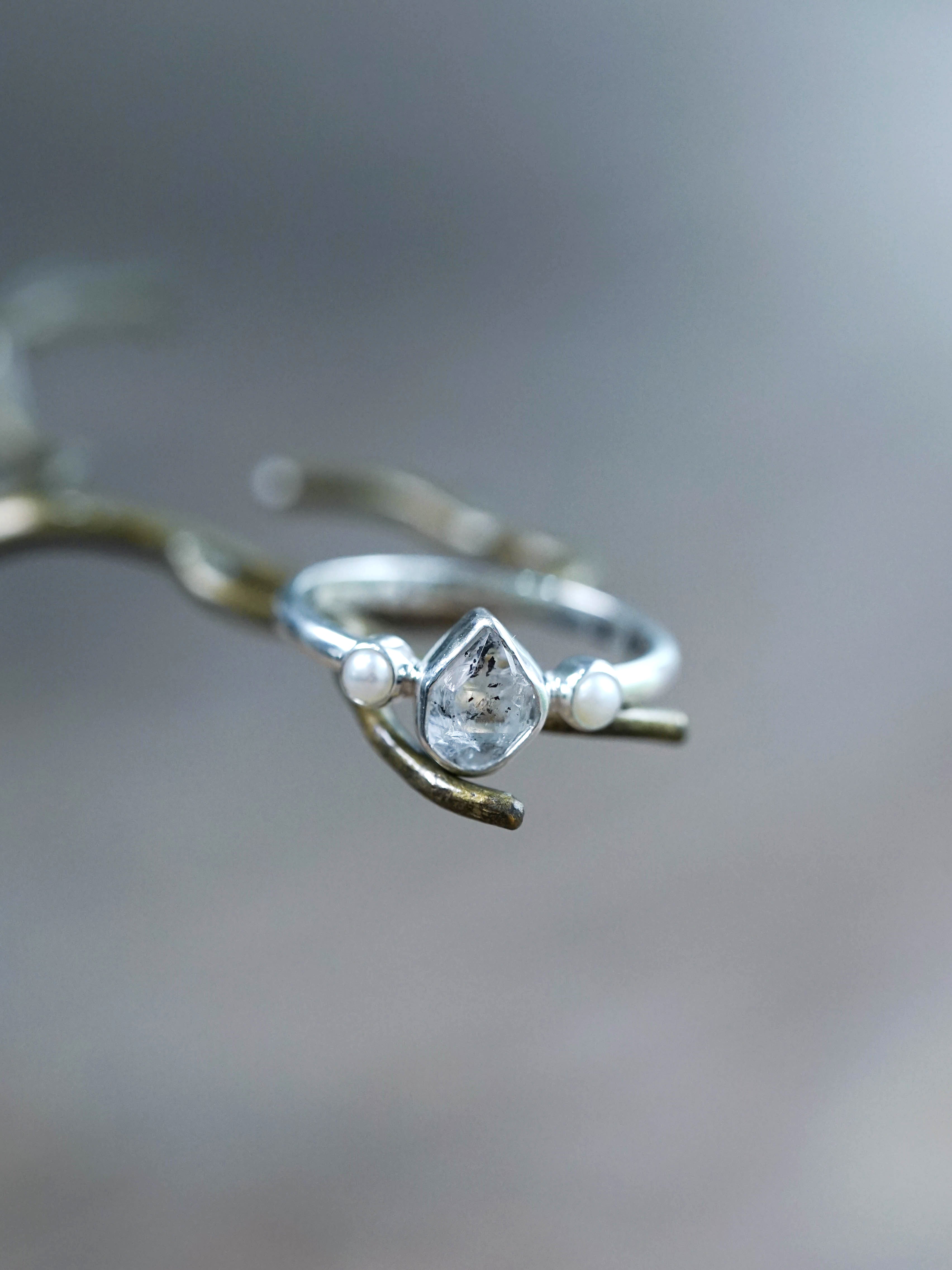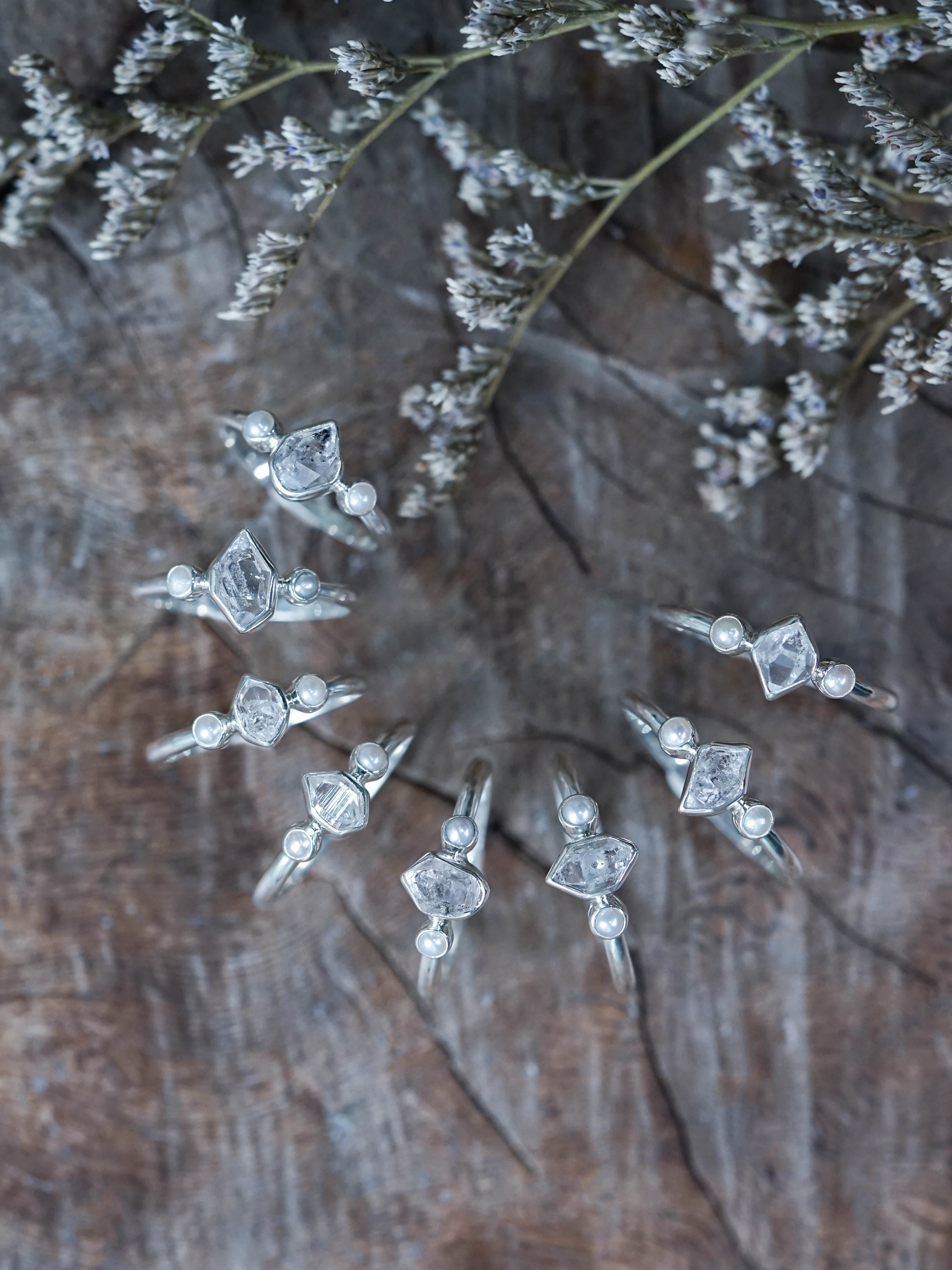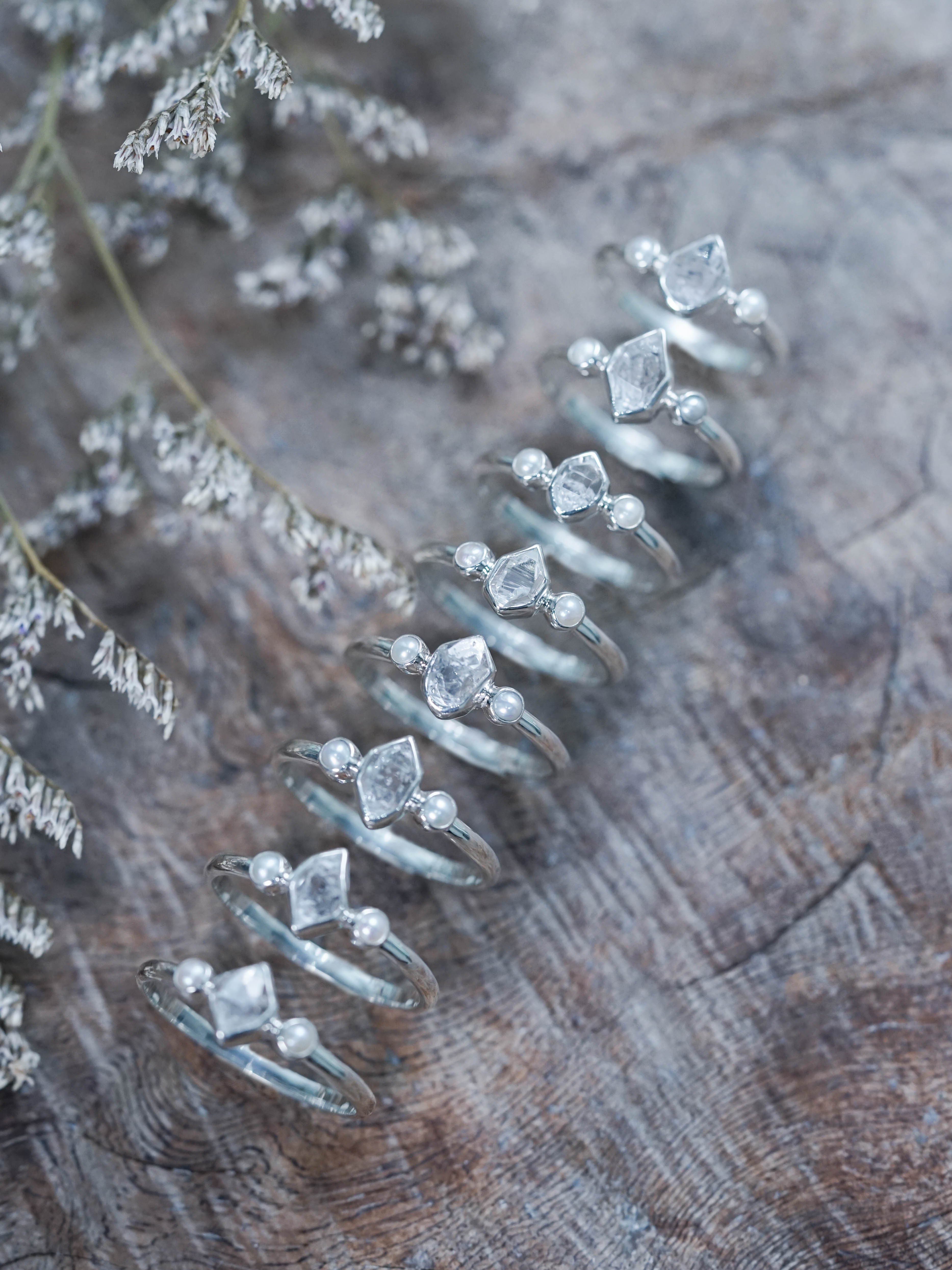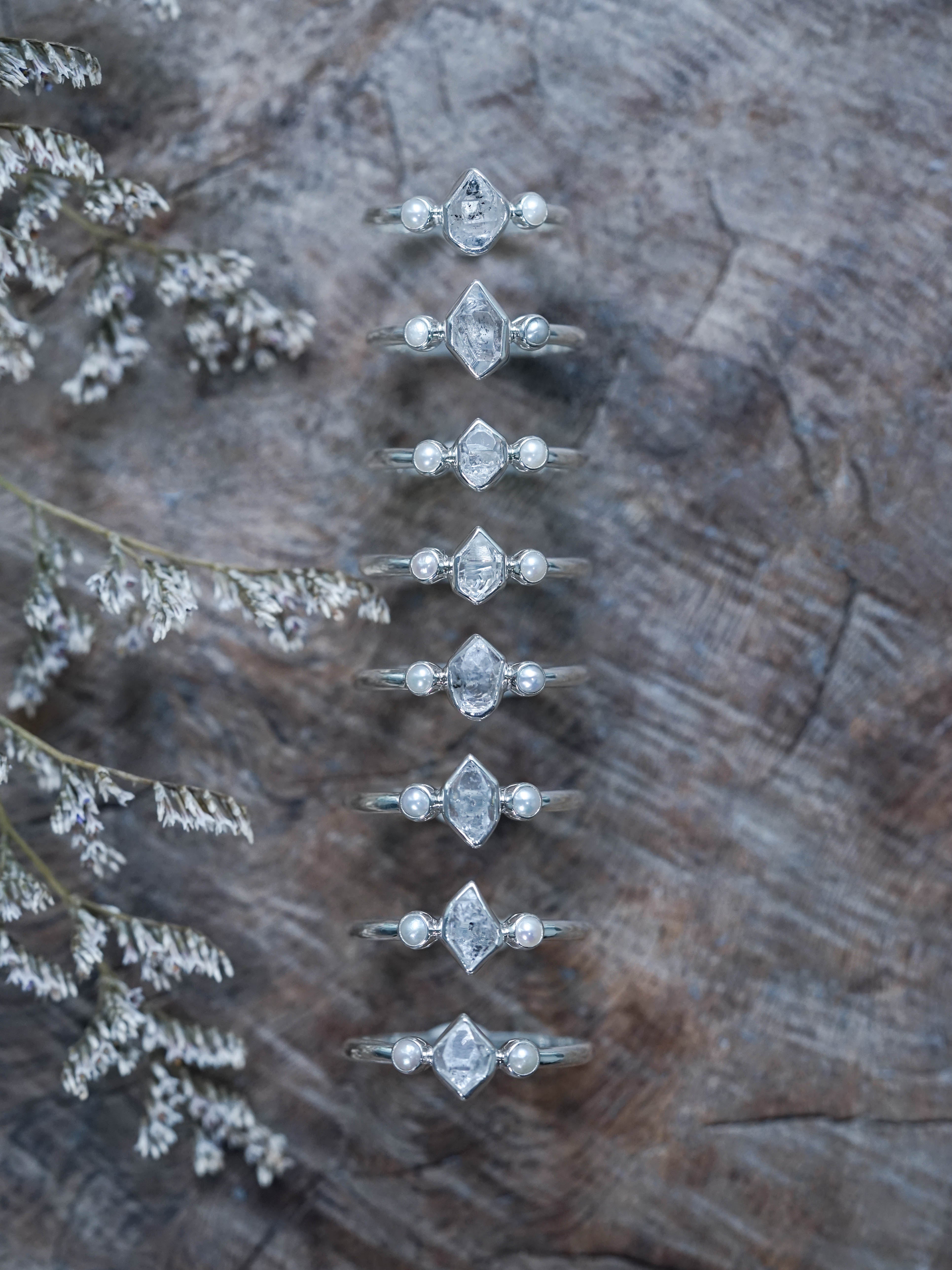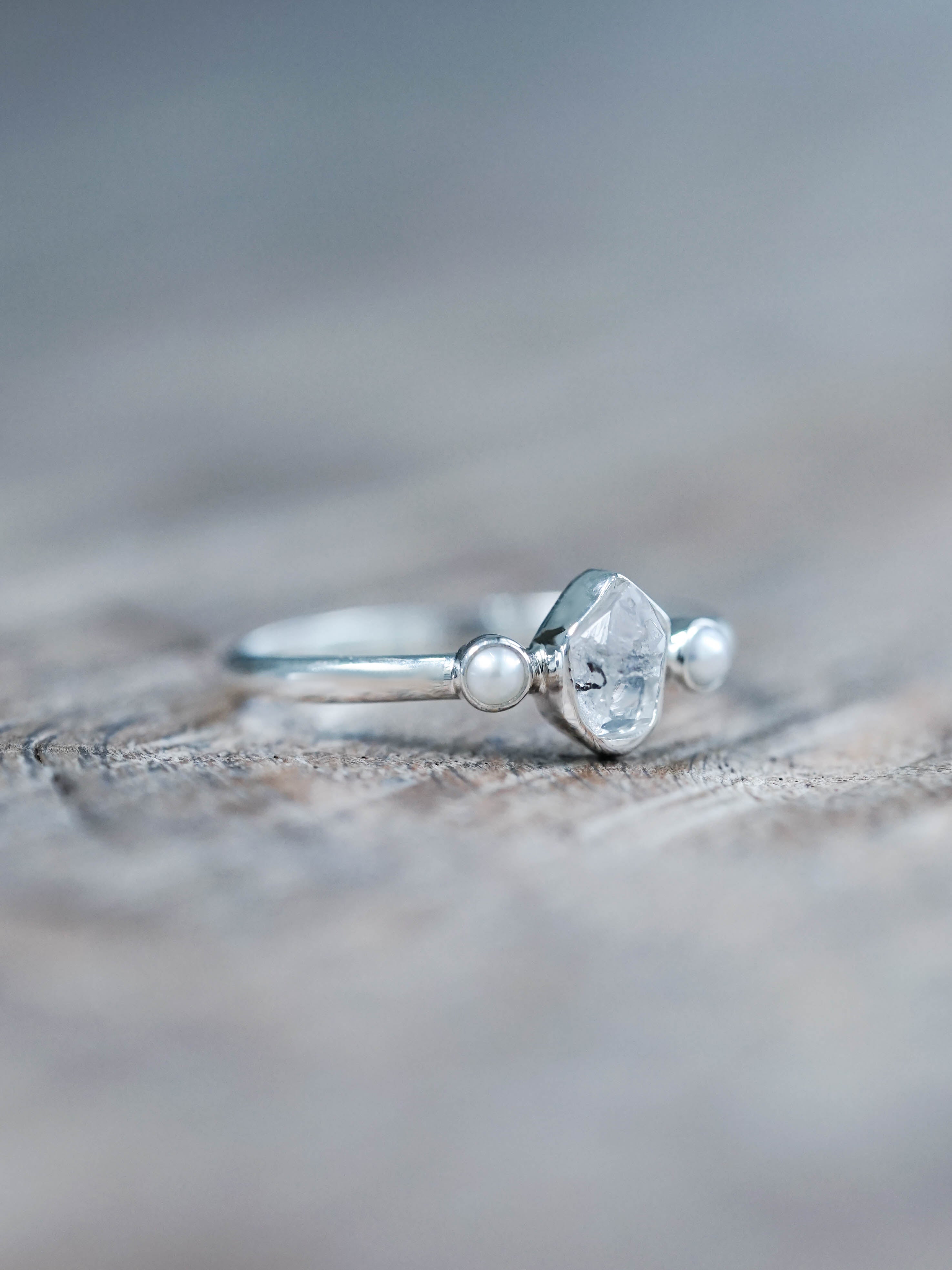 The center of this ring is a small Herkimer diamond from the Ace of Diamond Mine in Middleville, New York. This raw diamond is technically a double terminated quartz, and has been paired with a tiny pearl on each side.