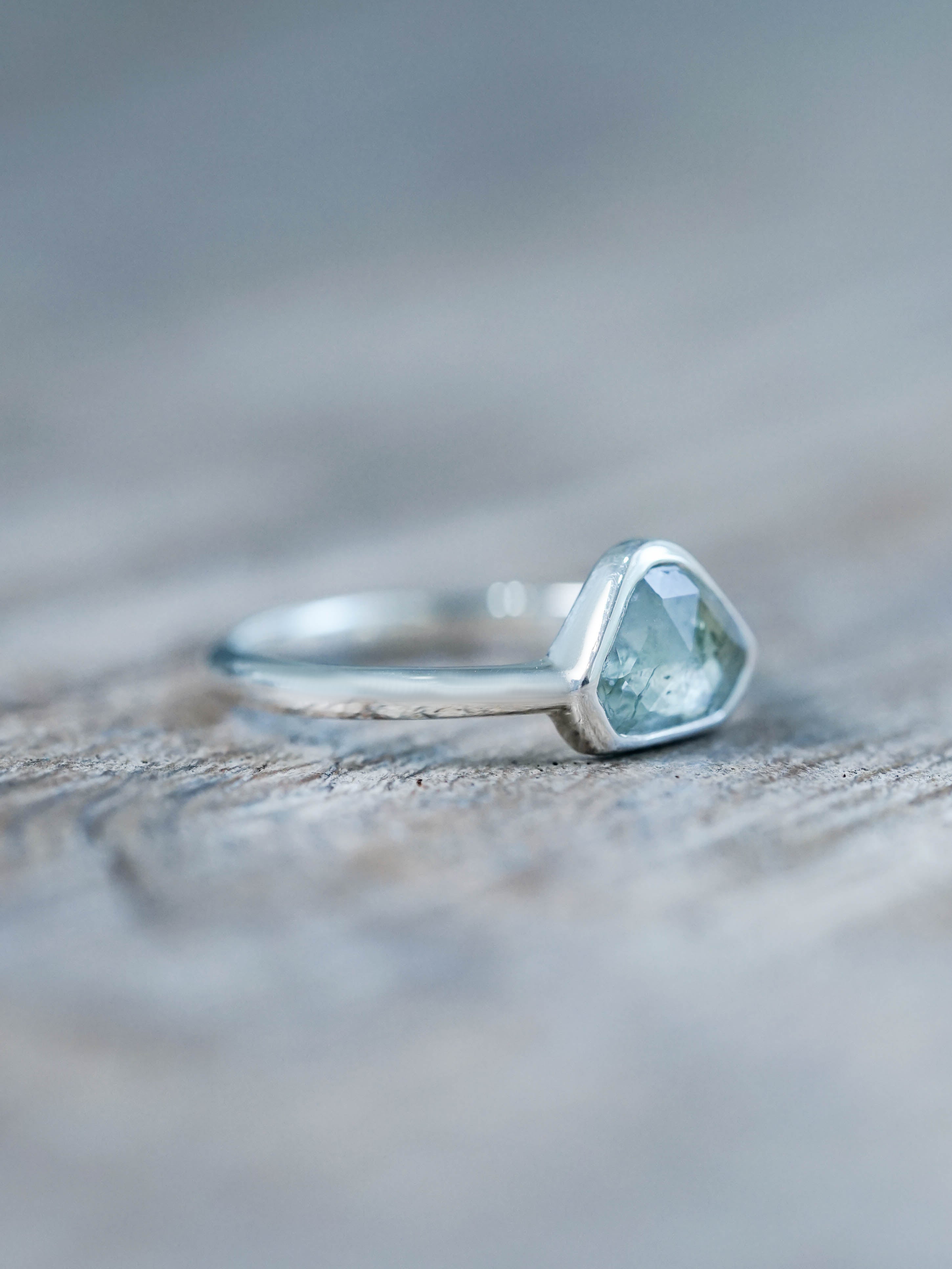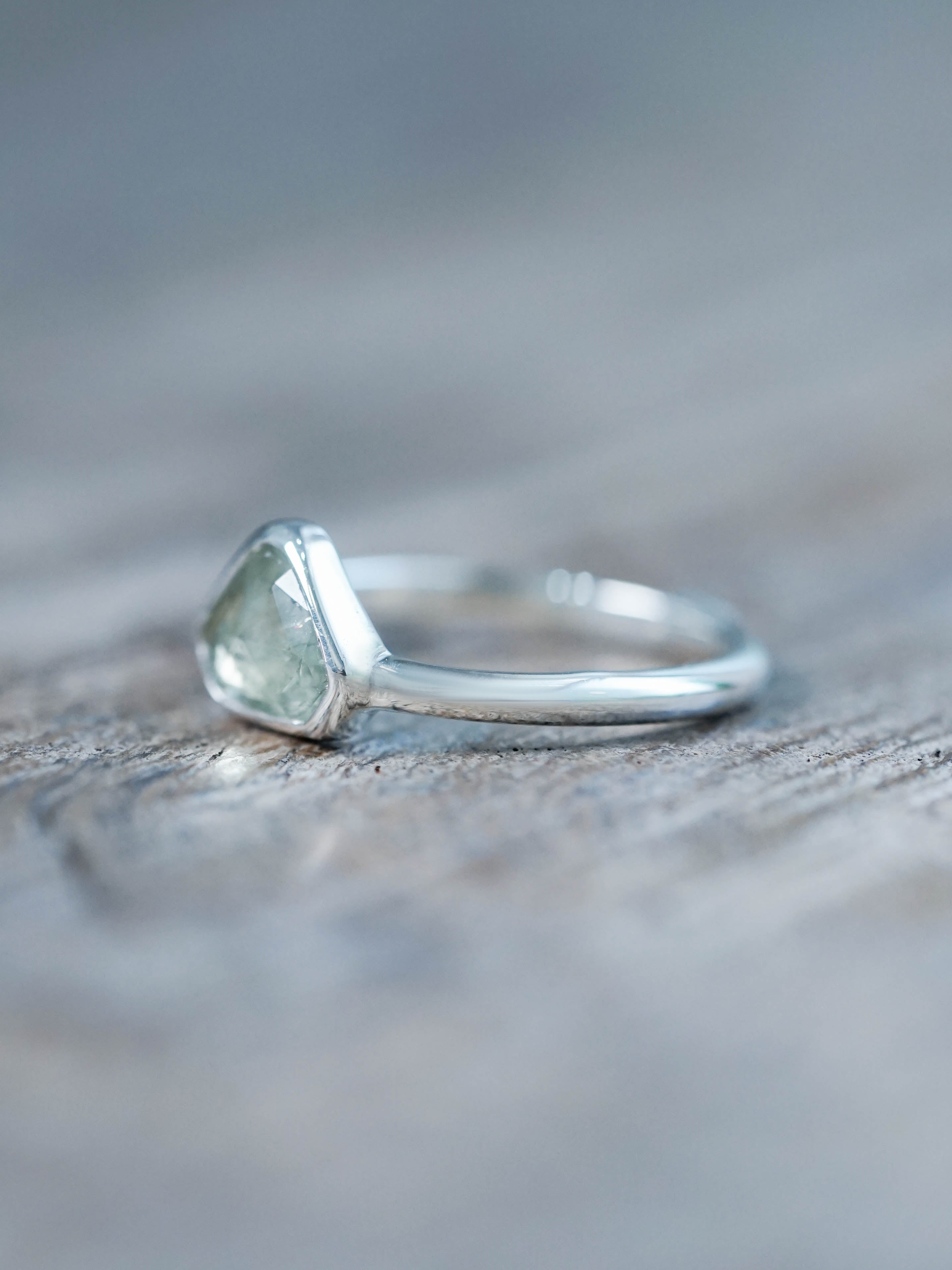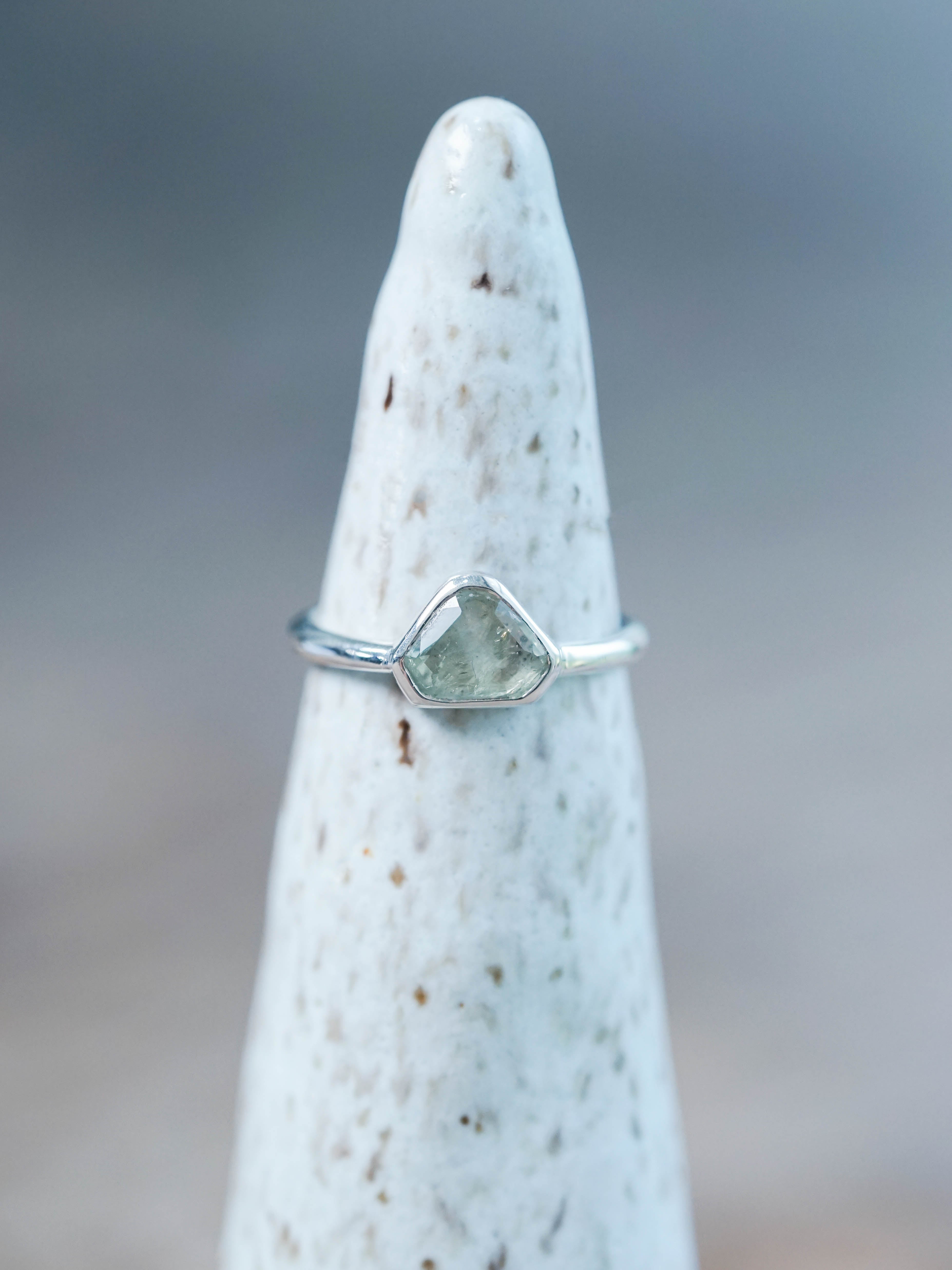 The light green Montana sapphire is softly included and fully itself, set low in a bezel for everyday wear. Green sapphire is known for loyalty, insight and truth. A companion when you need to return to your own center.
