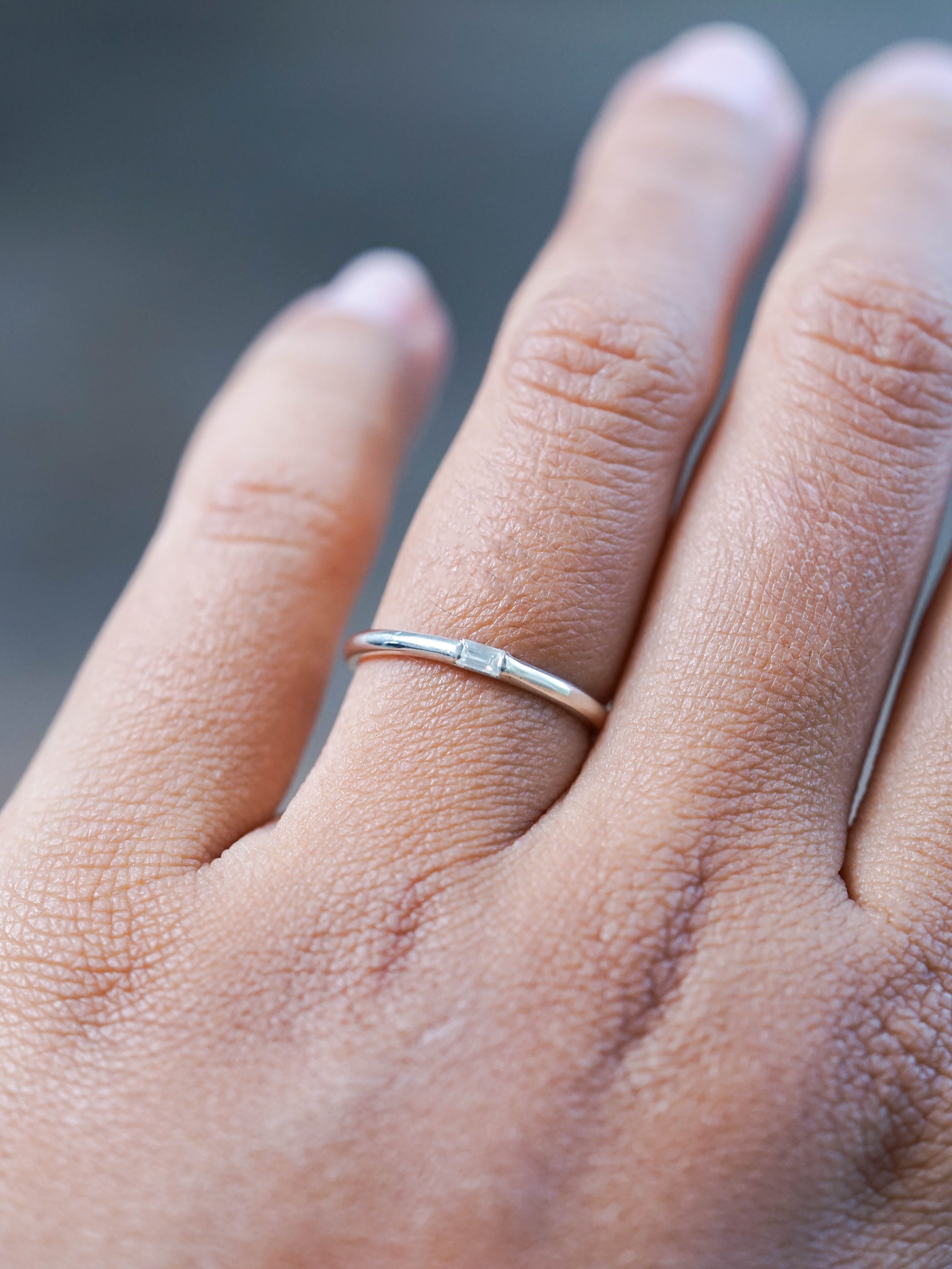 Then your hand turns. A 0.08 ct baguette diamond set in a semi bezel at the back. The diamond is from Botswana, and it’s there for you alone. The April birthstone, set where only you might see it. Diamond carries the energy of commitment, to another or to yourself. You wear this silver sapphire and diamond engagement ring like a promise that doesn’t need explaining.