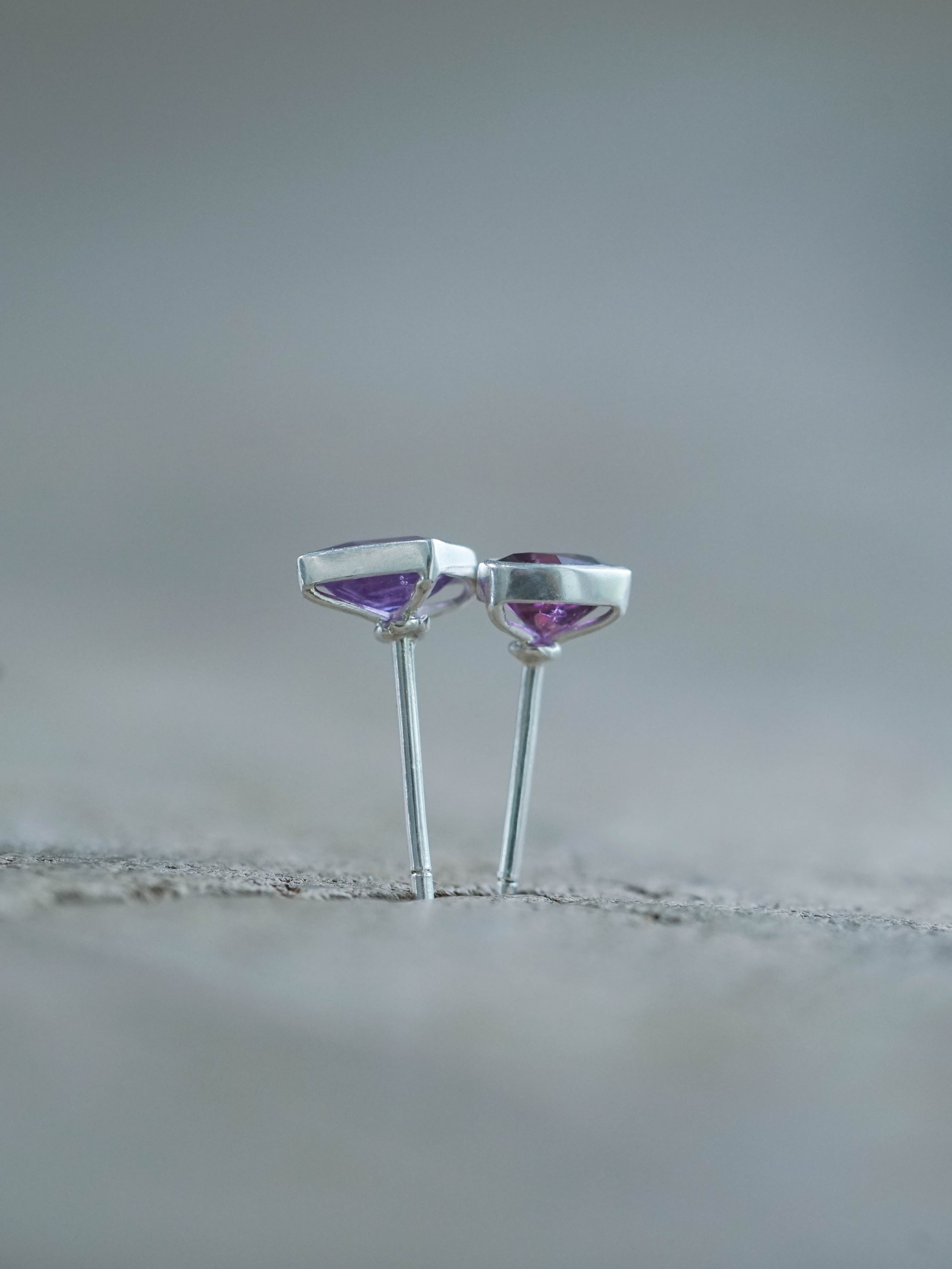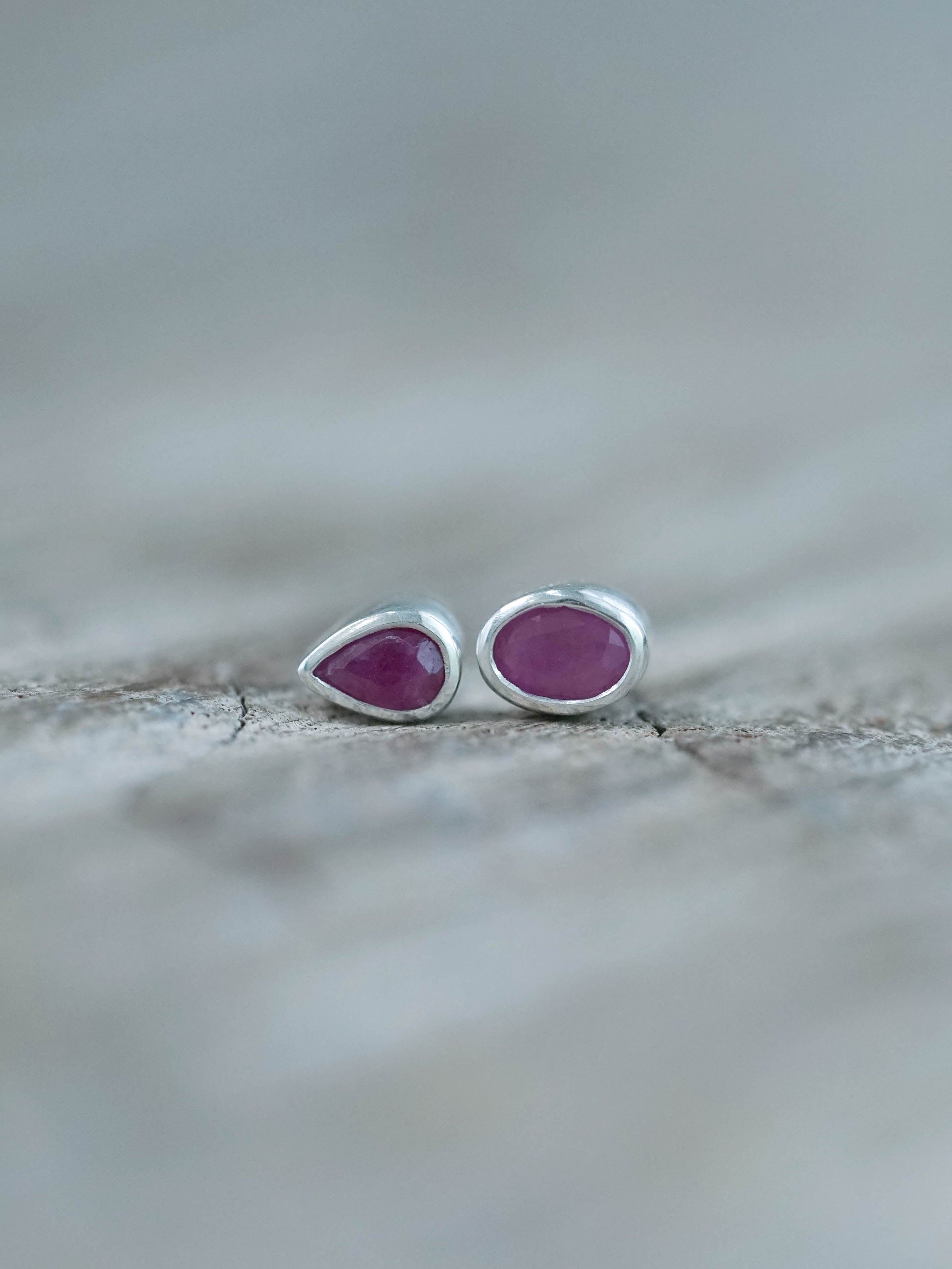 Pair B is playful and raw. Two freeform rubies from Winza, Tanzania, unheated and untamed. One leans lavender like a sapphire, the other looks like a tiny galaxy caught in stone. At 1.27 ct combined, they’re bigger, but still easy for daily wear.