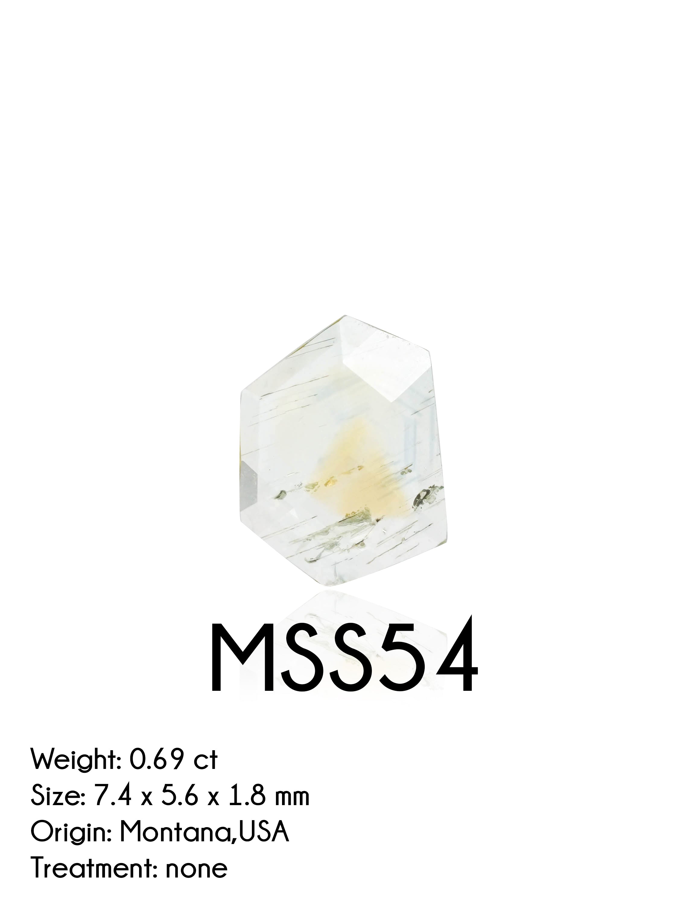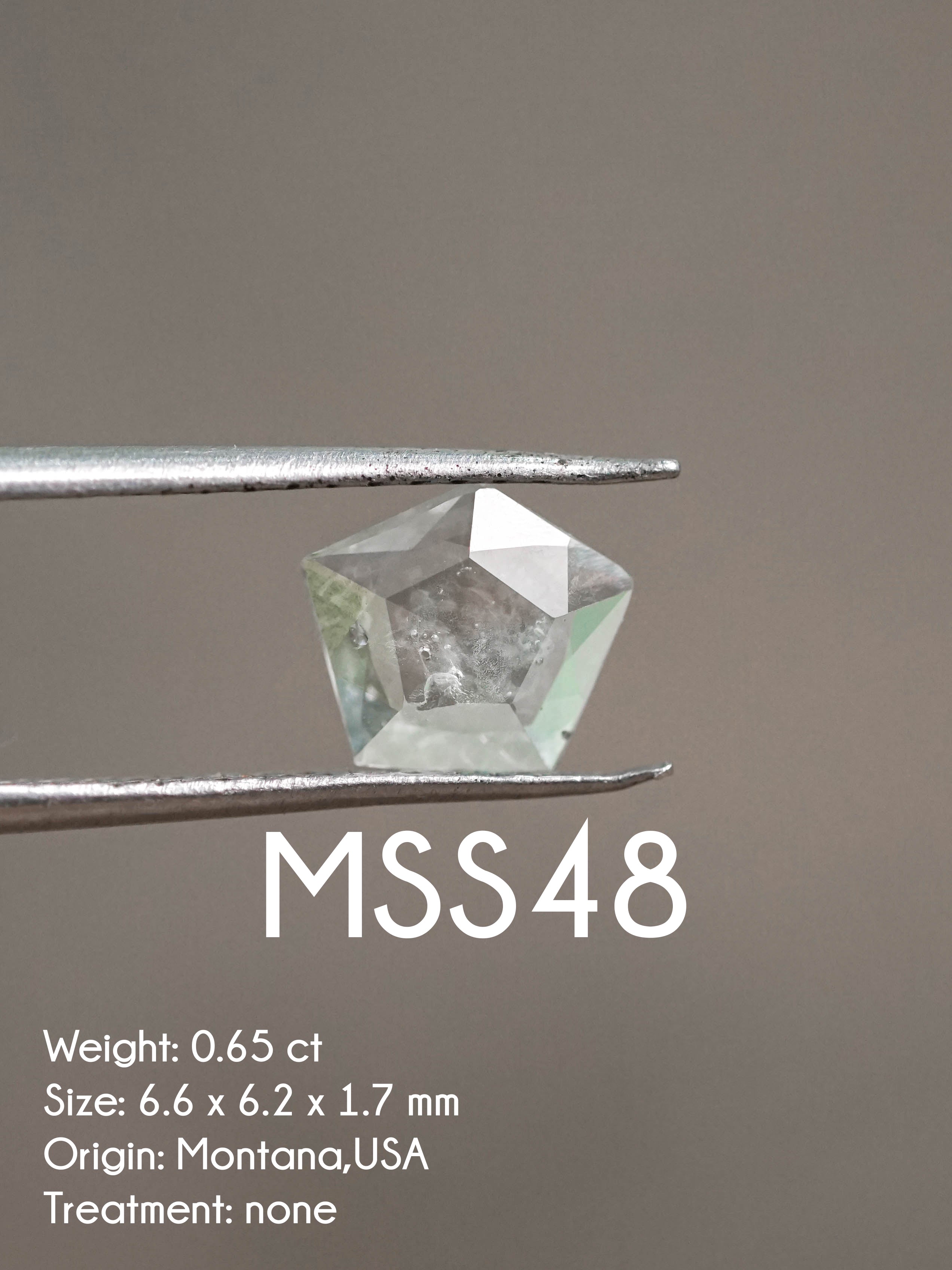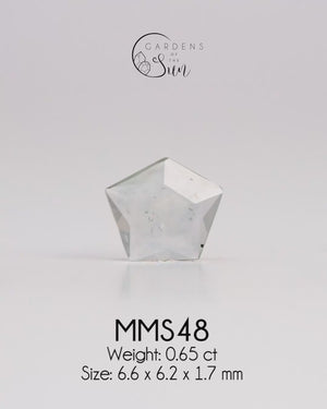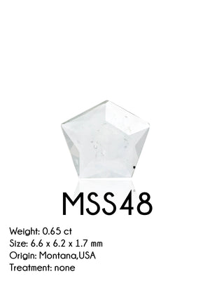 • MSS48 - 0.65 ct little pentagon star shaped white Montana sapphire. Slightly included. Mined in Dry Cottonwood Creek, Montana. Heated for color. Cut in Bangkok, Thailand. Measures 6.6 x 6.2 x 1.7 mm.