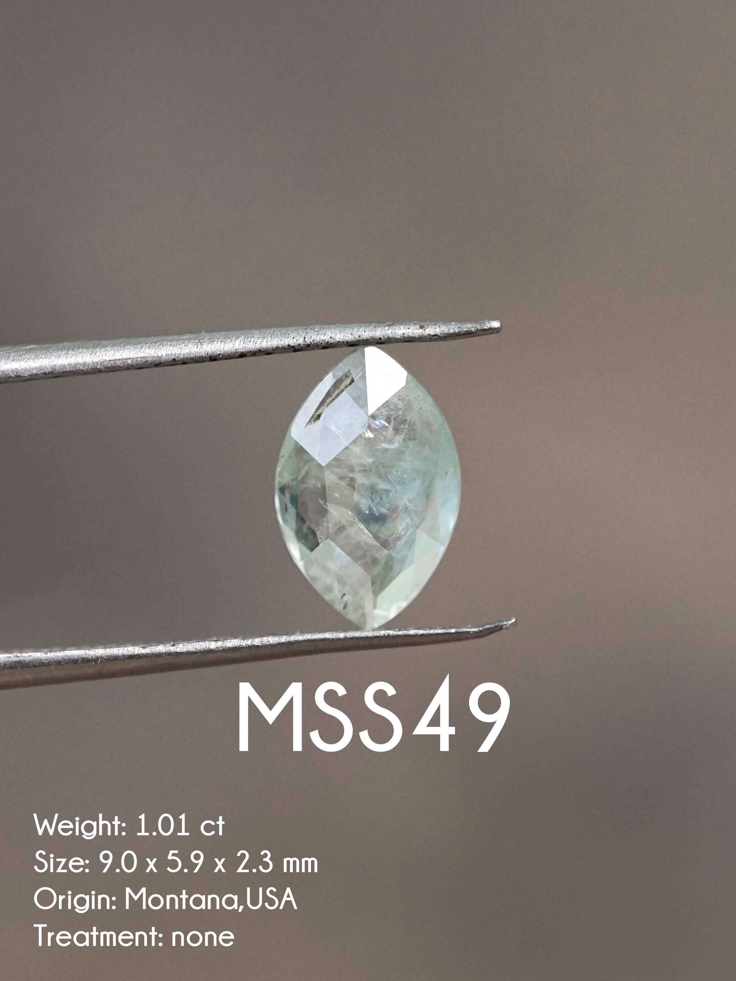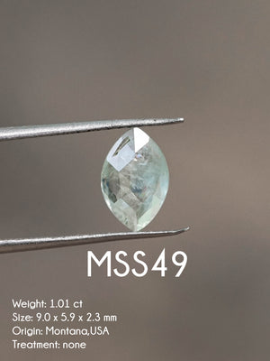 • MSS26 - 0.99 ct, measures 7.6 x 6.3 x 2.2 mm, almost a light, milky aquamarine in color, this sapphires is dreamy and whimsically wistful.