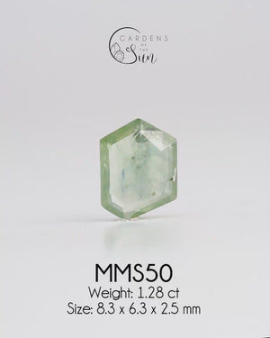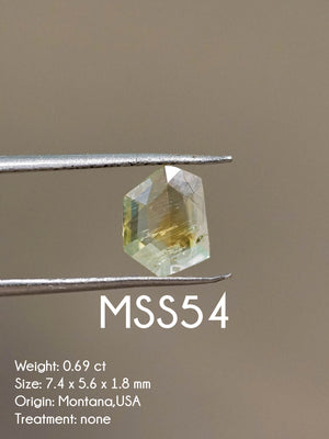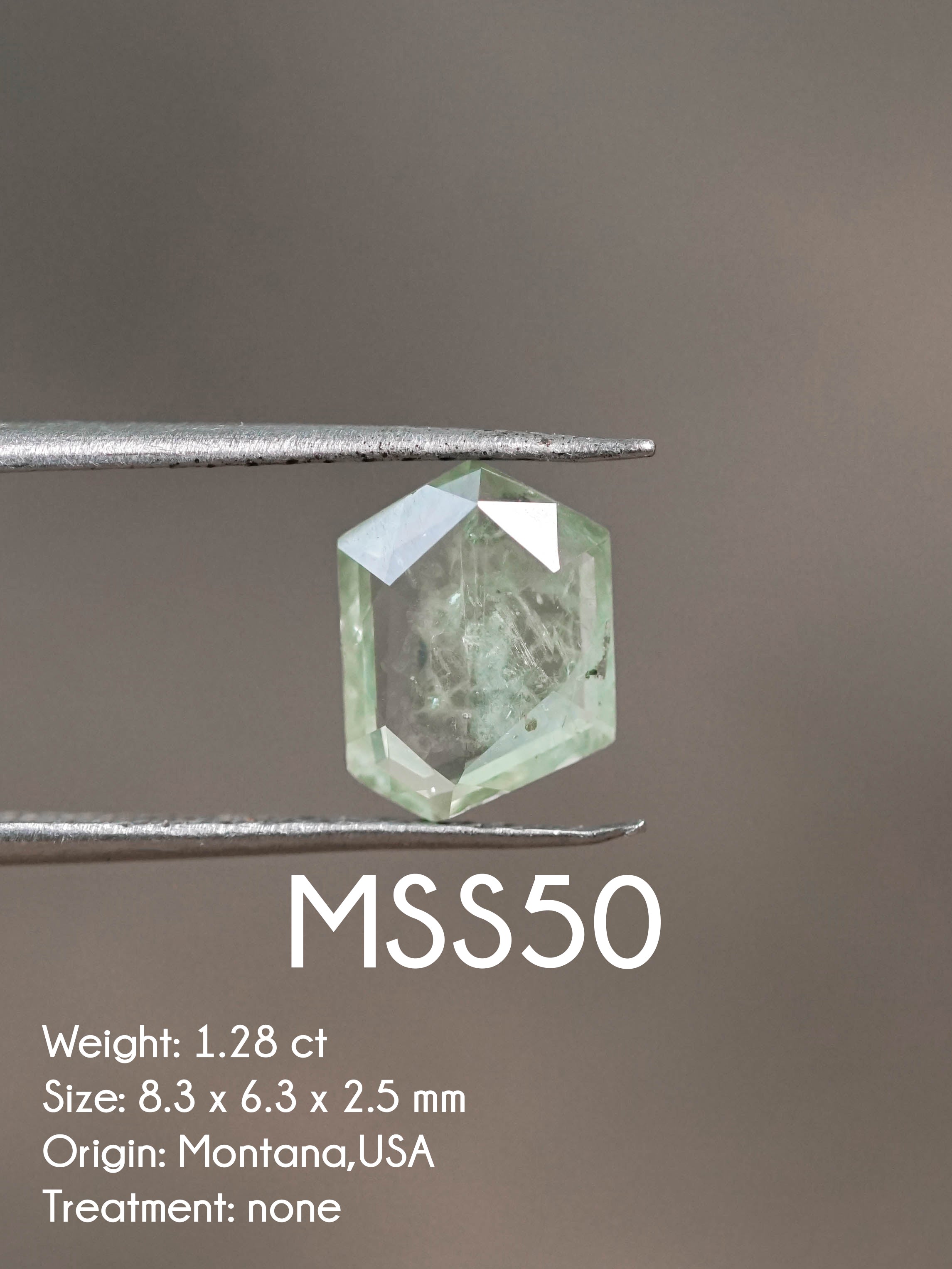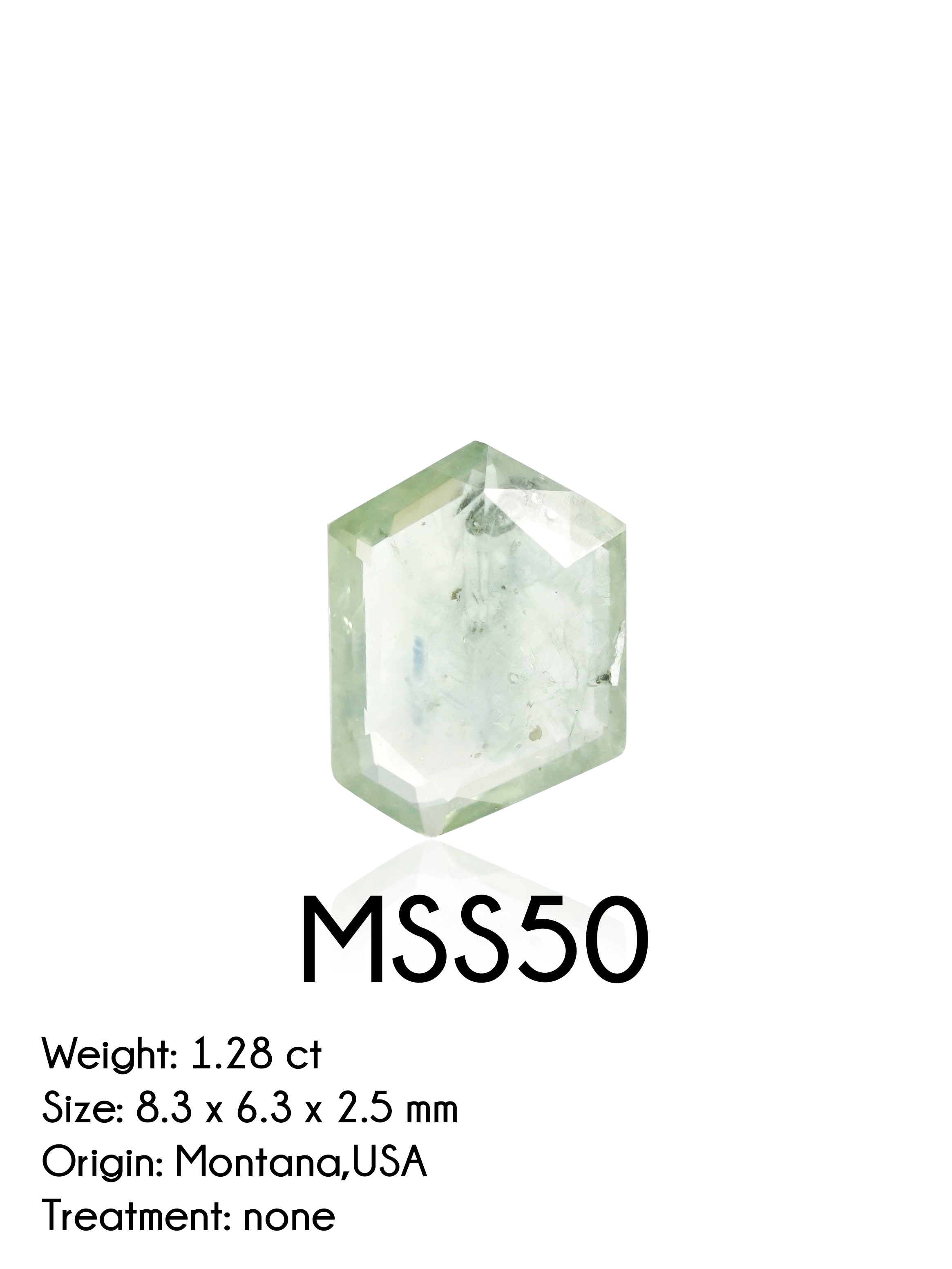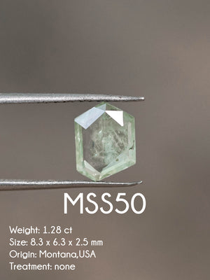 • MSS50 - 1.28 ct asymmetric hexagon cut green Montana sapphire. Mined in Dry Cottonwood Creek, Montana. Heated for color. Cut in Bangkok, Thailand. Measures 8.3 x 6.3 x 2.5 mm.