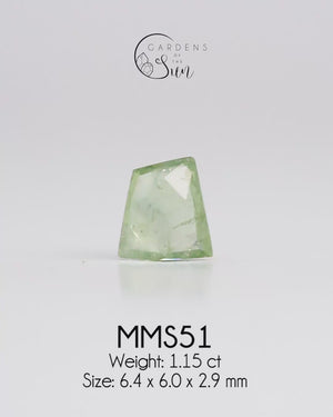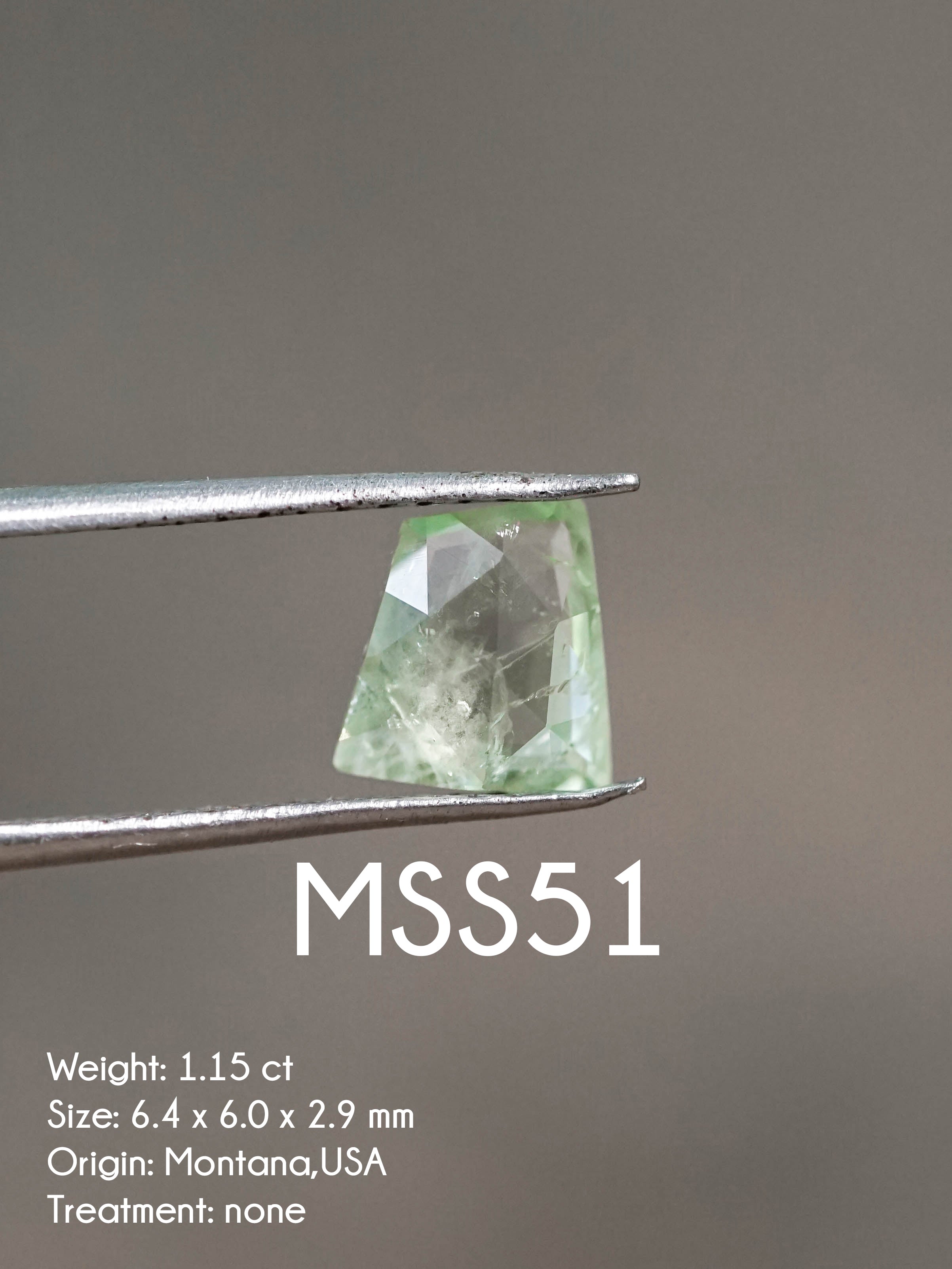 • MSS51 - 1.15 ct geo cut green Montana sapphire. Mined in Dry Cottonwood Creek, Montana. Heated for color. Cut in Bangkok, Thailand. Measures 6.4 x 6.0 x 2.9 mm.