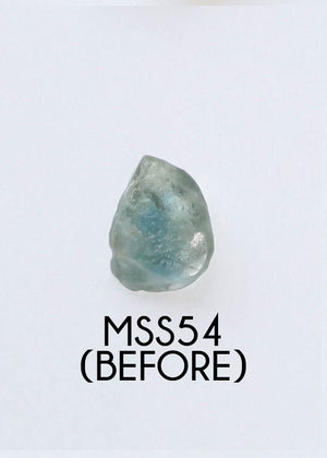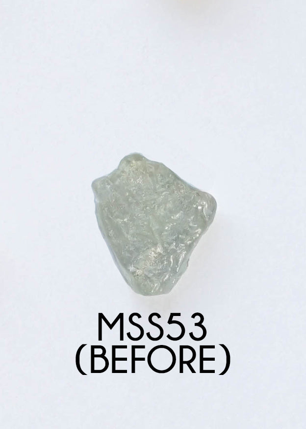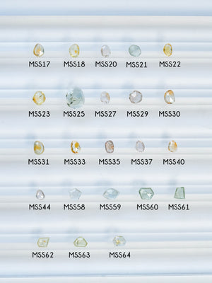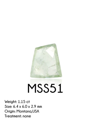 • MSS25 - 2.64 ct, measures 11.5 x 9.9 x 2 mm, the biggest sapphire in this collection, this blueish green colored gem captures clouds, and preserves memories.