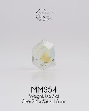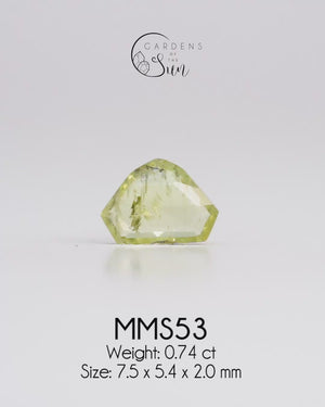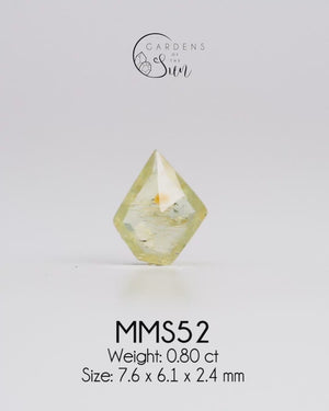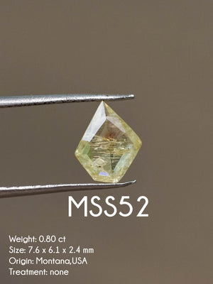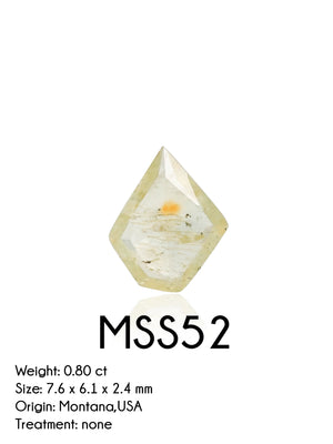 • MSS52 - 0.80 ct yellow rose cut Montana sapphire. Included. This geo cut combined with its pastel yellow make it entirely unique. Mined in Dry Cottonwood Creek, Montana. Heated for color. Cut in Bangkok, Thailand. Measures 7.6 x 6.1 x 2.4 mm.