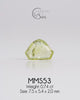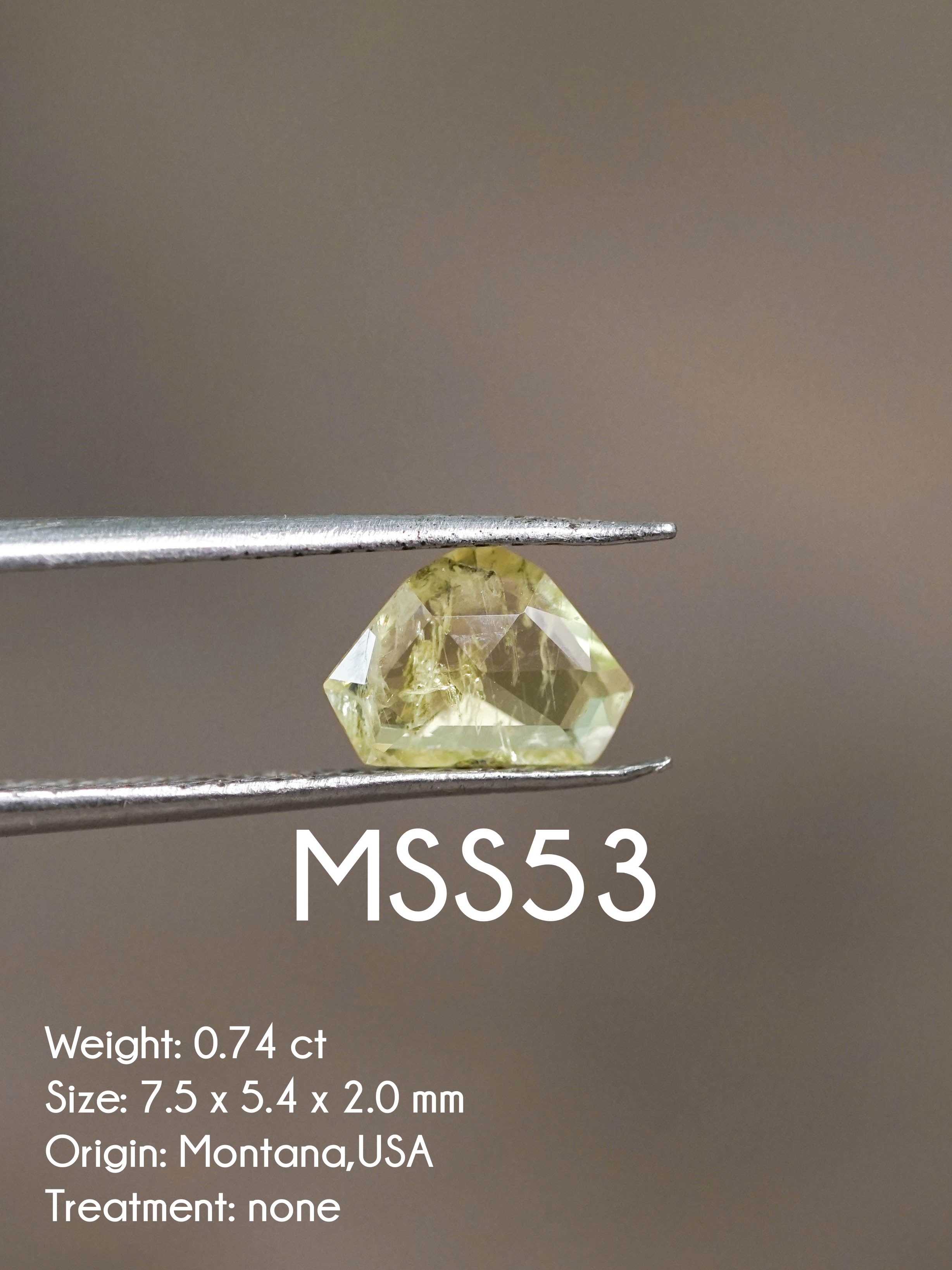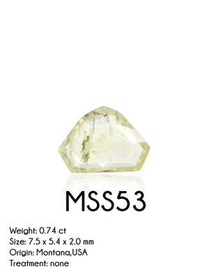 • MSS53 - 0.74 ct shield cut Montana sapphire. Included, yellow color. Mined in Dry Cottonwood Creek, Montana. Heated for color. Cut in Bangkok, Thailand. Measures 7.5 x 5.4 x 2.0 mm.
