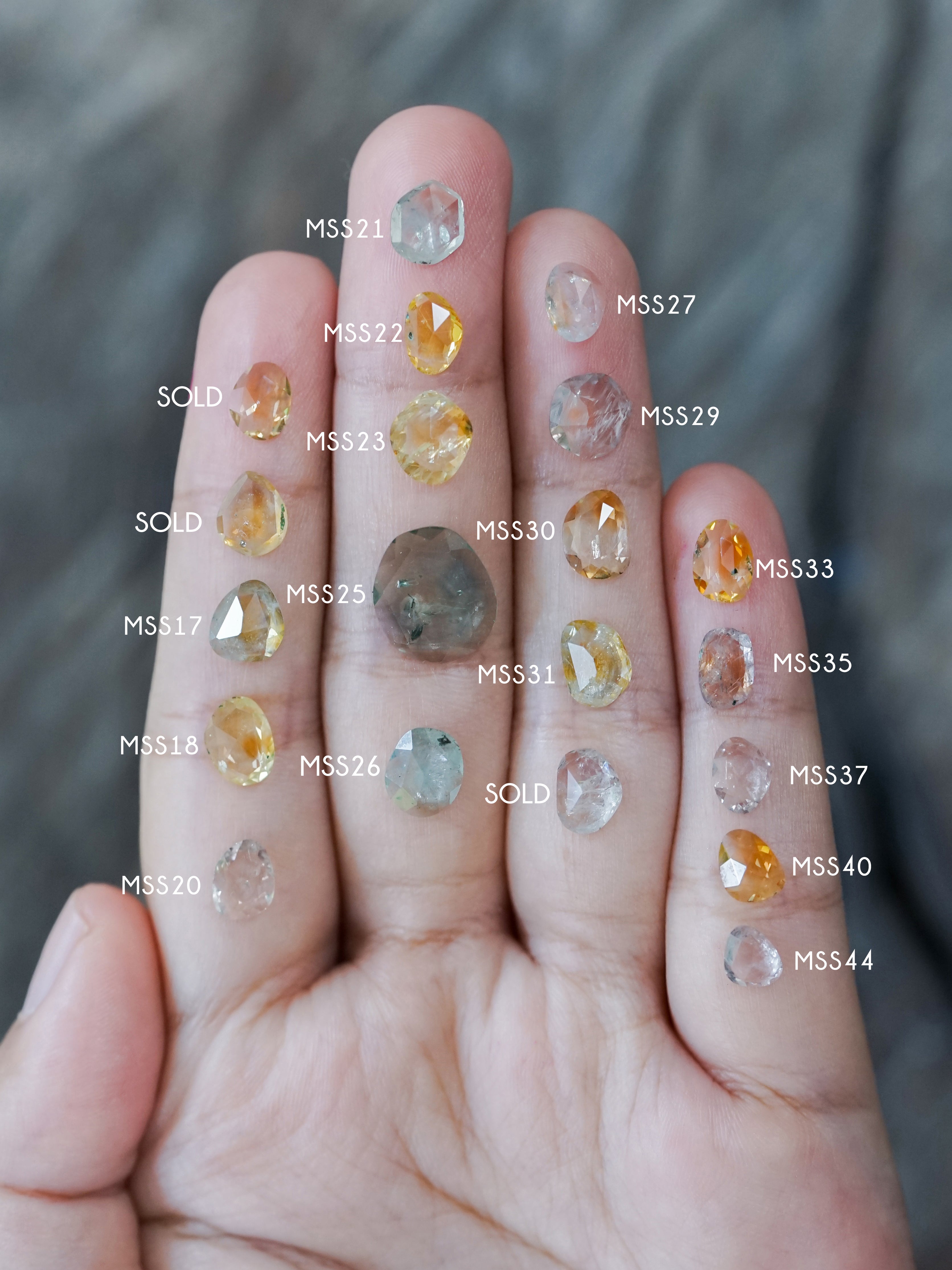 • MSS17 - 1.03 ct, measures 7.2 x 6.1 x 2.8 mm, constantly transitioning from clear to yellow, generously sprinkled with salt.