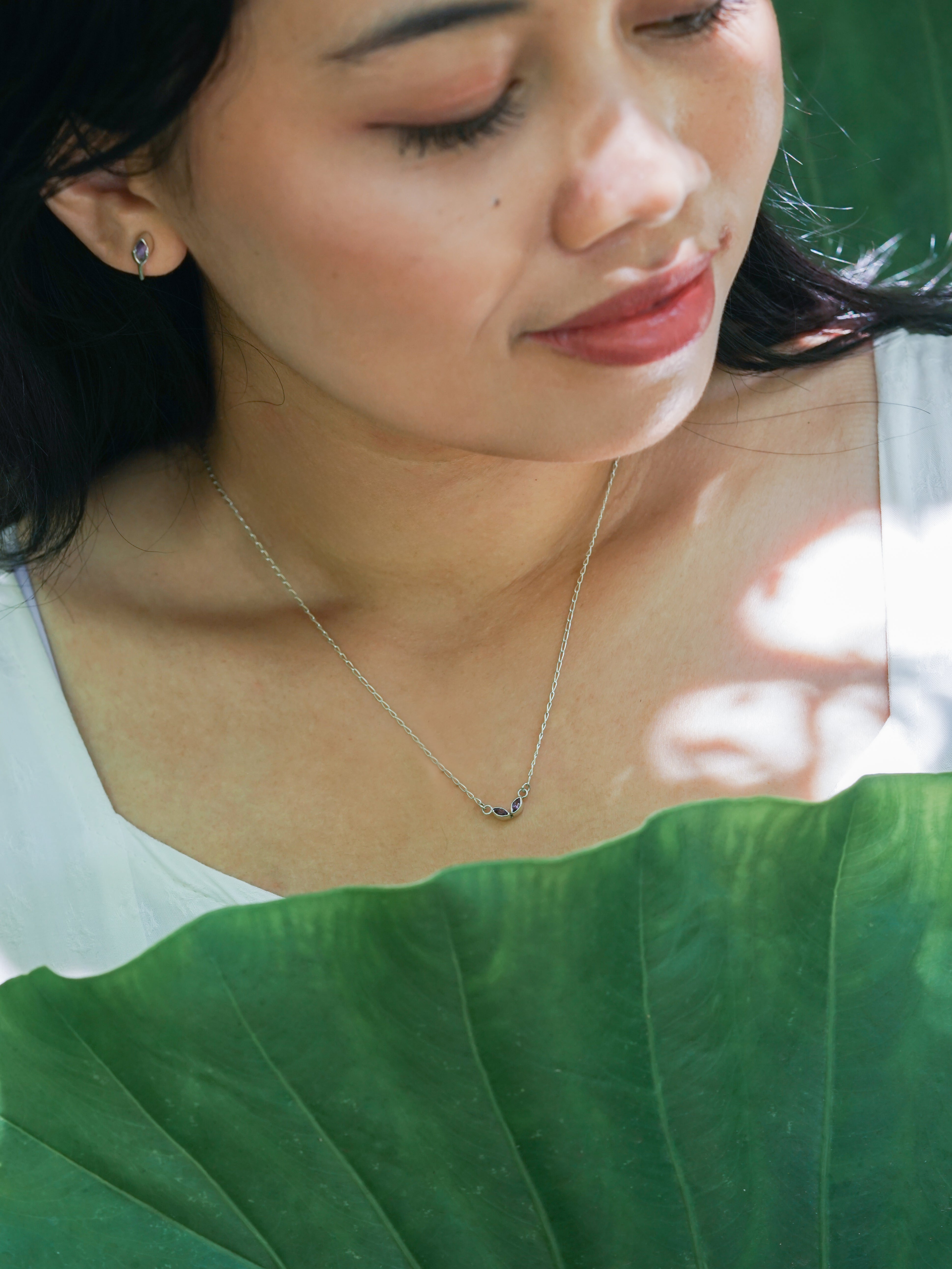 This marquise amethyst necklace in silver layers easily and wears close to the skin. Two stones, one direction. A clear mind resting against your pulse.