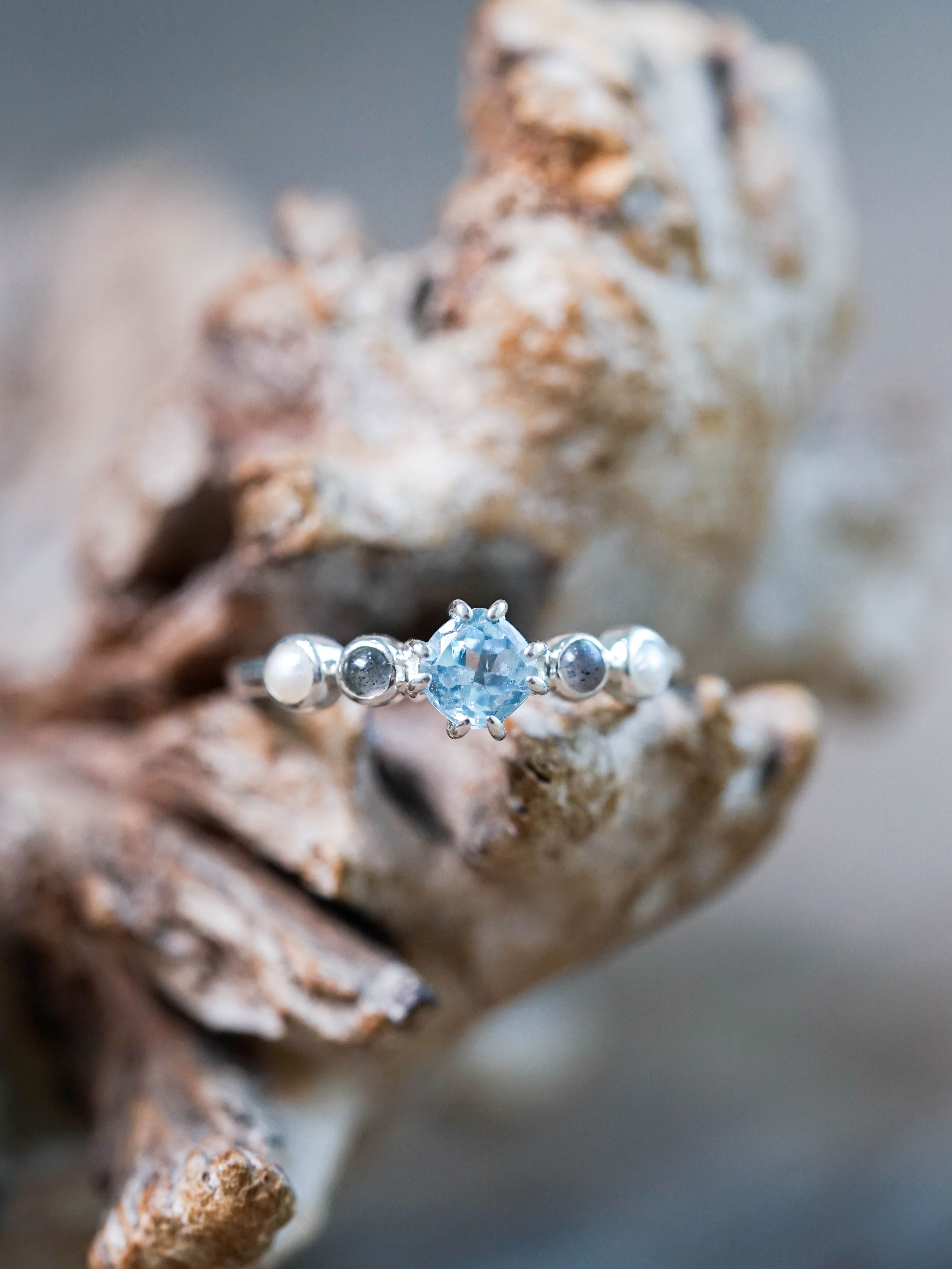 The Topaz, Labradorite and Pearl Ring holds space for what love really looks like. Not perfect, but powerful. An engagement ring that honors devotion in all its forms: the calm, the storms and everything in between.