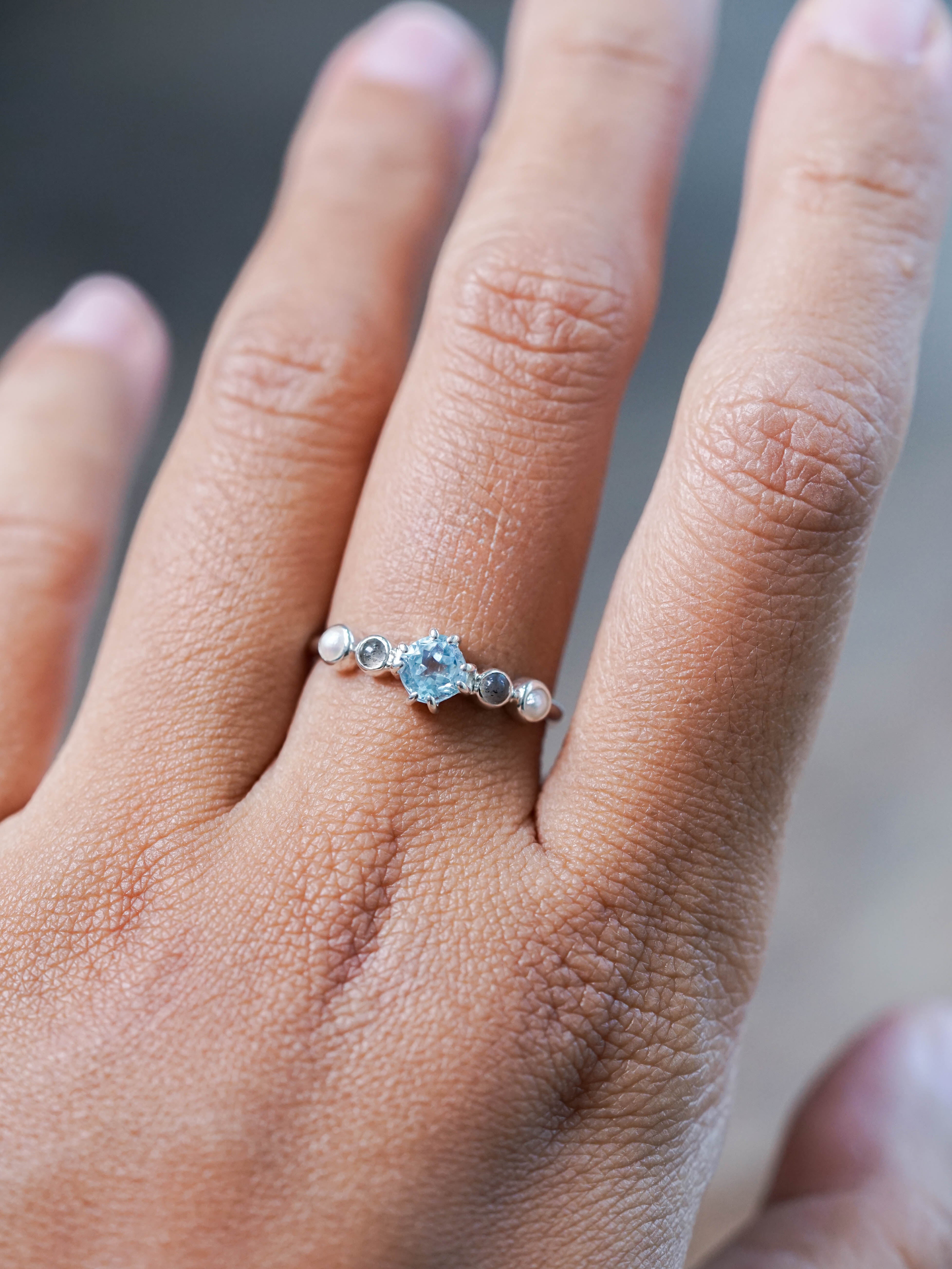 Five gemstones in total, all set in recycled sterling silver. The vibrant blue cushion cut topaz sits at the center with double prongs. A pearl and a labradorite hold space beside it, flanked by two soft accent stones.