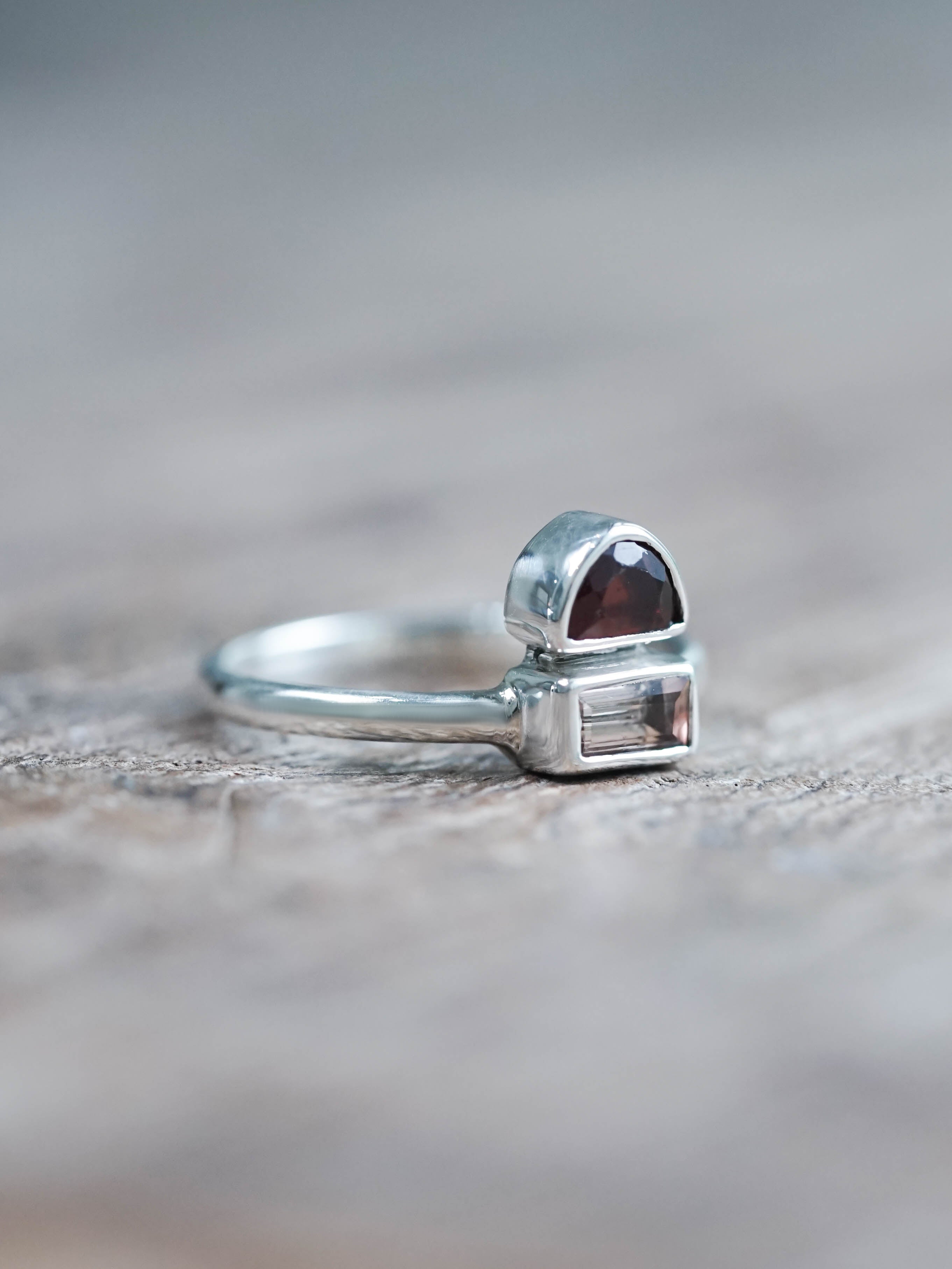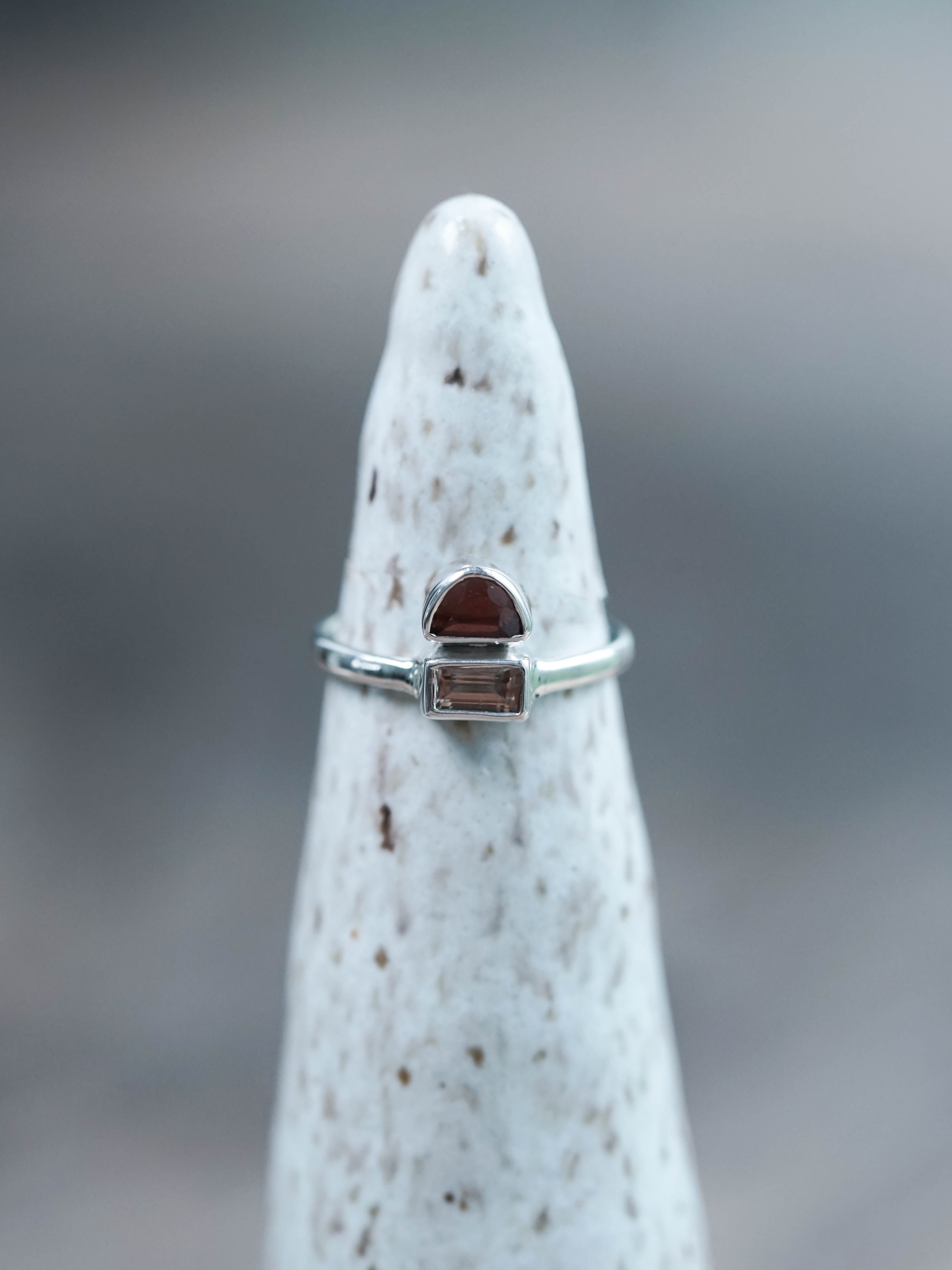 The tourmaline and Garnet Ring in Silver stacks a baguette cut pink tourmaline on the bottom and a red garnet from Odisha, India. The half moon garnet sits on top with its flat edge, so the whole thing rounds off at the top like a tiny, wearable punctuation mark. Both stones are bezel set in recycled sterling silver.