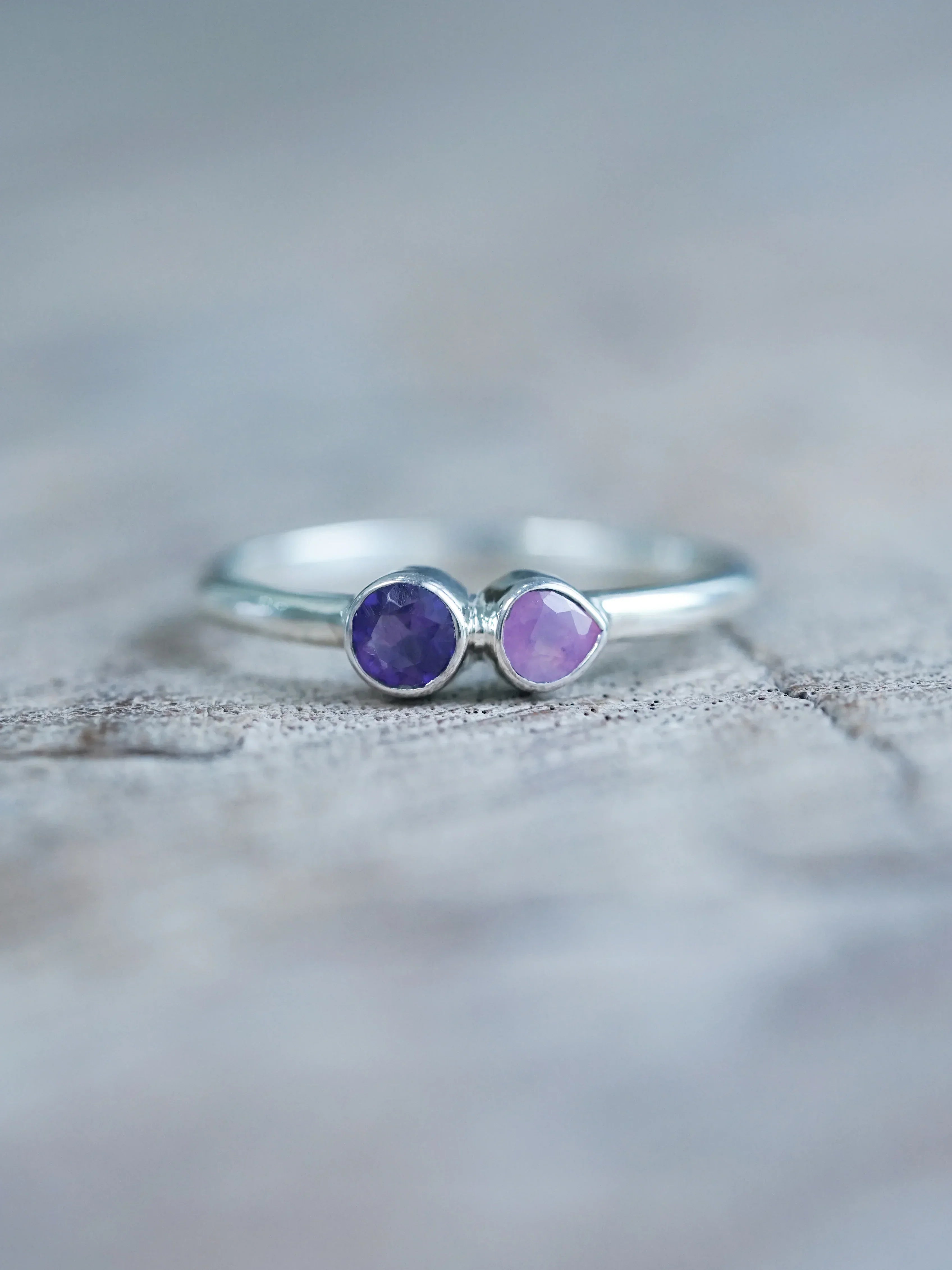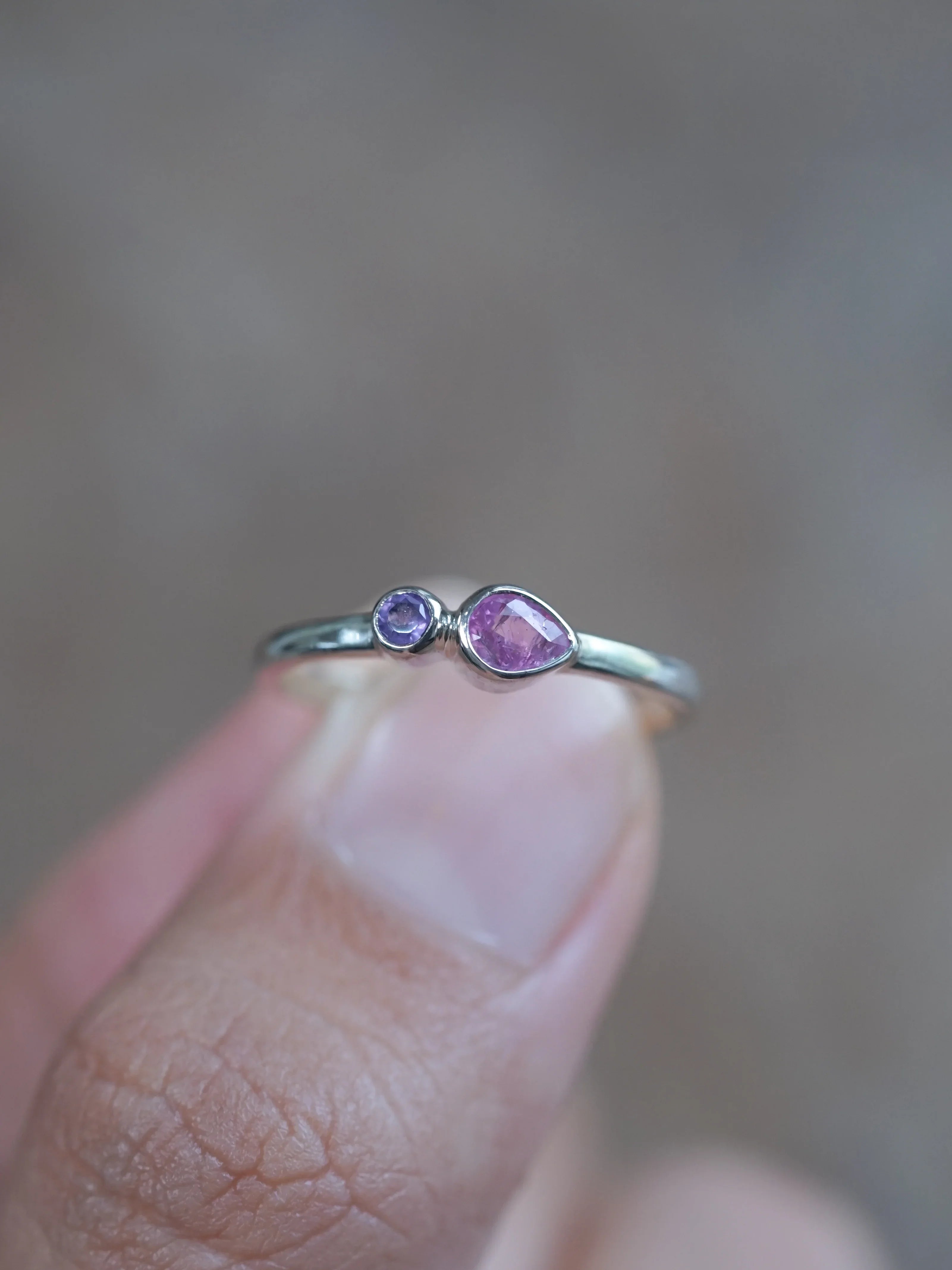 The Pink Sapphire and Amethyst Ring holds emotion and judgment in the same breath. The pear cut pink sapphire leads with instinct and heat, while the round amethyst answers with focus and restraint. You feel the tension between them the moment you look down at your hand. One pulls from the heart and one steadies the mind. Together they ask you to want something and choose it wisely.