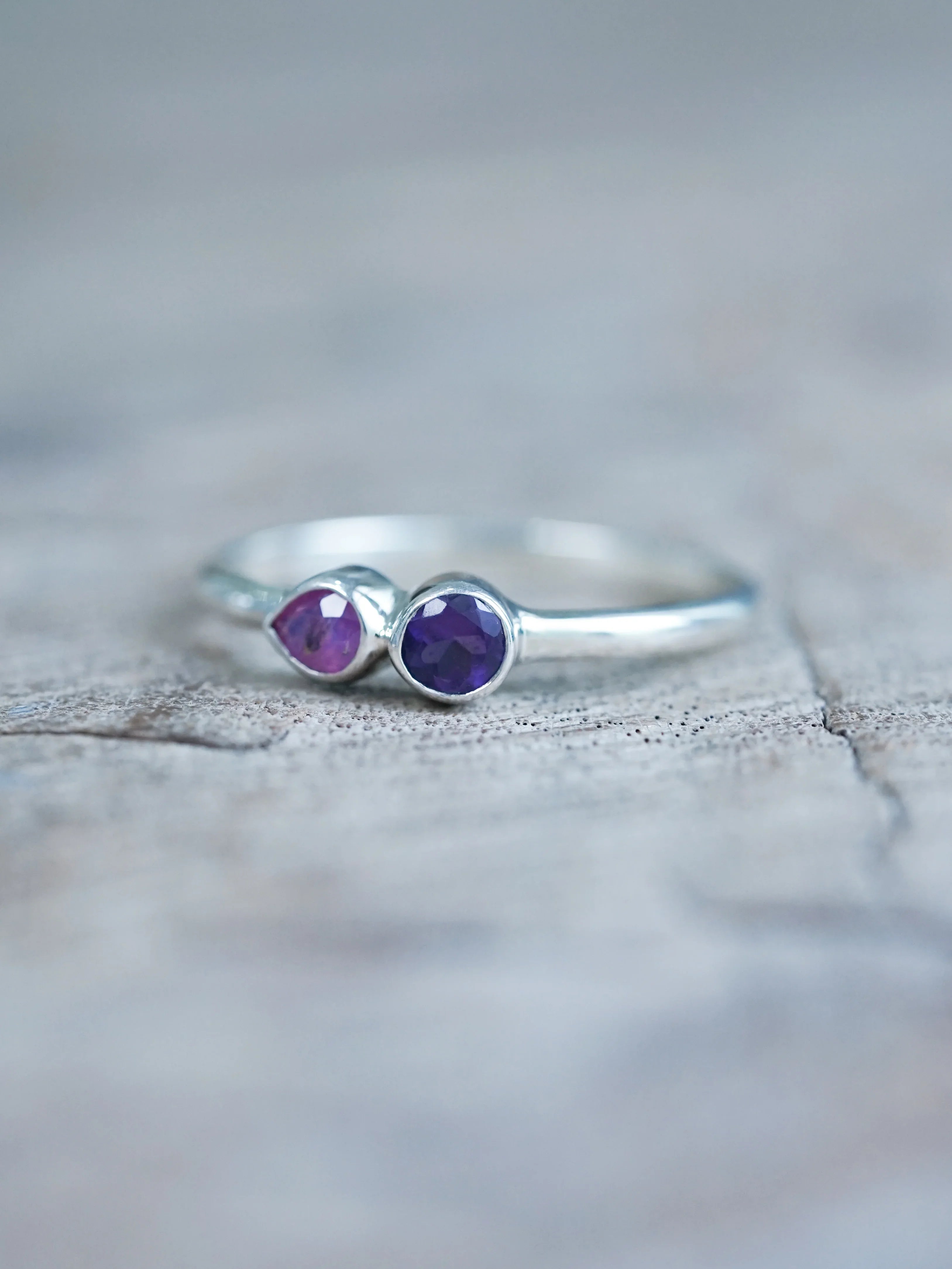 Wear your Pink Sapphire and Amethyst Ring with our Mermaid Gemstone Earring Bundle to layer rich purples and pink tones for a confidently maximalist look.