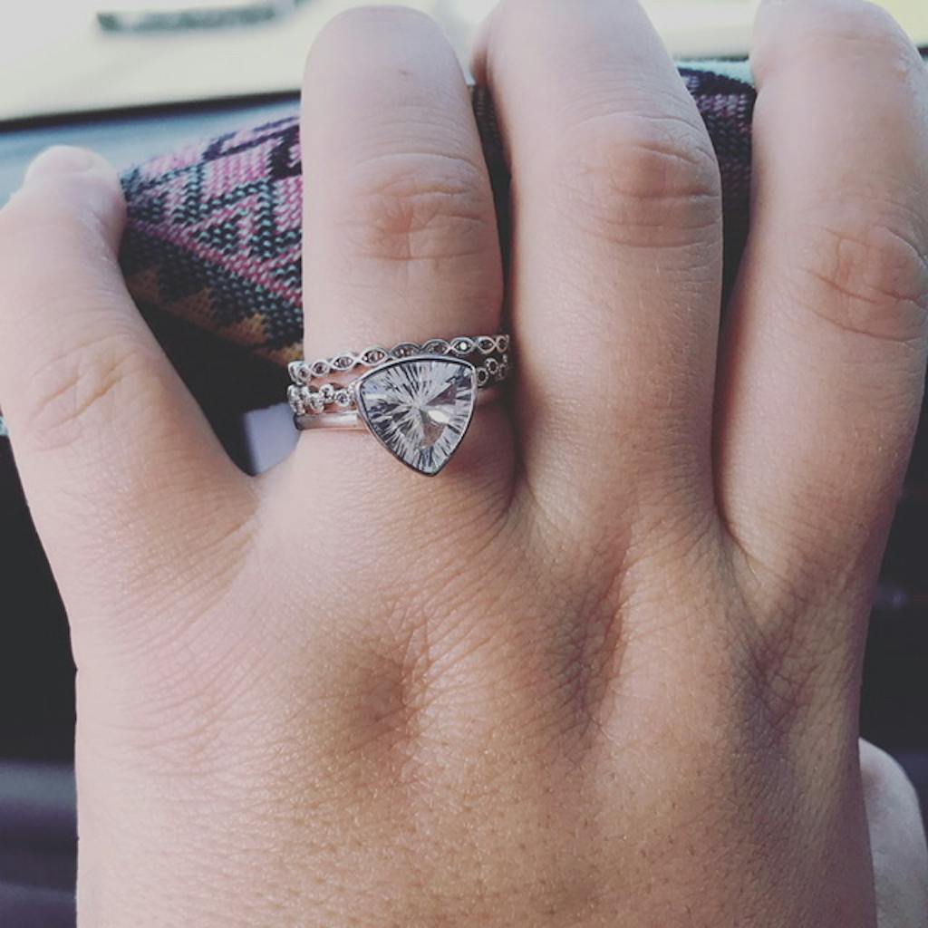 Add a touch of whimsy to your look by pairing it with triangle white topaz earrings. This ring can also be given and worn as a placeholder ring or stand-in ring for your engagement ring.