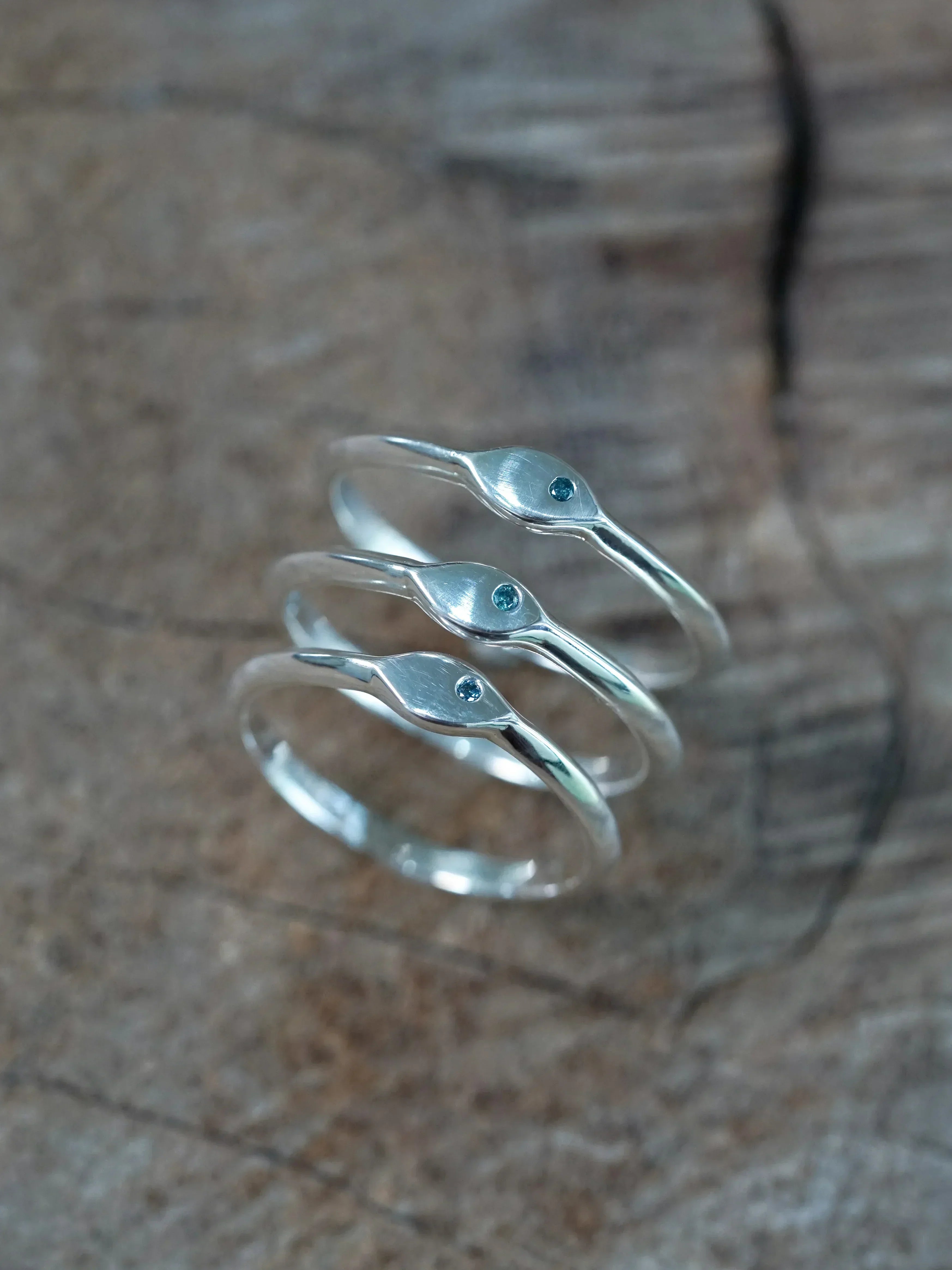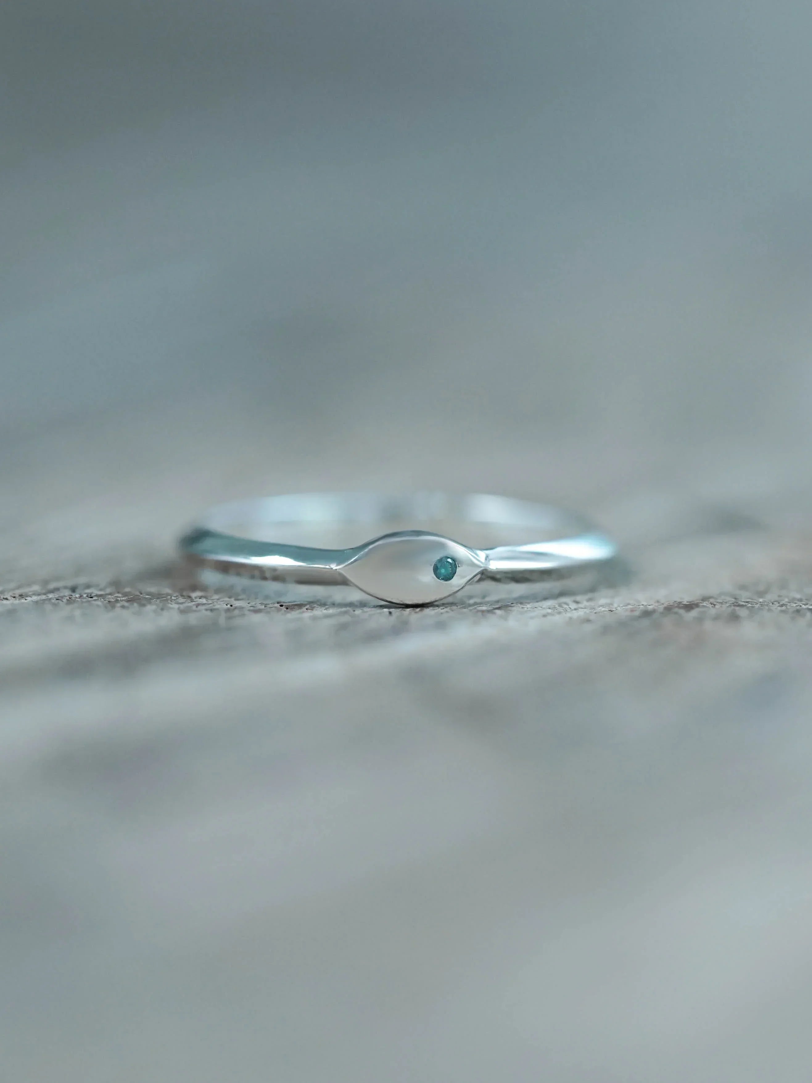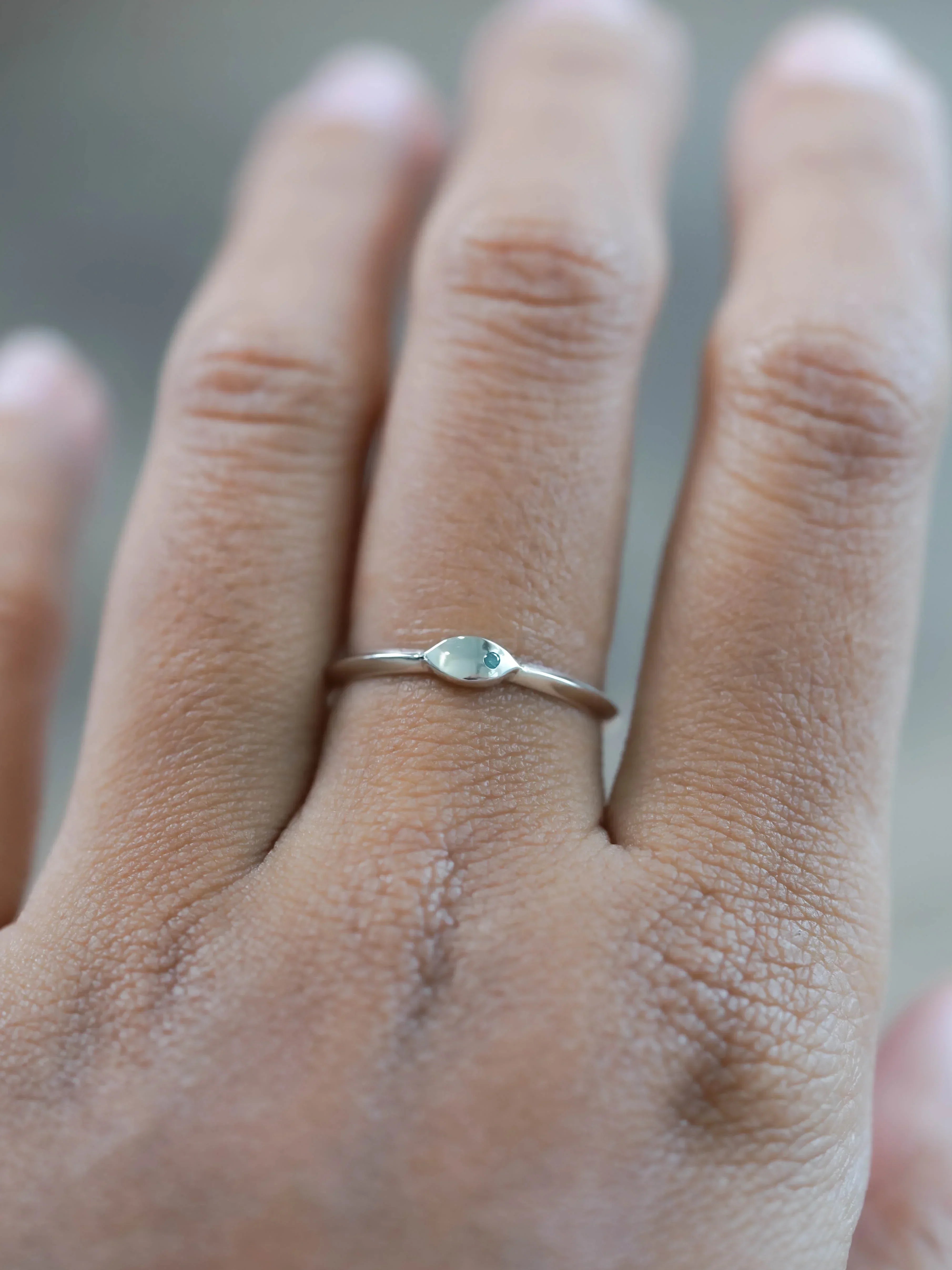 A tiny blue diamond sits flush in a marquise signet ring top, set in recycled sterling silver. The band tapers into a knife edge that runs all the way around. It feels lean and deliberate. A small blue diamond ring with presence. A minimalist blue diamond ring that still holds its ground. An everyday signet ring you reach for without thinking.
