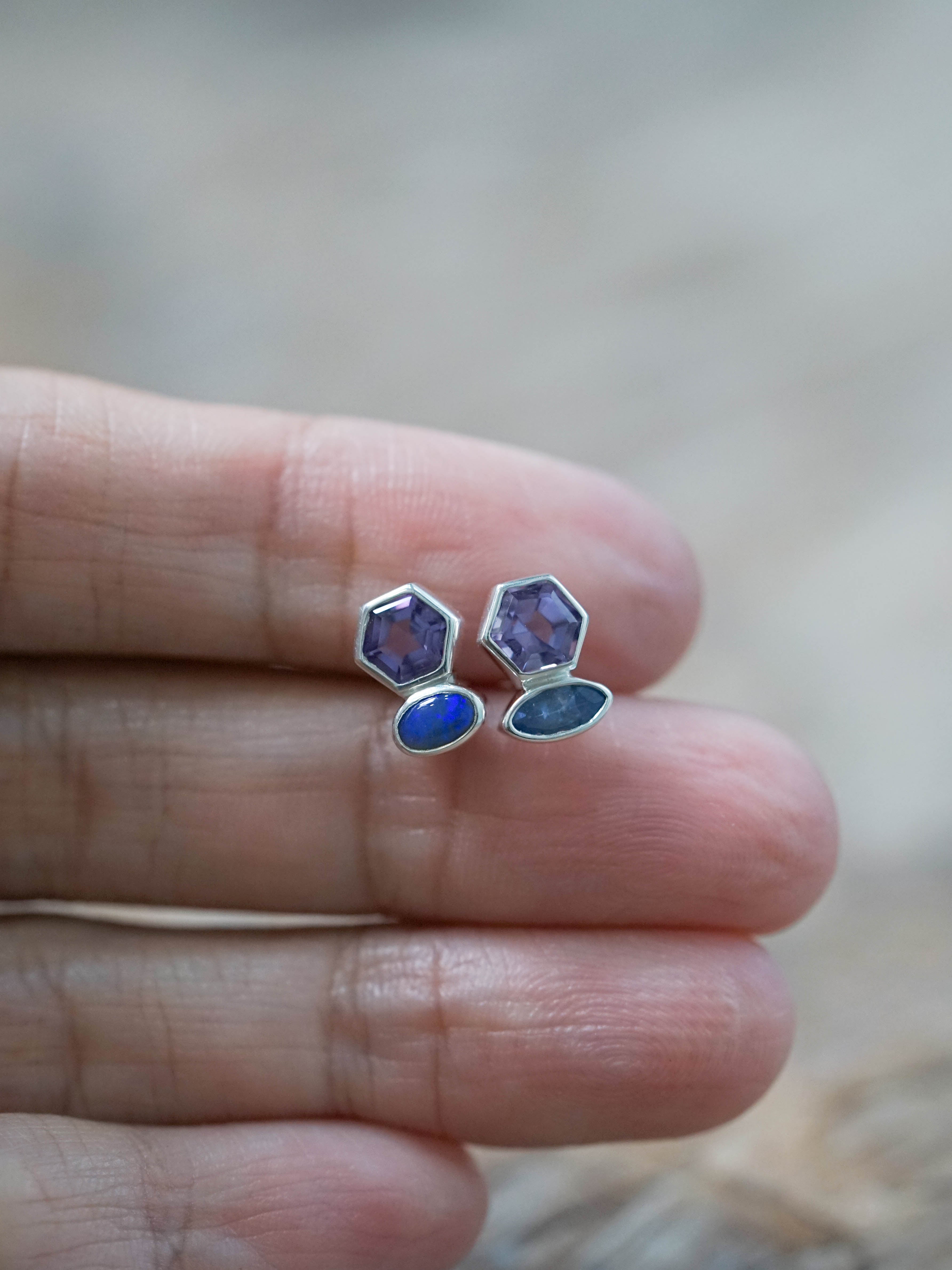 A cluster of purple gemstone earrings. A hexagon cut amethyst from Brazil brings clarity and creative flow. A marquise tanzanite from Tanzania adds dreamlike energy and inner vision. An oval opal from Australia flickers with color, reminding you to stay soft, curious and open to surprise.
