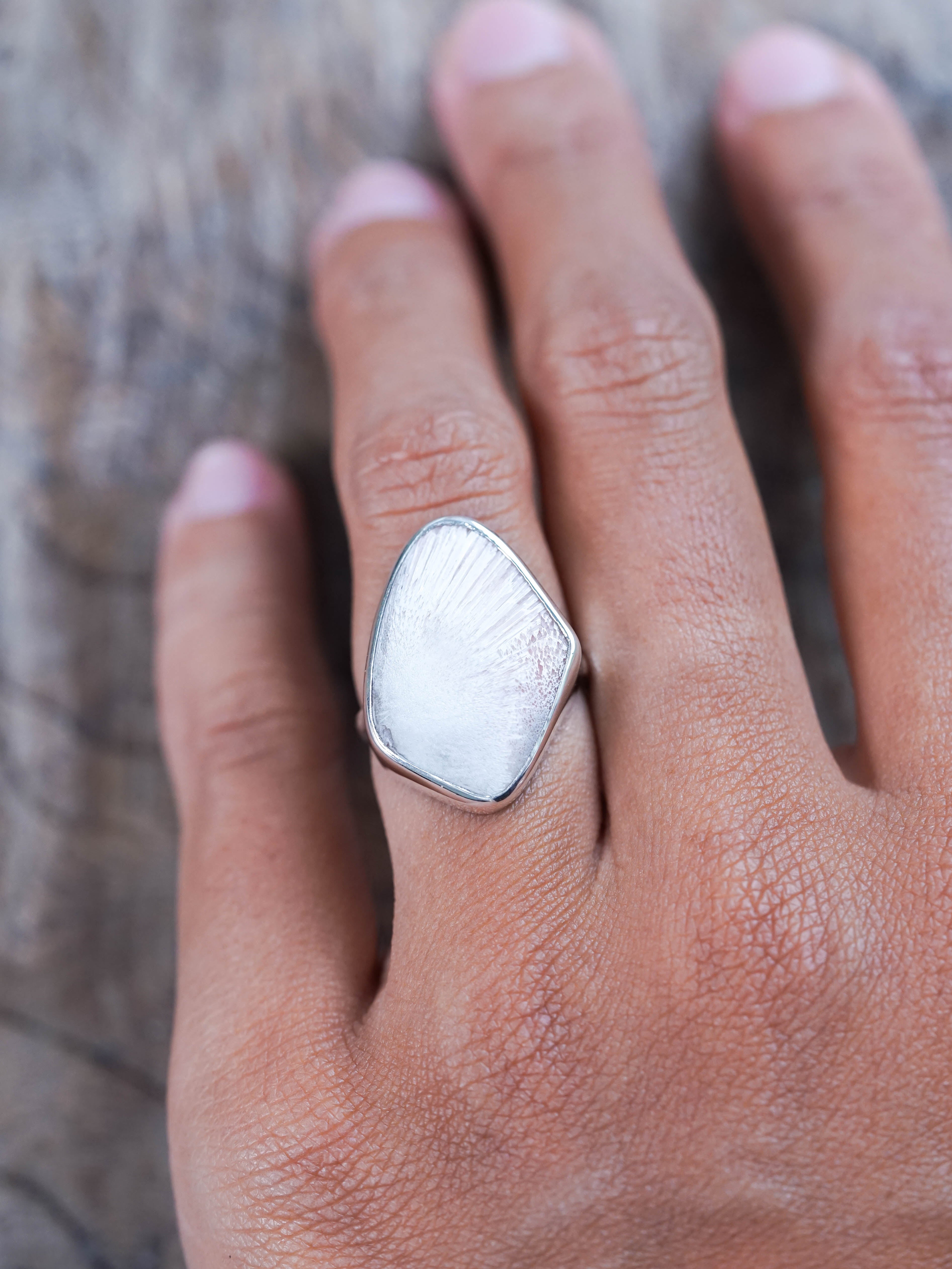 The large, freeform cabochon cut makes for a cocktail ring that doesn’t need sparkle to stand out. Just light, softness, and the quiet kind of strength that moves mountains without force.