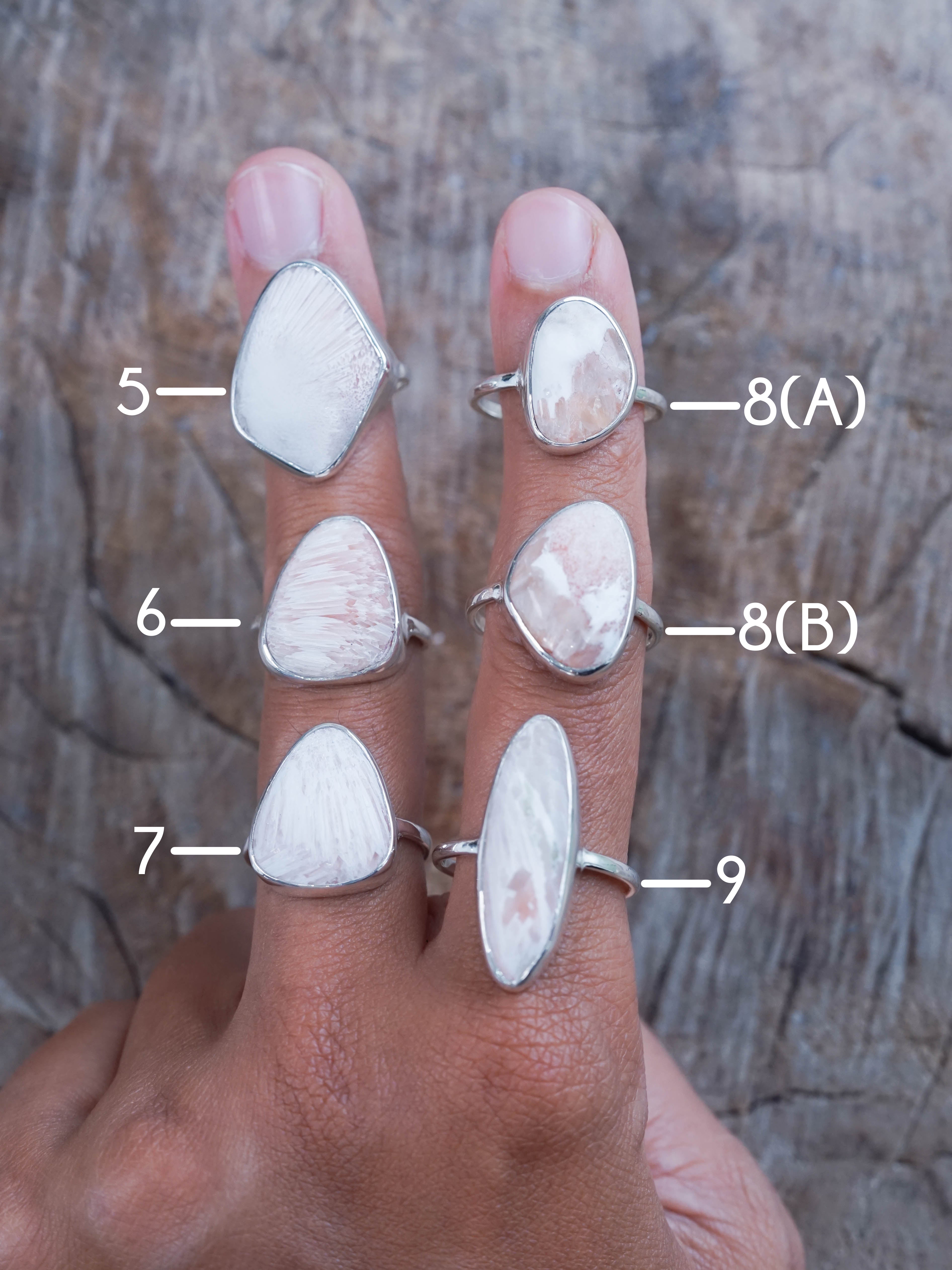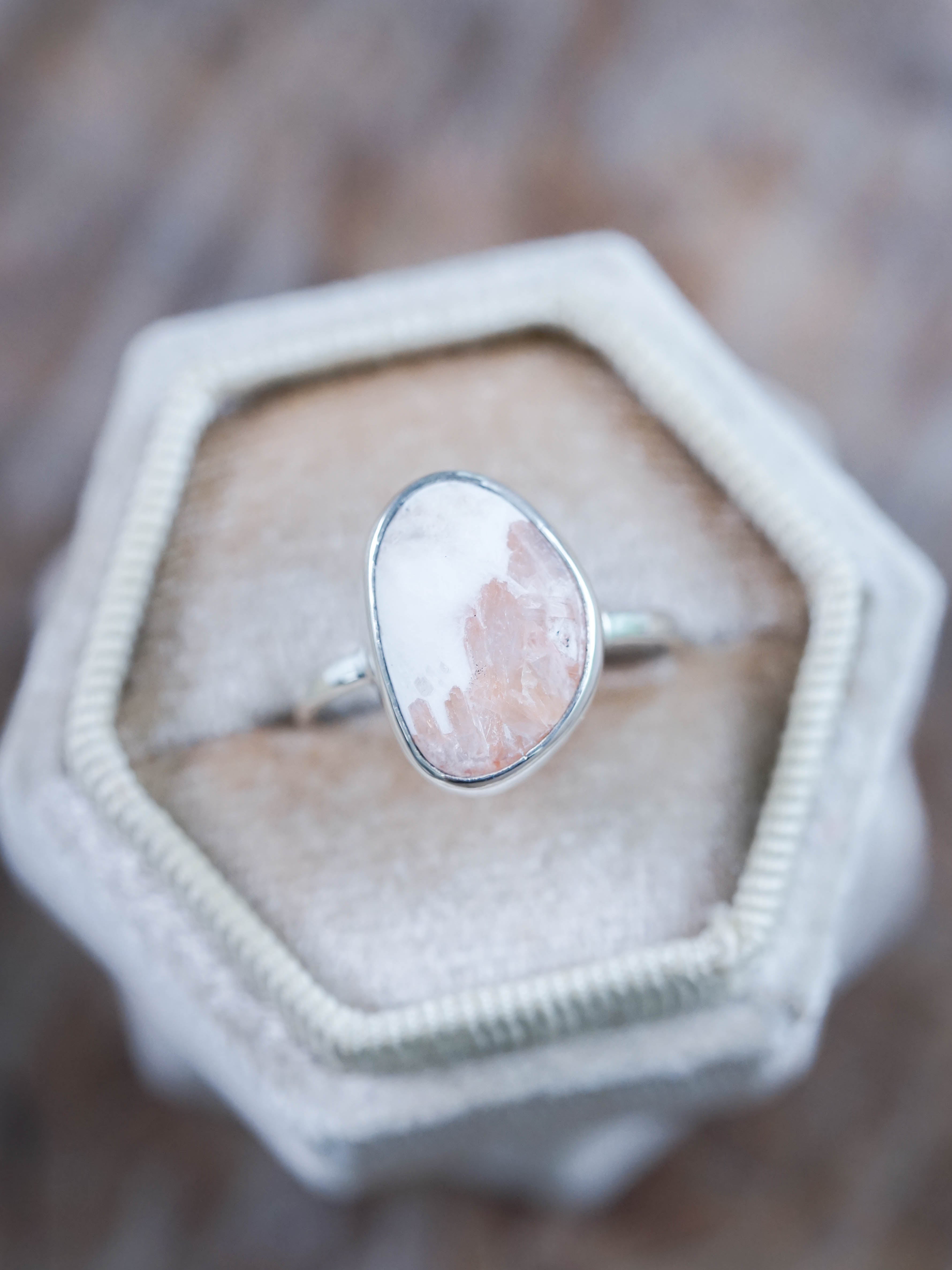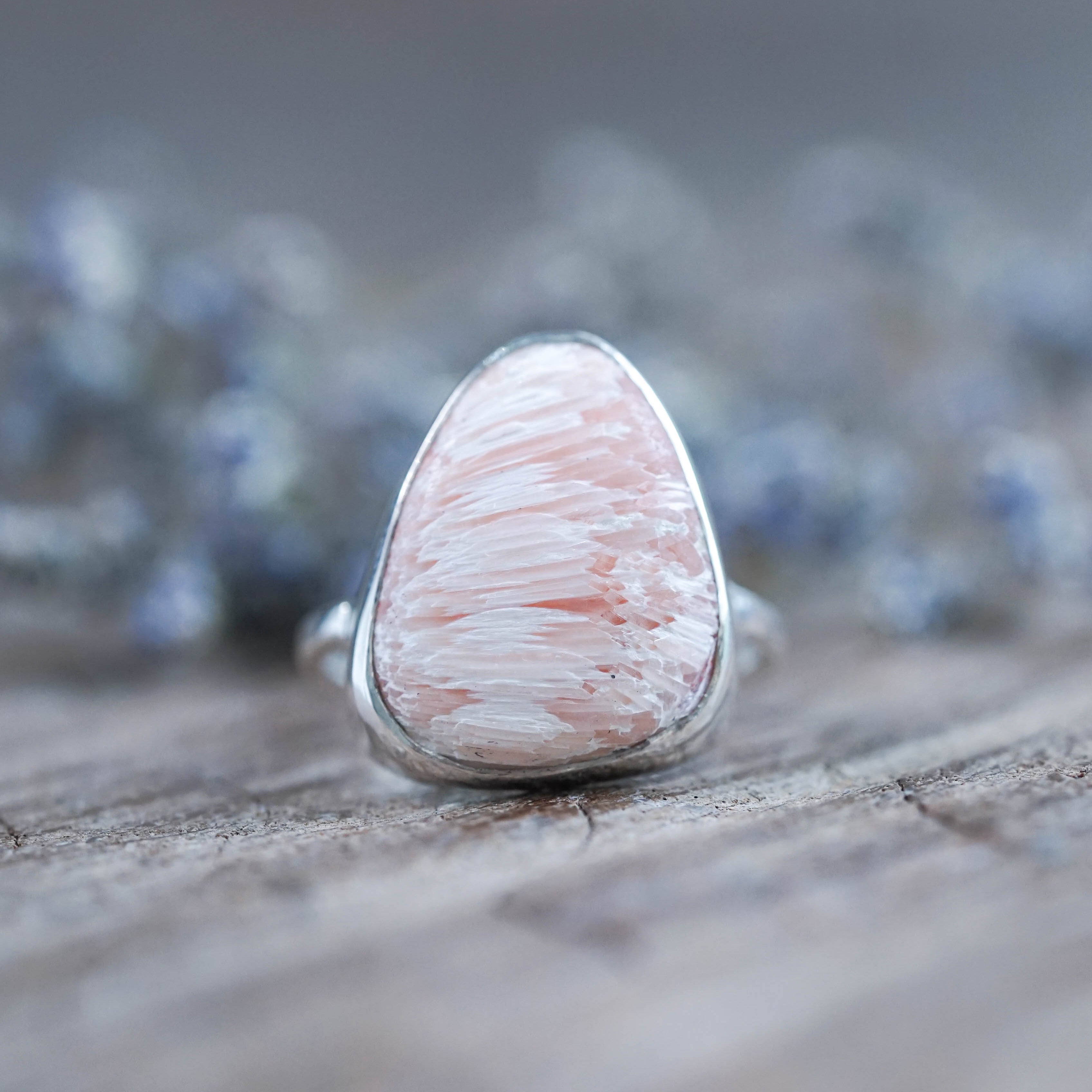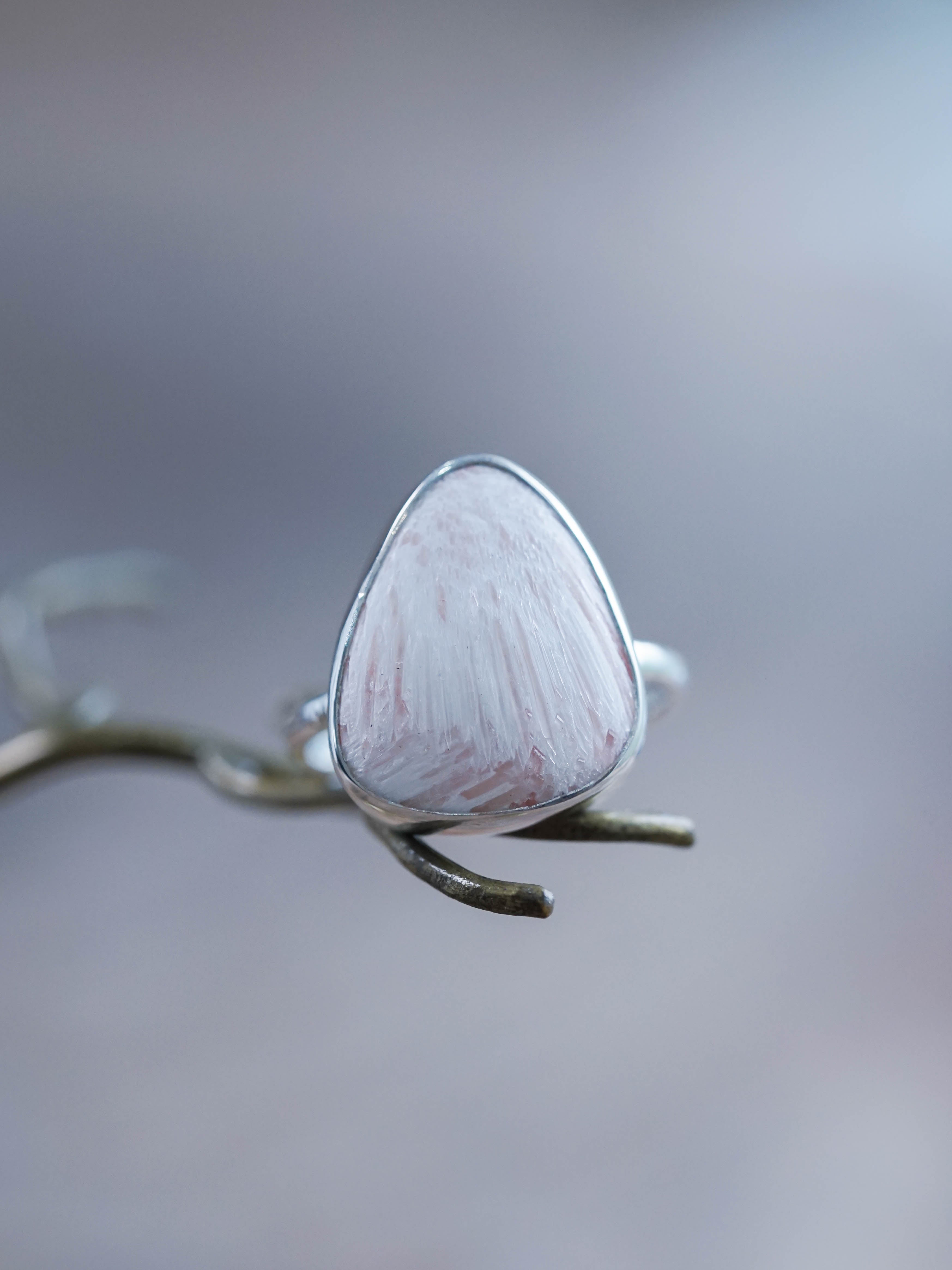 The Scolecite Ring feels like a deep exhale. A soft, peach salmon stone with wisps of white crystal needles frozen in motion, groups of them pointing in different directions, yet somehow all at peace.