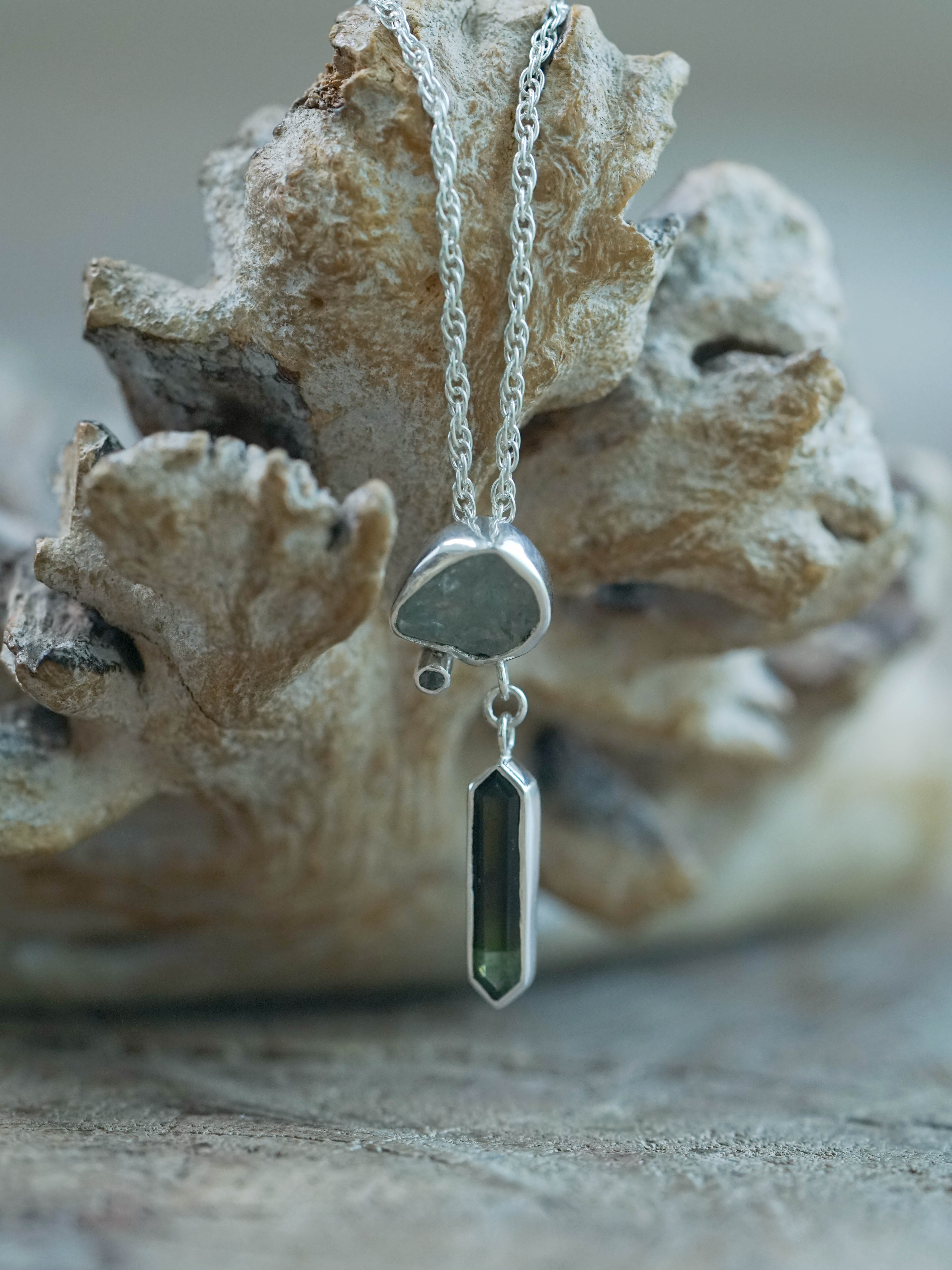 The Montana Sapphire and Tourmaline Necklace feels like a gasp of air after surfacing from the deep, when every nerve in your body lights up and the world rushes back in. Montana sapphire brings that brightness: truth, clarity, and the innocence of its pale sky blue. Tourmaline joins in as the protector, dark and grounding at first, then softening into olive, teal, and bottle green. Together they play between daring and tender, freedom and safety, innocence and edge.